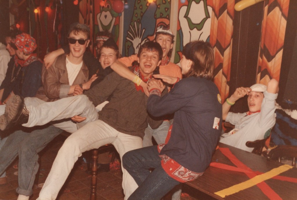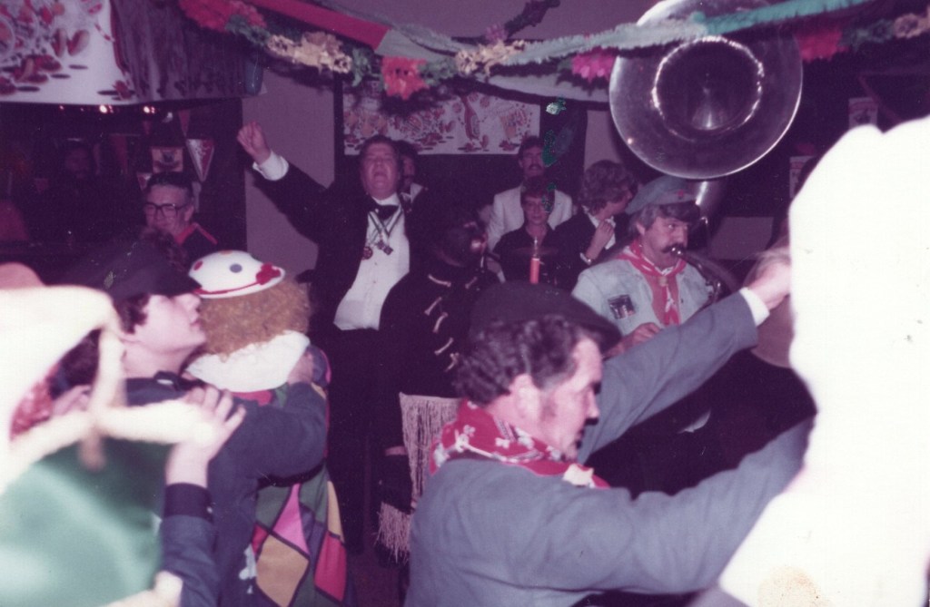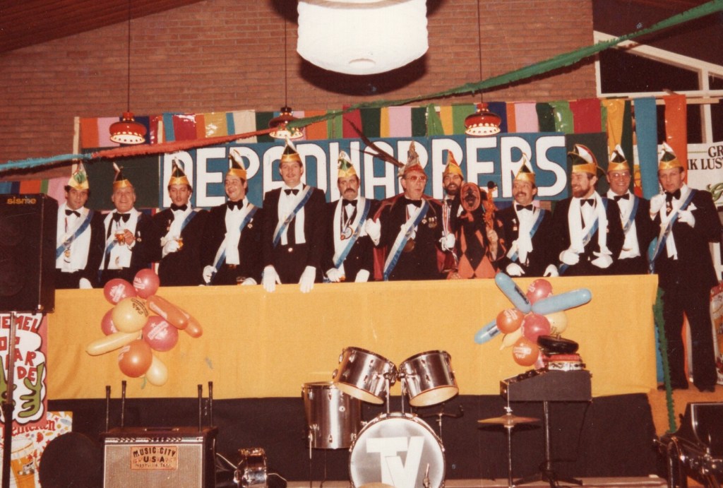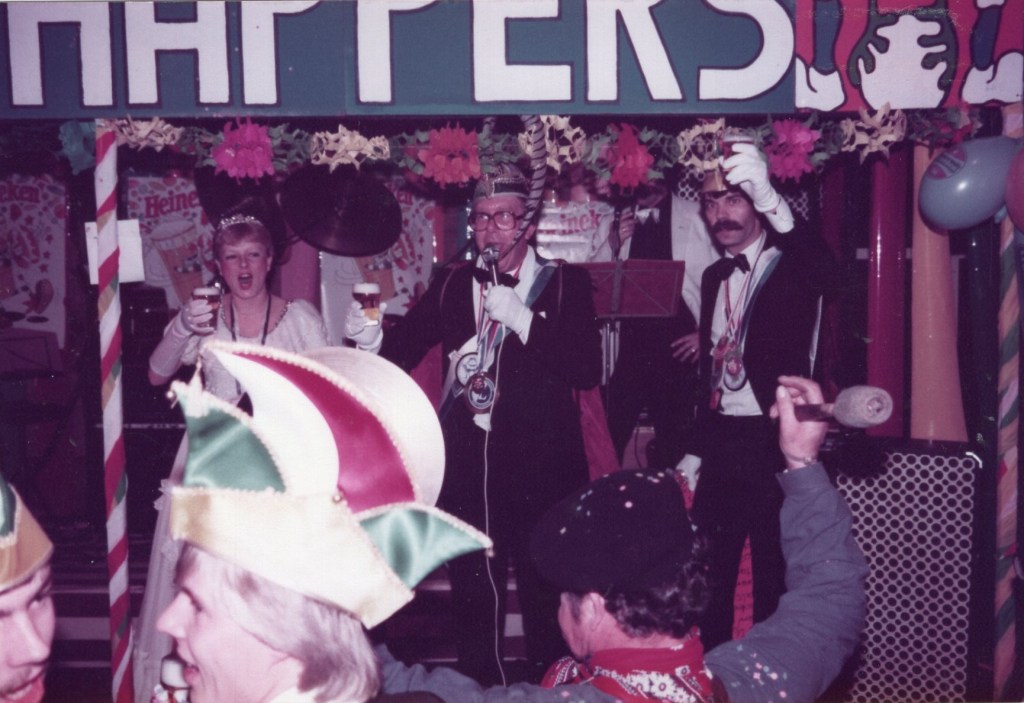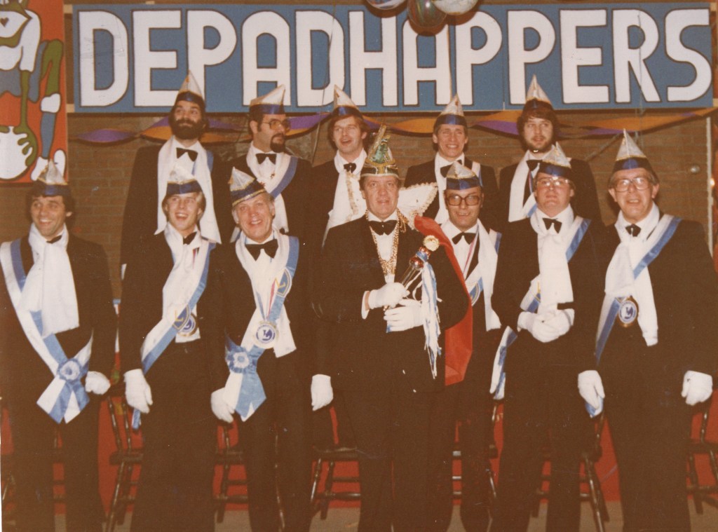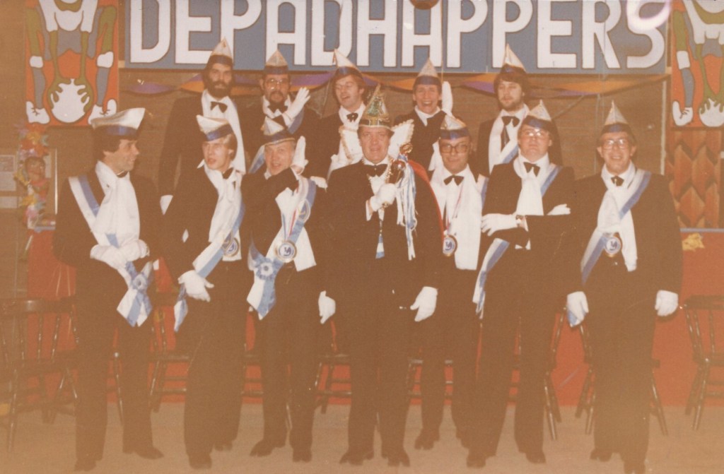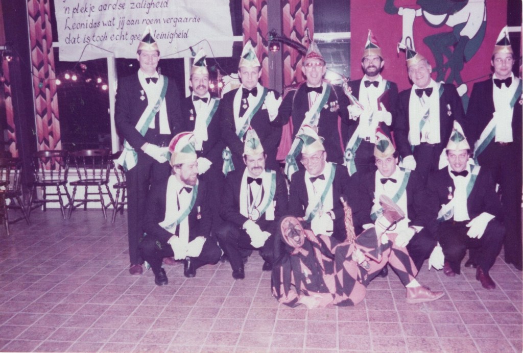 Prioriteit nummer één was natuurlijk het bij elkaar zoeken van een enigszins representatieve groep zotten die én lid waren van Leonidas én wel van een feestje hielden! U begrijpt: de eerste officiële Raad van Elf der Padhappers was snel geformeerd. Op de statiefoto van het eerste uur zijn o.a. Henk Peinemann te herkennen als de imposante Doorluchtige Dwaasheid Prins LEO 1 en Jan Martens als adjudant en verantwoordelijk voor de sponsors: “beste mensen, we moeten niet vergeten om tijdens de festiviteiten de naam van de Handyman te noemen”. Voorts ontwaren we Wim Hofland in de functie van orkestregelaar die er hoogstpersoonlijk voor zorgde dat wereldberoemde bands uit de regio en ver daarbuiten werden vastgelegd en dat zij naast hun gage ten hoogste twee consumpties per avond kregen. Een belangrijke functie was ook weggelegd voor Cor Hendriks. Dit raadslid zorgde er voor dat de contacten tussen de Padhappers en de bar altijd “soepel” verliepen. De overige raadsleden zorgden er hoogstpersoonlijk voor dat er inhoud werd gegeven aan de naam Padhapper! Een biertje happen aan het (Erasmus)pad stond immers garant voor de naamvoering. We herkennen onder andere Martin Roestenburg, Edward Hijzen, Ton Damen, Harry de Jong, Theo van den Berg, Robbie van Leeuwen, Frans Lauwrier, Peter Booms, allemaal dappere happers van het eerste en ook wel het tweede uur. In de navolgende jaren hebben nog vele Leonidassers acte de présence gegeven. Ik denk daarbij aan Frans Kofflard, Hans Hollander, Menno Bosma, Marien van den Berg, Paul Blanc, Piet de Bie, André de Hoog, Aad Grootveld, Ton Wouters, Ron van Kan, Victor Holleman en vele, vele anderen