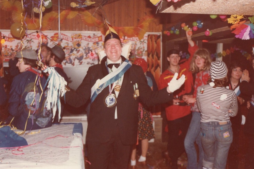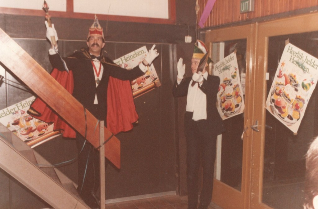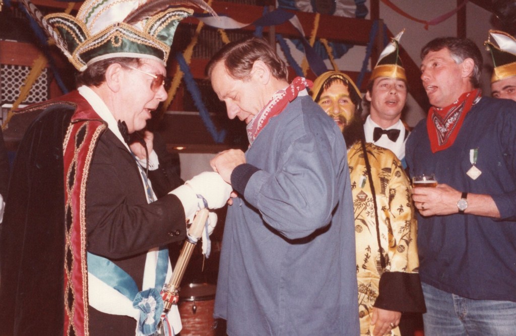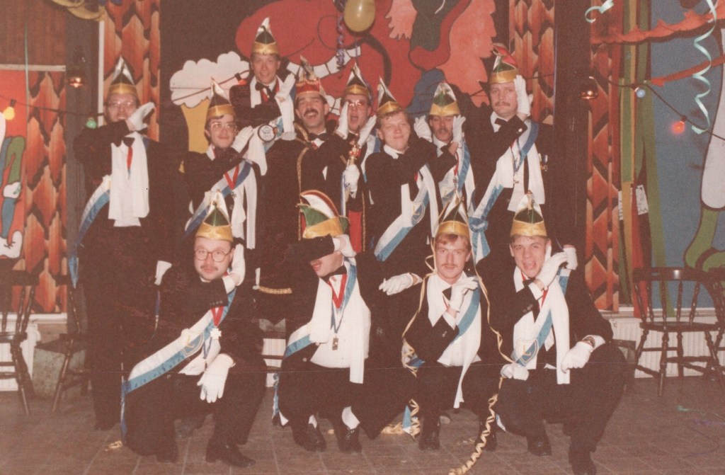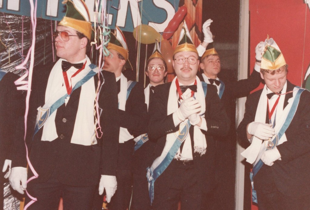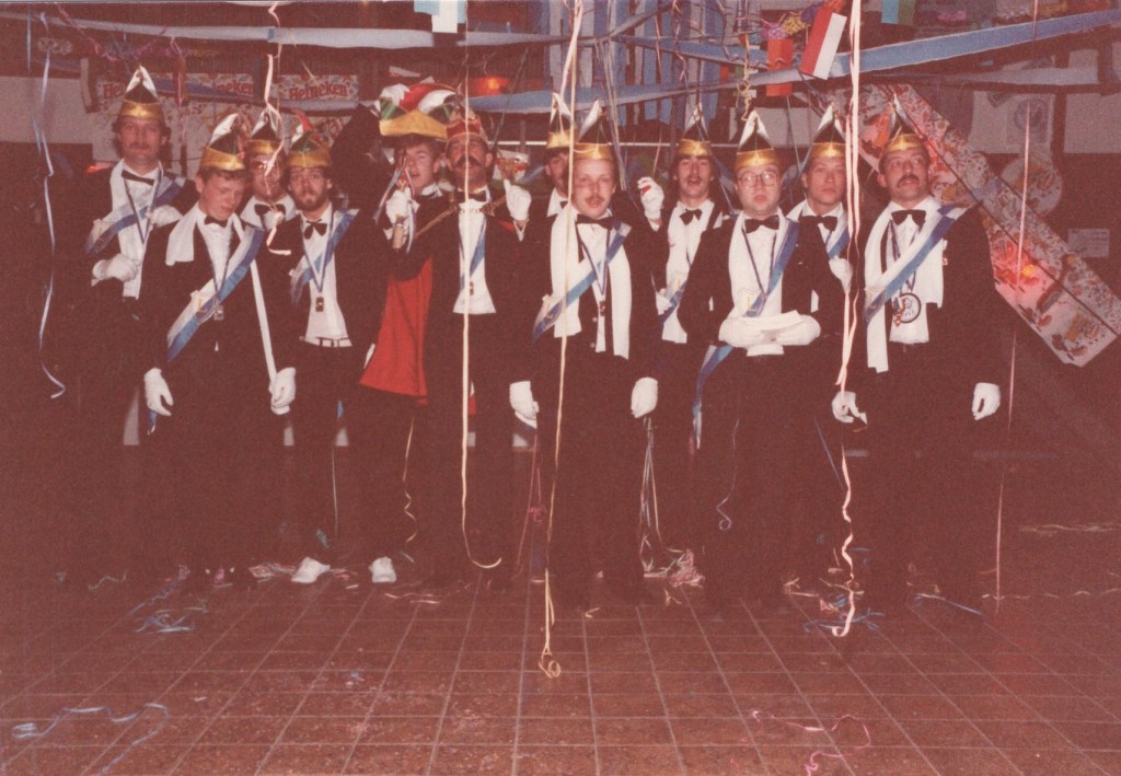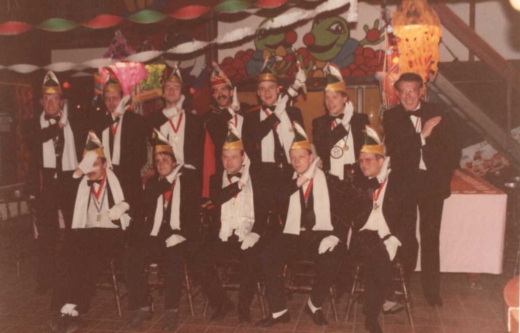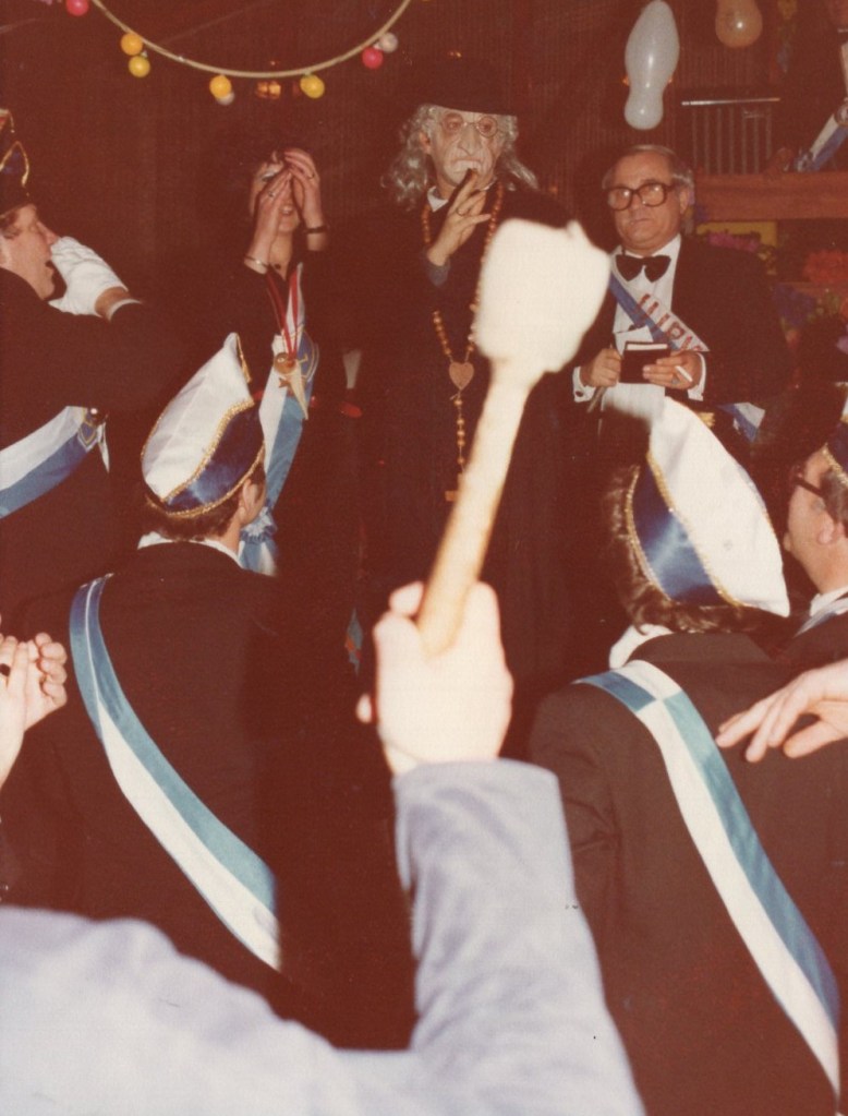 Deel uitmaken van de Raad van Elf was uiteraard een zeer serieuze zaak. Er werd nadrukkelijk gewezen op de voorbeeldfunctie. Dus geen enkel raadslid mocht al om 10 uur ’s avonds laveloos aan de bar hangen. Nee: ze moesten voorgaan in het feestgewoel, mensen enthousiast maken en dat alles in vol ornaat: zwart pak, dito strik, witte sjaal en handschoenen en een strak gesteven steek. En dit alles diende na het feest keurig te worden ingeleverd op straffe van …. ja waarvan eigenlijk? We zullen het nooit meer te weten komen. Onvergetelijk uit die periode zijn ook de capriolen van Henny Hamers alias Nar Nidas die met zijn geheel eigen invulling de vele prinsenballen en carnavalsavonden opluisterde. Het vinden van een passend narrenpak was voor hem minder problematisch dan het aanschaffen van voornoemd zwart maatkostuum.
