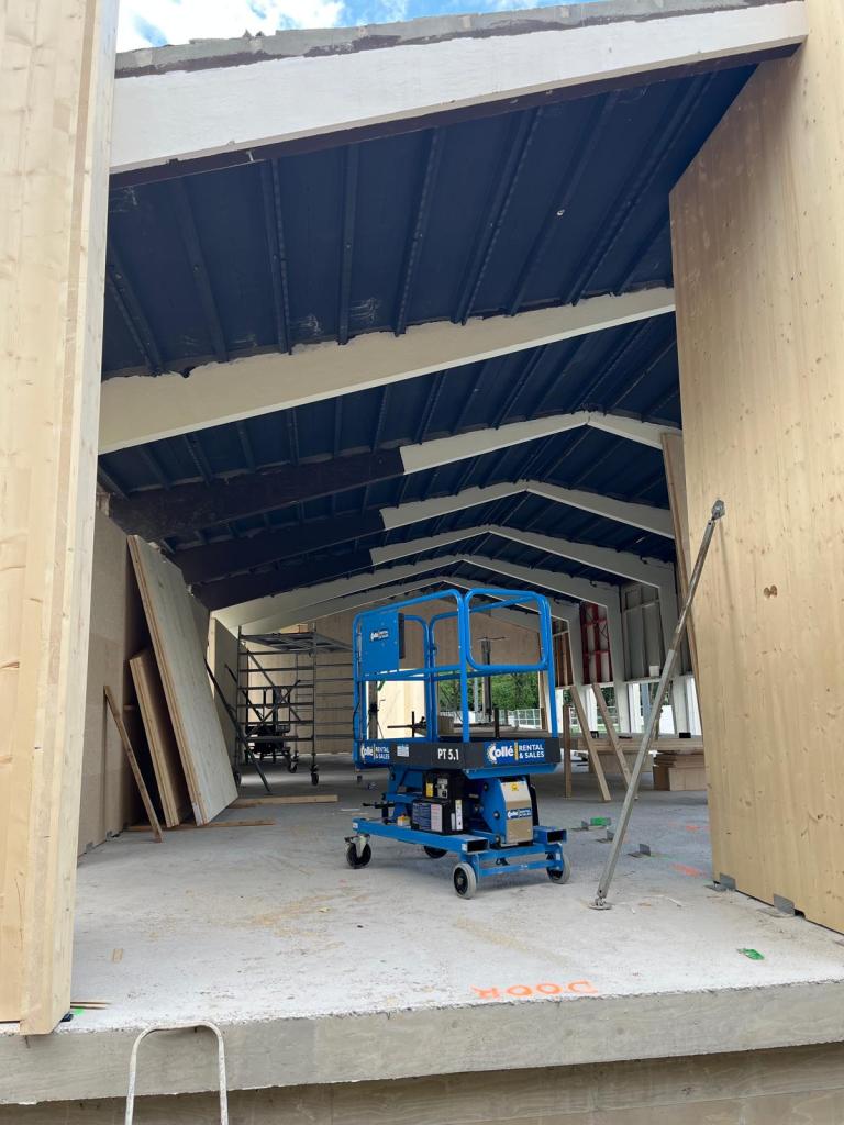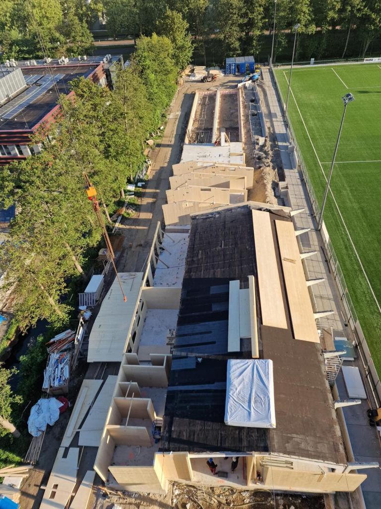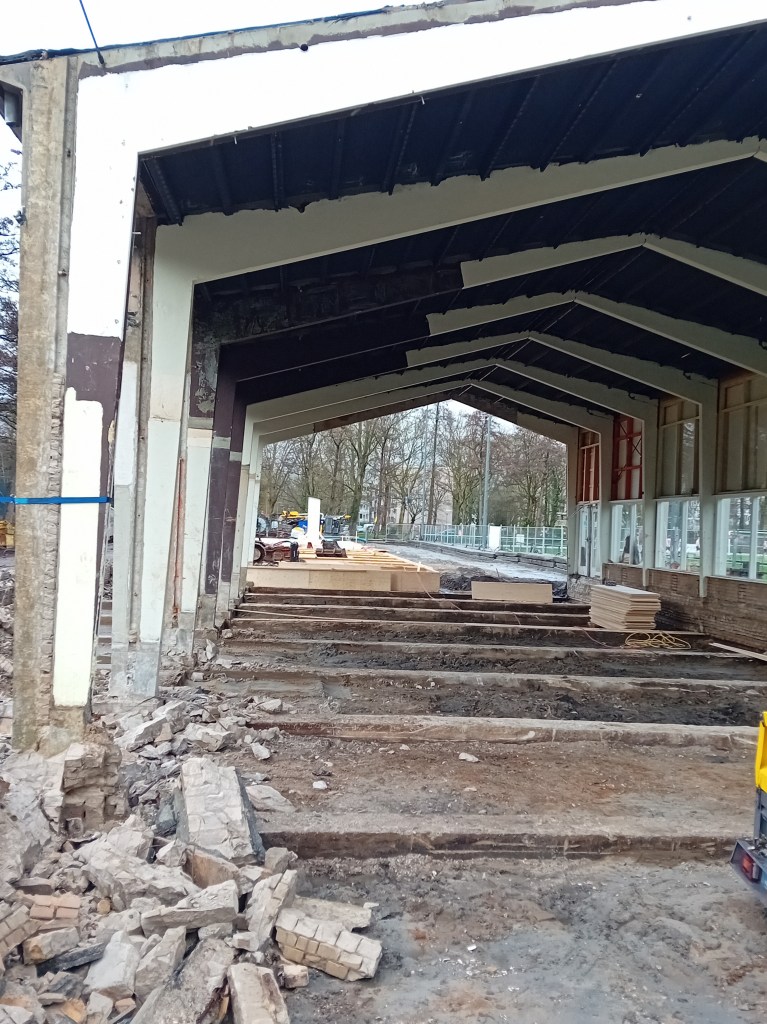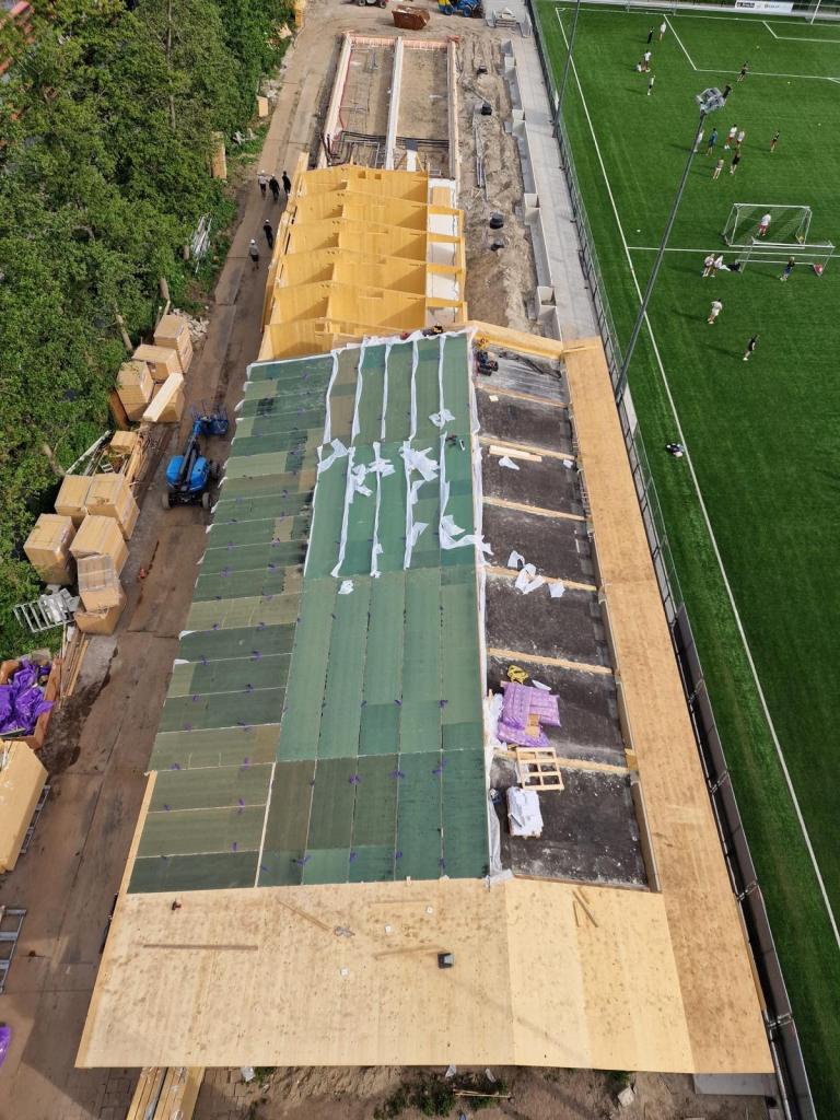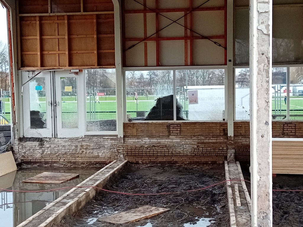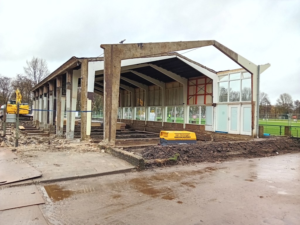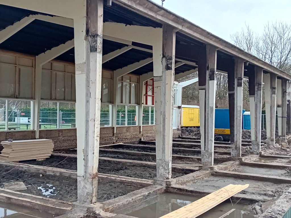 De volgende foto’s geven de huidige toestand van ons oude clubgebouw weer. Zoals je ziet blijft het frame behouden en wordt er een nieuwe opbouw gemaakt op de oude fundering dus de klassieke vorm van het gebouw blijft behouden!