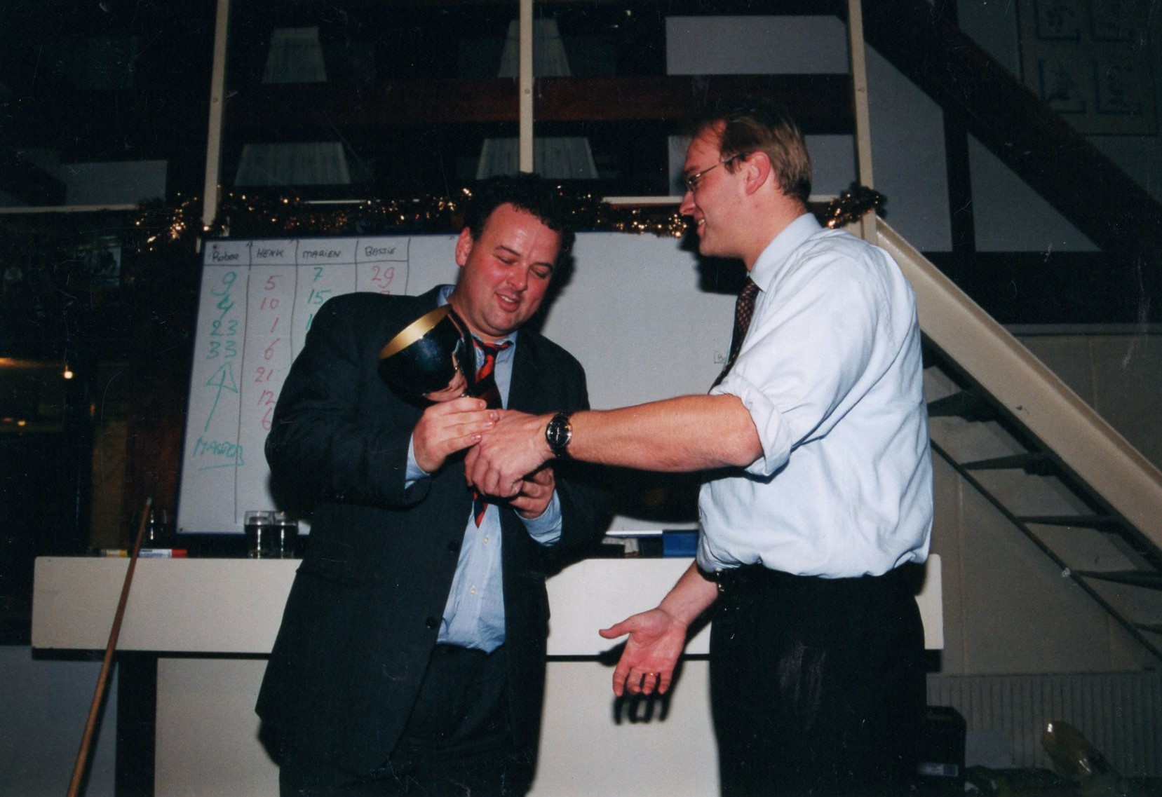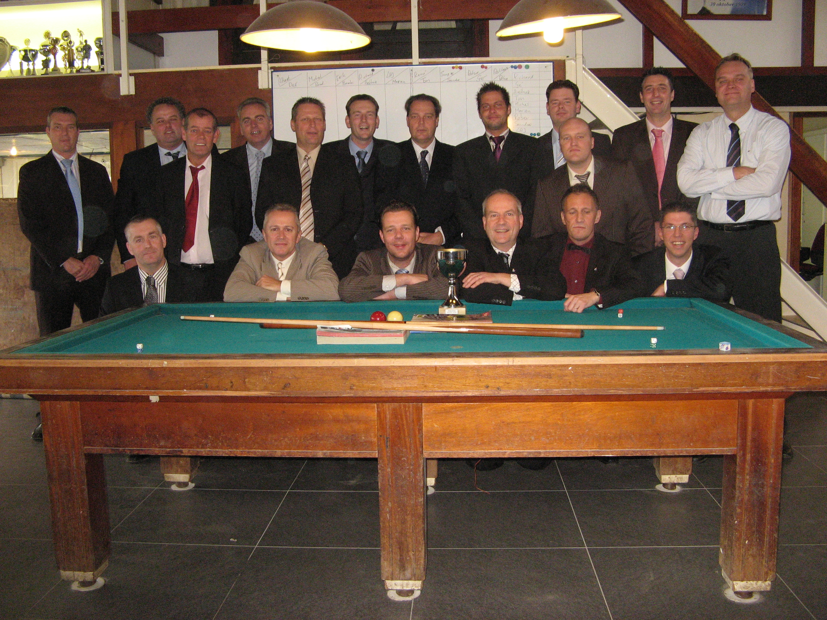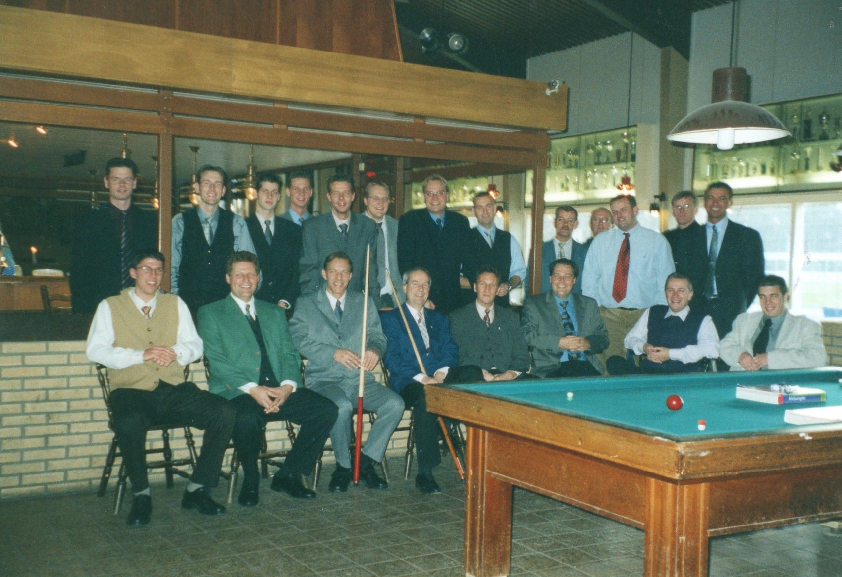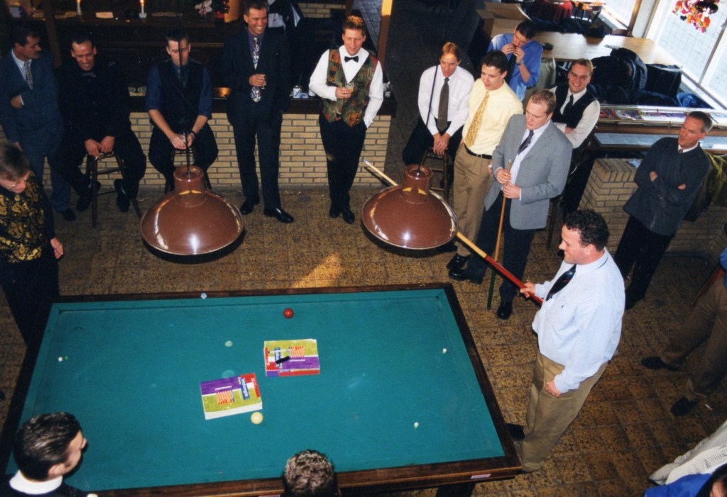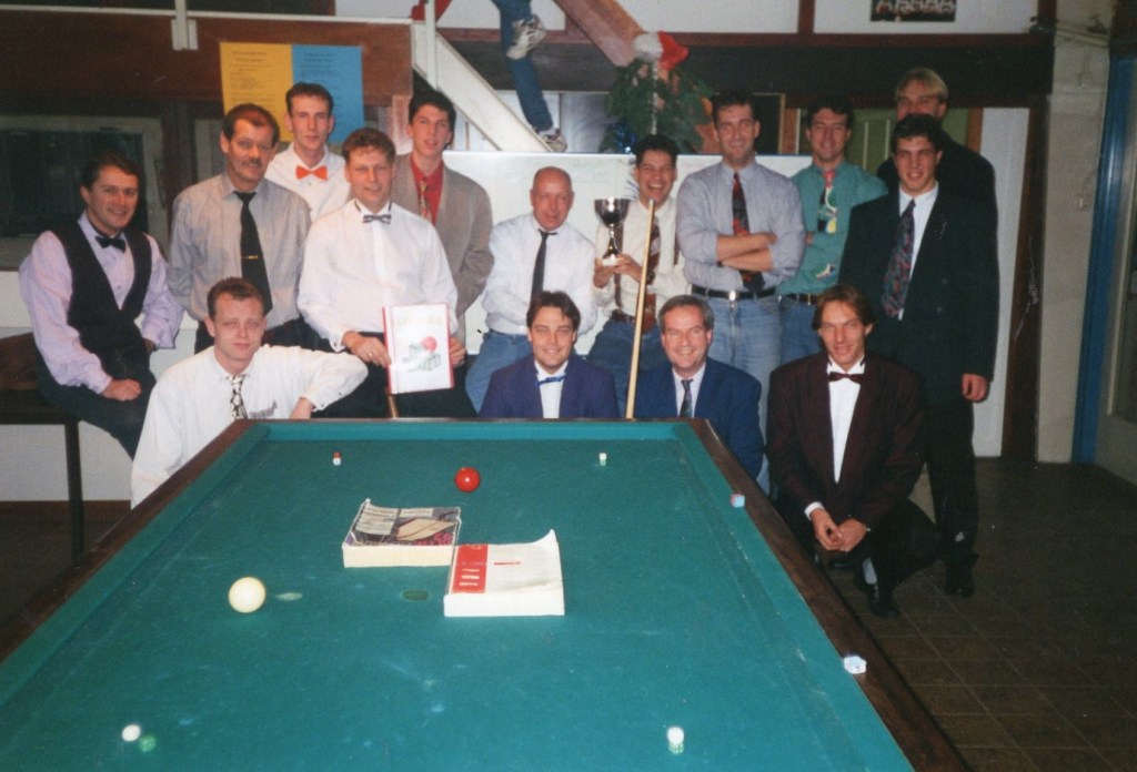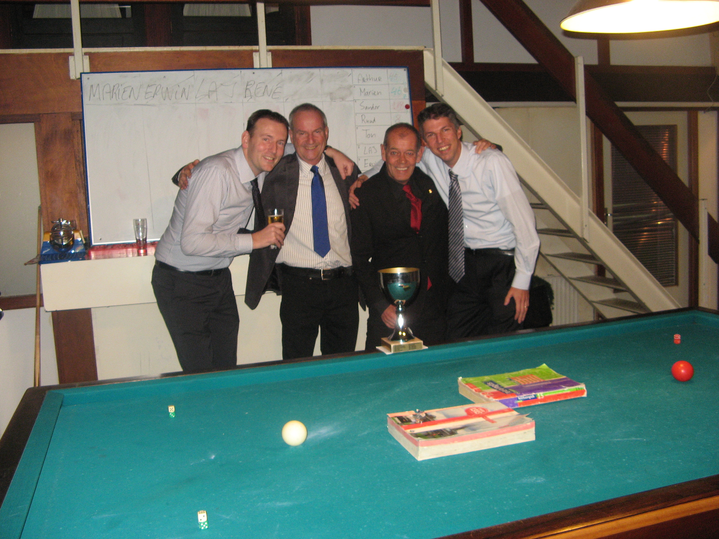 Verdere details zal ik hier niet geven, maar voor de echt geïnteresseerden zijn de spelregels in een heus spelregelboek verzameld en bovendien bent u natuurlijk van harte welkom vlak voor de Kerst. U komt er dan bijvoorbeeld achter dat het zogenaamde scoopen niet verboden is, maar door de echte vijfer verafschuwd wordt. Bij dit scoopen wordt de bal over de boeken “geschept” als er geen eenvoudige lijn naar de rode bal te vinden is. Topvijfers zijn immers niet alleen in staat zelf punten te scoren, maar ook een echte naaibal voor zijn tegenstander achter te laten. De echte vijfer vindt altijd een oplossing al moet hij over vele losse banden en langs de nodige wiebelende dobbelstenen. In dit boek uiteraard ook de spelregel wanneer het spel afgelopen is en nog belangrijker wat dit betekent voor de speler met de laagste score: bier halen voor de overige deelnemers aan het spel! Om geld is gelukkig nog nooit gespeeld. Al snel werd besloten dat er naast het wekelijkse bier eenmaal per jaar om de eer zou worden gespeeld om je een jaar lang de beste “vijfer” van Leonidas te mogen noemen. En laten we niet te bescheiden zijn: beste “vijfer” van Leonidas betekent in de praktijk beste “vijfer” ter wereld. Kortom, in het kader waar u de winnaars van dit jaarlijkse evenement aantreft, leest u eigenlijk een hele rij wereldkampioenen die Leonidas heeft voortgebracht.Zo ontstond, gelijk met de opkomst op tv van het snookeren en hun Masters toernooi, de Leonidas Masters. En hoewel onvergelijkbaar toch ook met een paar opvallende vergelijkbare kenmerken. Zo verschenen er bij de Leonidas Masters plotseling ook de uit het snooker bekende hulpstukken, waarop de speler de keu kon laten rusten als hij met zijn eigen handen onvoldoende kon ondersteunen. En daar waar er in het snooker kwijlend over een maximum break van 147 werd gesproken droomden de vijfers van een “topknol”, een stoot waarbij in 1 keer alle groene dobbelstenen om gingen. Na het overlijden van Hans Hollander, linkerspits van het vijfde, medebedenker van het spel en voor vele vijfers ook op andere vlakken een belangrijke bron van inspiratie, werden de Masters direct als eerbetoon in de “Hollander Masters” omgedoopt.