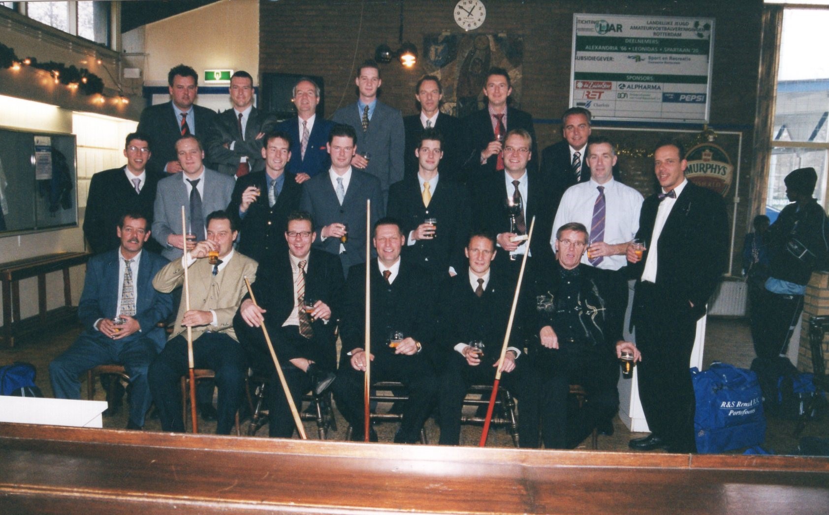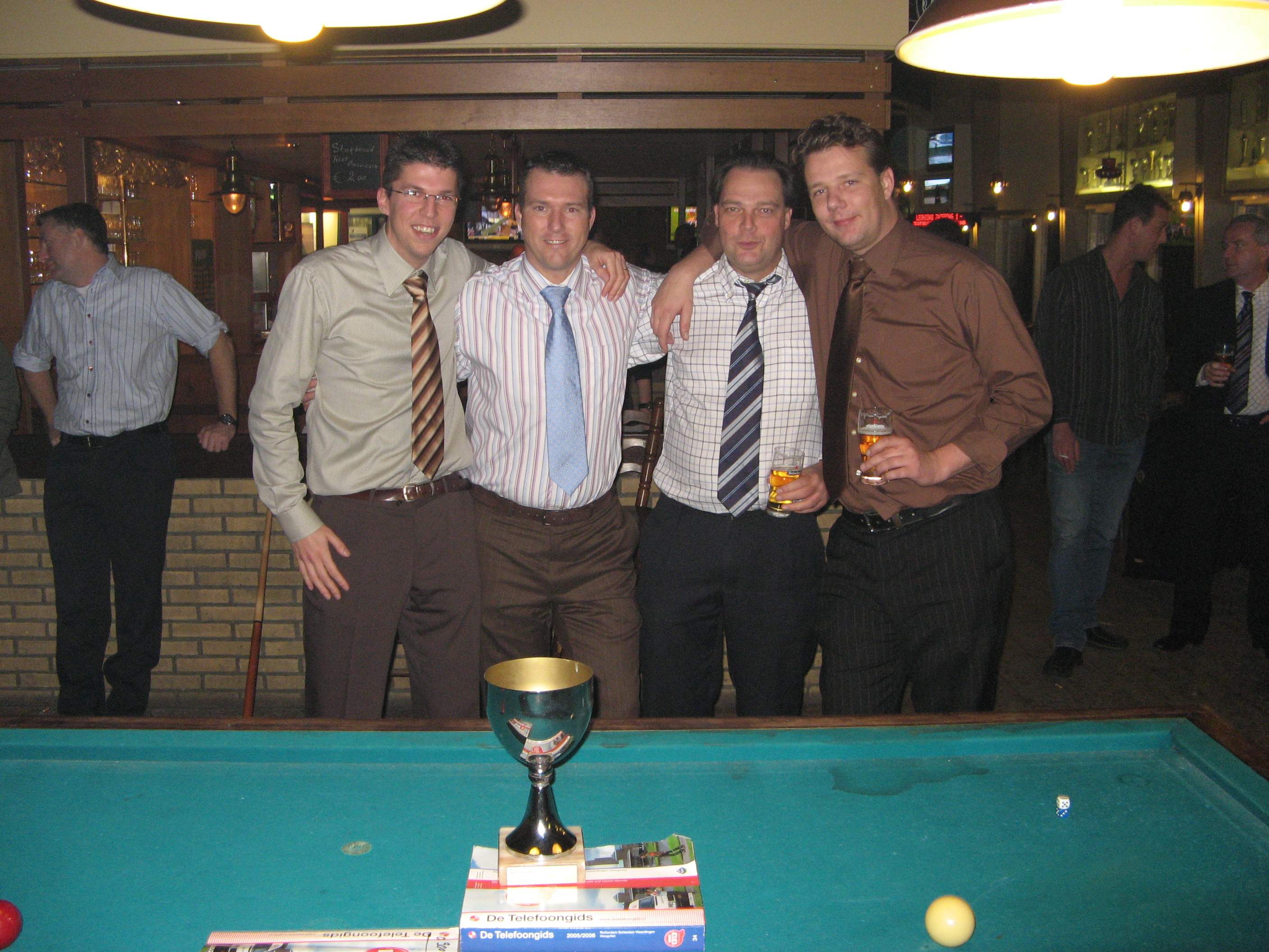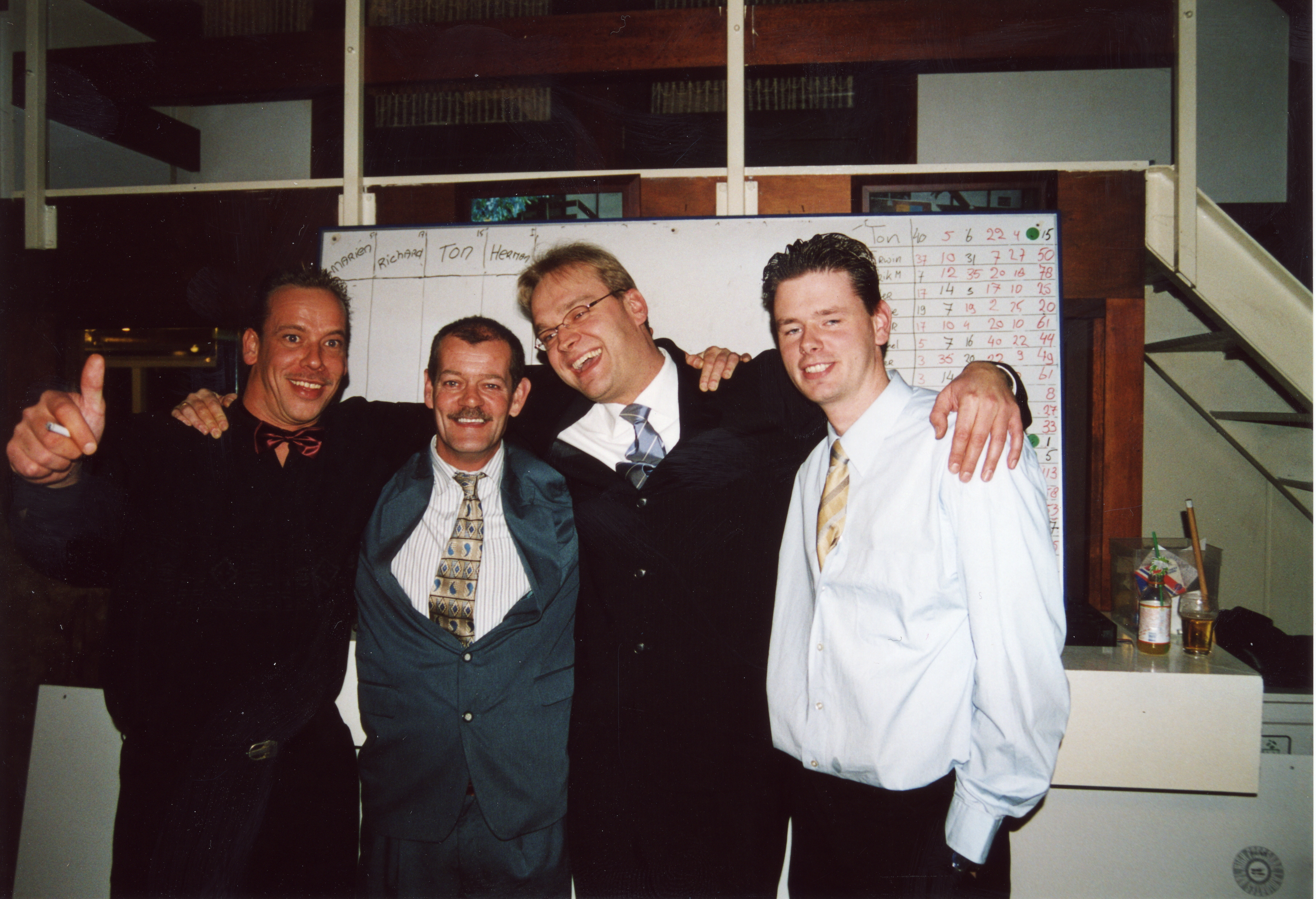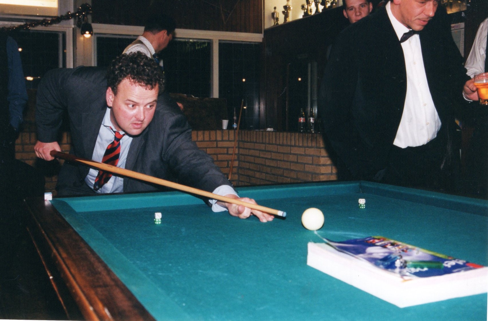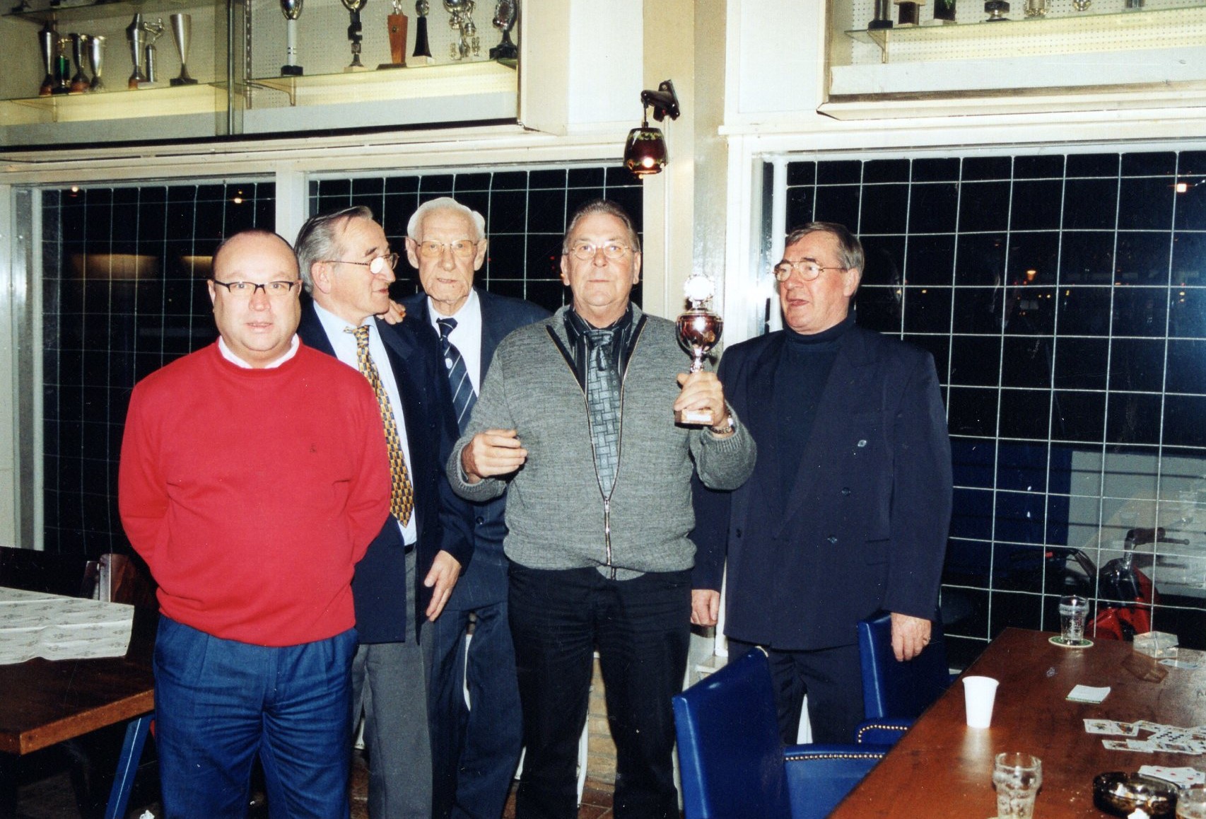 Verdere details zal ik hier niet geven, maar voor de echt geïnteresseerden zijn de spelregels in een heus spelregelboek verzameld en bovendien bent u natuurlijk van harte welkom vlak voor de Kerst. U komt er dan bijvoorbeeld achter dat het zogenaamde scoopen niet verboden is, maar door de echte vijfer verafschuwd wordt. Bij dit scoopen wordt de bal over de boeken “geschept” als er geen eenvoudige lijn naar de rode bal te vinden is. Topvijfers zijn immers niet alleen in staat zelf punten te scoren, maar ook een echte naaibal voor zijn tegenstander achter te laten. De echte vijfer vindt altijd een oplossing al moet hij over vele losse banden en langs de nodige wiebelende dobbelstenen. In dit boek uiteraard ook de spelregel wanneer het spel afgelopen is en nog belangrijker wat dit betekent voor de speler met de laagste score: bier halen voor de overige deelnemers aan het spel! Om geld is gelukkig nog nooit gespeeld. Al snel werd besloten dat er naast het wekelijkse bier eenmaal per jaar om de eer zou worden gespeeld om je een jaar lang de beste “vijfer” van Leonidas te mogen noemen. En laten we niet te bescheiden zijn: beste “vijfer” van Leonidas betekent in de praktijk beste “vijfer” ter wereld. Kortom, in het kader waar u de winnaars van dit jaarlijkse evenement aantreft, leest u eigenlijk een hele rij wereldkampioenen die Leonidas heeft voortgebracht.Zo ontstond, gelijk met de opkomst op tv van het snookeren en hun Masters toernooi, de Leonidas Masters. En hoewel onvergelijkbaar toch ook met een paar opvallende vergelijkbare kenmerken. Zo verschenen er bij de Leonidas Masters plotseling ook de uit het snooker bekende hulpstukken, waarop de speler de keu kon laten rusten als hij met zijn eigen handen onvoldoende kon ondersteunen. En daar waar er in het snooker kwijlend over een maximum break van 147 werd gesproken droomden de vijfers van een “topknol”, een stoot waarbij in 1 keer alle groene dobbelstenen om gingen. Na het overlijden van Hans Hollander, linkerspits van het vijfde, medebedenker van het spel en voor vele vijfers ook op andere vlakken een belangrijke bron van inspiratie, werden de Masters direct als eerbetoon in de “Hollander Masters” omgedoopt.