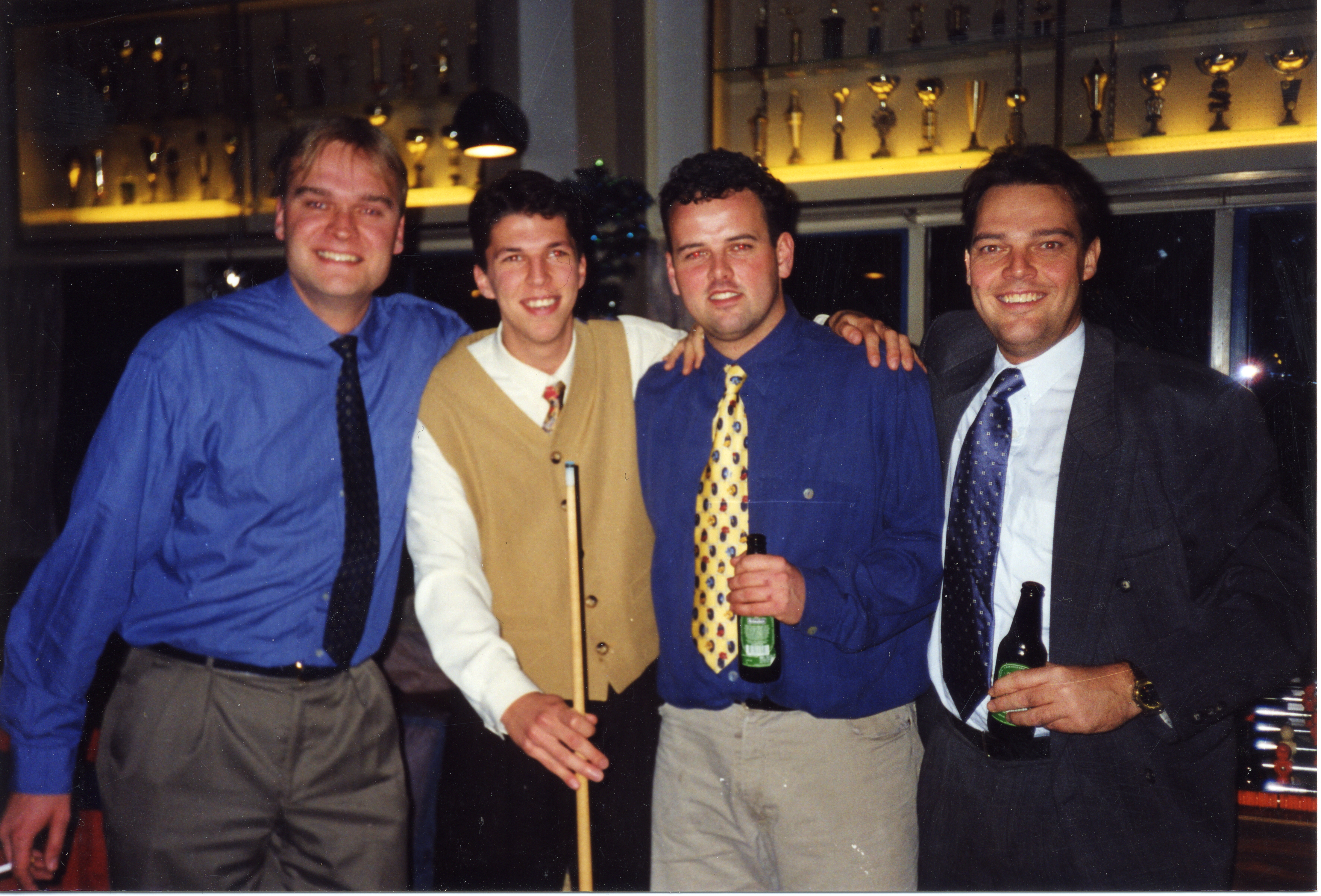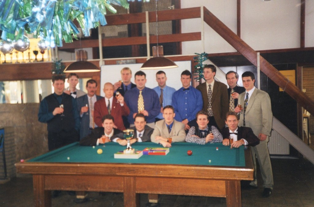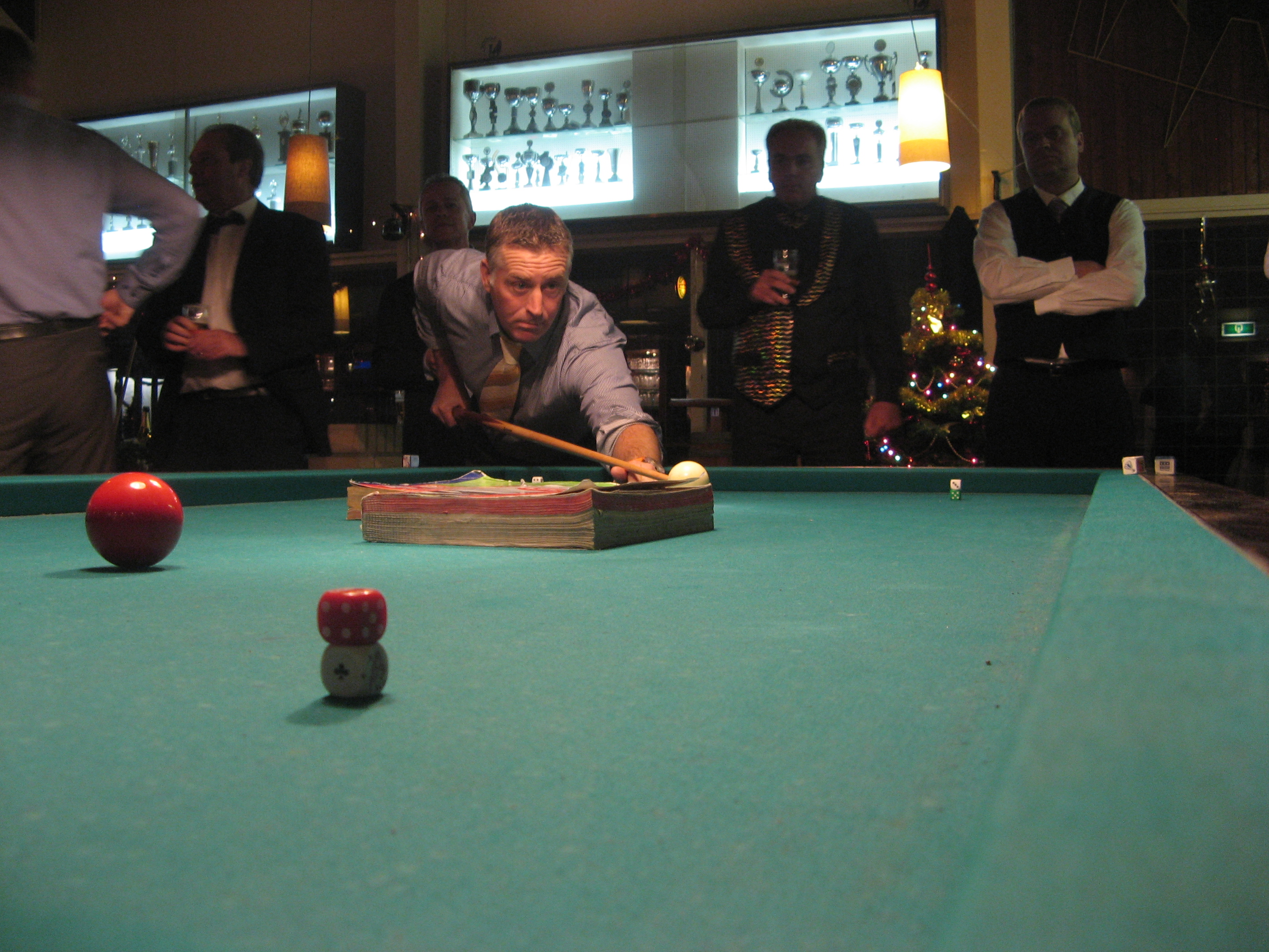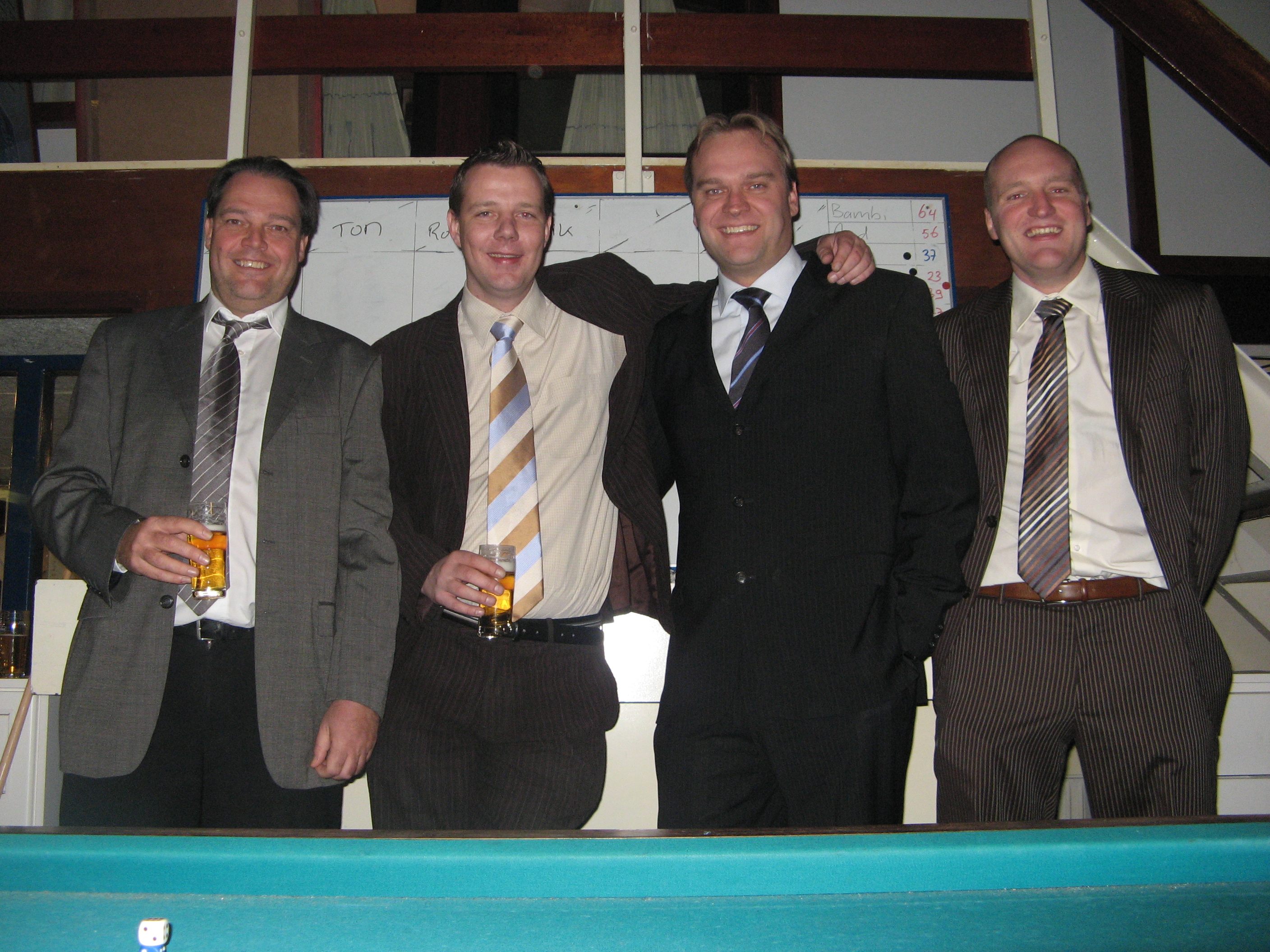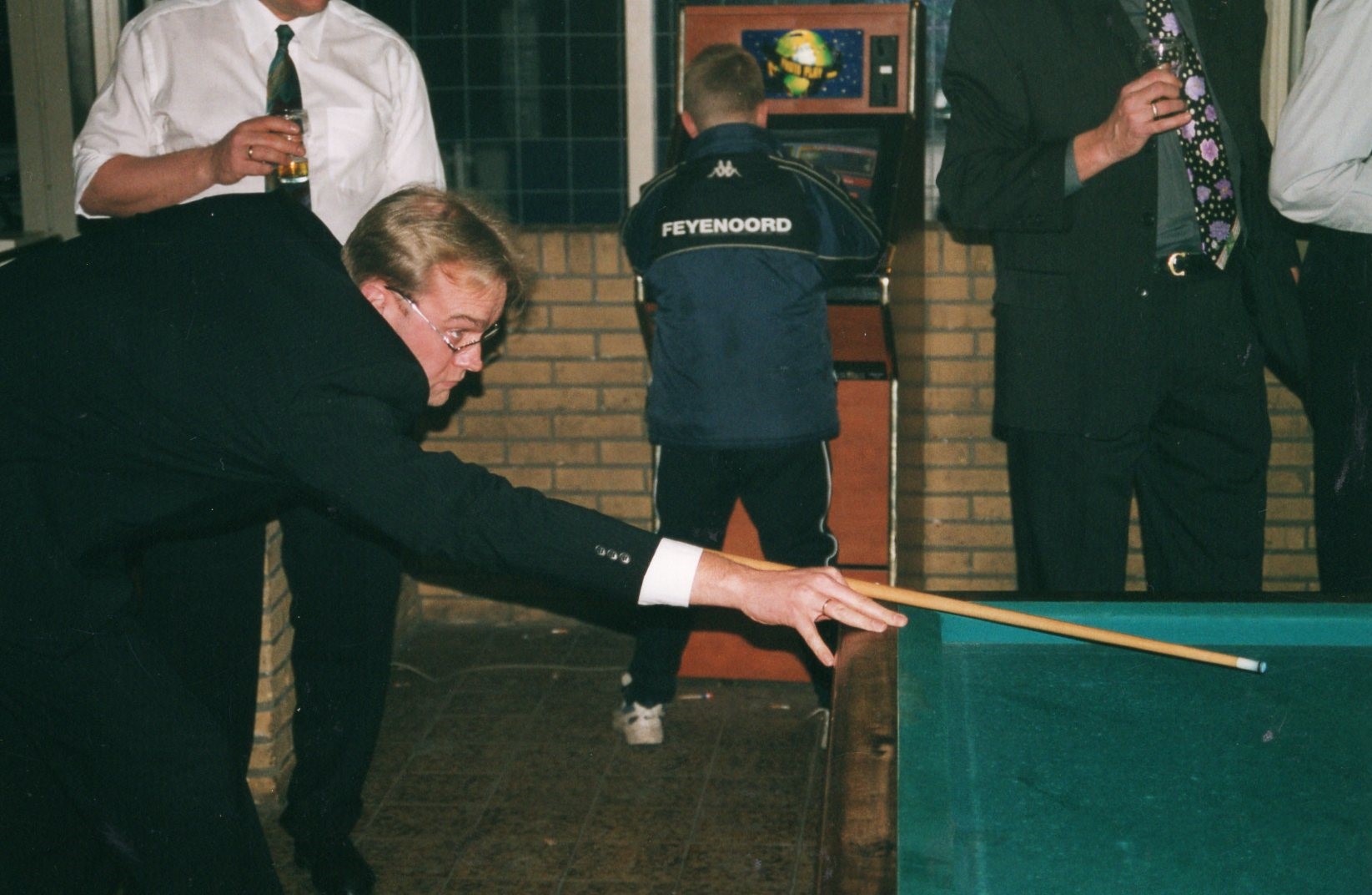 Verdere details zal ik hier niet geven, maar voor de echt geïnteresseerden zijn de spelregels in een heus spelregelboek verzameld en bovendien bent u natuurlijk van harte welkom vlak voor de Kerst. U komt er dan bijvoorbeeld achter dat het zogenaamde scoopen niet verboden is, maar door de echte vijfer verafschuwd wordt. Bij dit scoopen wordt de bal over de boeken “geschept” als er geen eenvoudige lijn naar de rode bal te vinden is. Topvijfers zijn immers niet alleen in staat zelf punten te scoren, maar ook een echte naaibal voor zijn tegenstander achter te laten. De echte vijfer vindt altijd een oplossing al moet hij over vele losse banden en langs de nodige wiebelende dobbelstenen. In dit boek uiteraard ook de spelregel wanneer het spel afgelopen is en nog belangrijker wat dit betekent voor de speler met de laagste score: bier halen voor de overige deelnemers aan het spel! Om geld is gelukkig nog nooit gespeeld. Al snel werd besloten dat er naast het wekelijkse bier eenmaal per jaar om de eer zou worden gespeeld om je een jaar lang de beste “vijfer” van Leonidas te mogen noemen. En laten we niet te bescheiden zijn: beste “vijfer” van Leonidas betekent in de praktijk beste “vijfer” ter wereld. Kortom, in het kader waar u de winnaars van dit jaarlijkse evenement aantreft, leest u eigenlijk een hele rij wereldkampioenen die Leonidas heeft voortgebracht.Zo ontstond, gelijk met de opkomst op tv van het snookeren en hun Masters toernooi, de Leonidas Masters. En hoewel onvergelijkbaar toch ook met een paar opvallende vergelijkbare kenmerken. Zo verschenen er bij de Leonidas Masters plotseling ook de uit het snooker bekende hulpstukken, waarop de speler de keu kon laten rusten als hij met zijn eigen handen onvoldoende kon ondersteunen. En daar waar er in het snooker kwijlend over een maximum break van 147 werd gesproken droomden de vijfers van een “topknol”, een stoot waarbij in 1 keer alle groene dobbelstenen om gingen. Na het overlijden van Hans Hollander, linkerspits van het vijfde, medebedenker van het spel en voor vele vijfers ook op andere vlakken een belangrijke bron van inspiratie, werden de Masters direct als eerbetoon in de “Hollander Masters” omgedoopt.