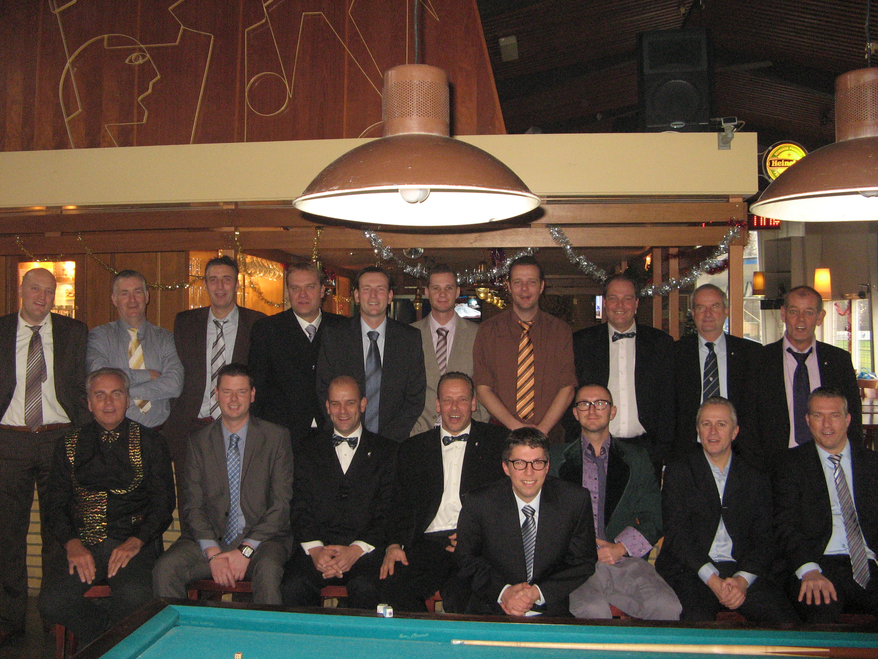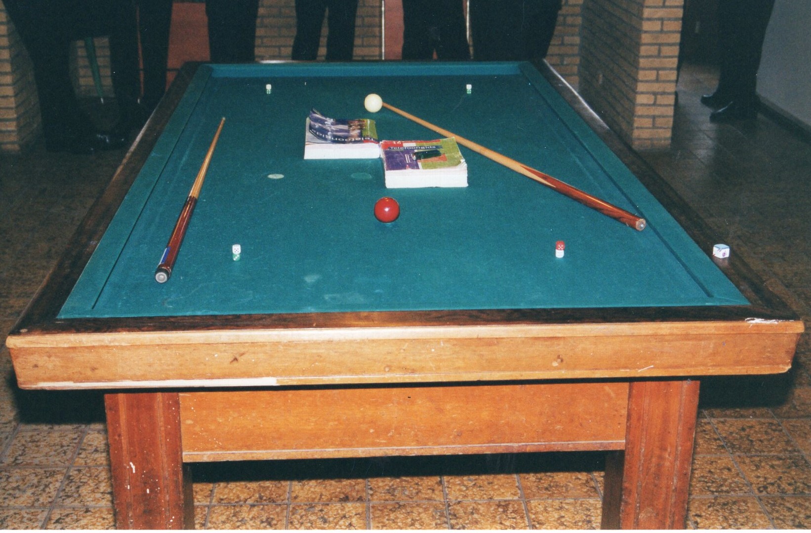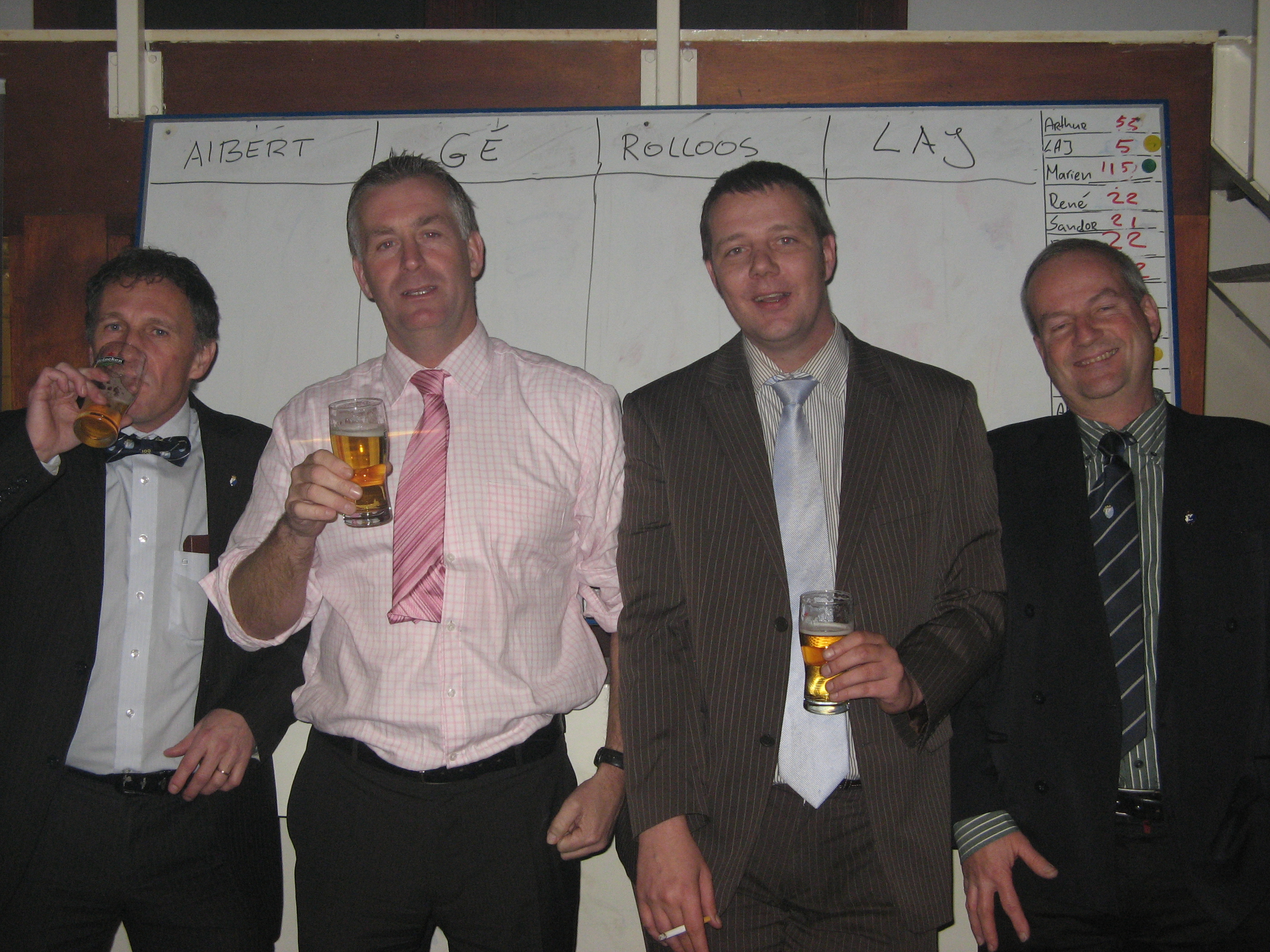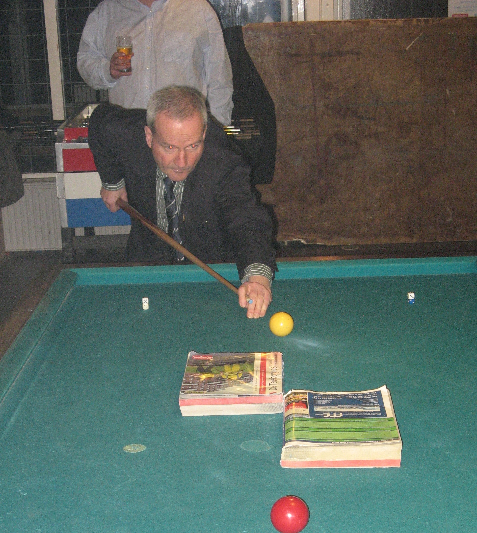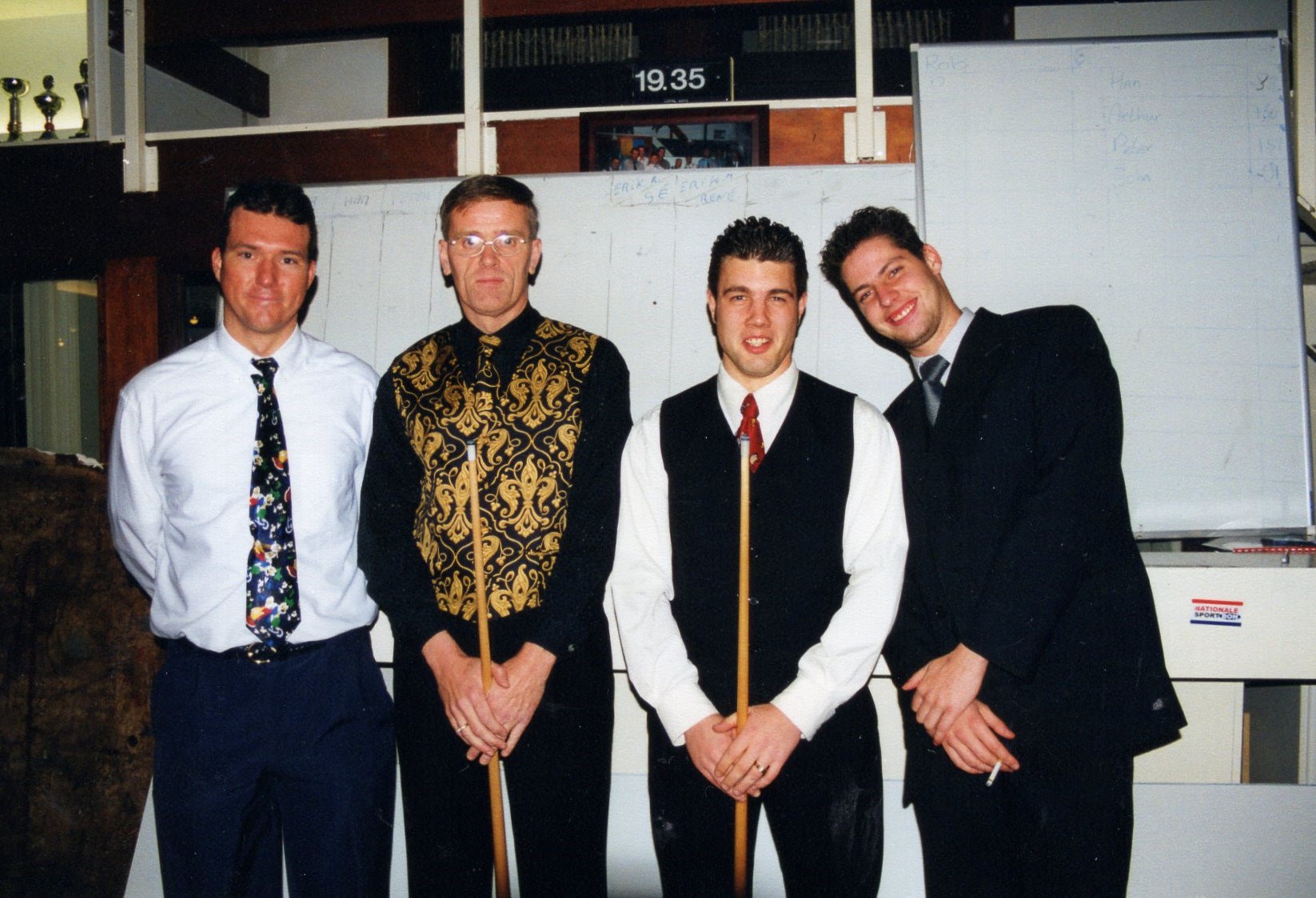 Verdere details zal ik hier niet geven, maar voor de echt geïnteresseerden zijn de spelregels in een heus spelregelboek verzameld en bovendien bent u natuurlijk van harte welkom vlak voor de Kerst. U komt er dan bijvoorbeeld achter dat het zogenaamde scoopen niet verboden is, maar door de echte vijfer verafschuwd wordt. Bij dit scoopen wordt de bal over de boeken “geschept” als er geen eenvoudige lijn naar de rode bal te vinden is. Topvijfers zijn immers niet alleen in staat zelf punten te scoren, maar ook een echte naaibal voor zijn tegenstander achter te laten. De echte vijfer vindt altijd een oplossing al moet hij over vele losse banden en langs de nodige wiebelende dobbelstenen. In dit boek uiteraard ook de spelregel wanneer het spel afgelopen is en nog belangrijker wat dit betekent voor de speler met de laagste score: bier halen voor de overige deelnemers aan het spel! Om geld is gelukkig nog nooit gespeeld. Al snel werd besloten dat er naast het wekelijkse bier eenmaal per jaar om de eer zou worden gespeeld om je een jaar lang de beste “vijfer” van Leonidas te mogen noemen. En laten we niet te bescheiden zijn: beste “vijfer” van Leonidas betekent in de praktijk beste “vijfer” ter wereld. Kortom, in het kader waar u de winnaars van dit jaarlijkse evenement aantreft, leest u eigenlijk een hele rij wereldkampioenen die Leonidas heeft voortgebracht.Zo ontstond, gelijk met de opkomst op tv van het snookeren en hun Masters toernooi, de Leonidas Masters. En hoewel onvergelijkbaar toch ook met een paar opvallende vergelijkbare kenmerken. Zo verschenen er bij de Leonidas Masters plotseling ook de uit het snooker bekende hulpstukken, waarop de speler de keu kon laten rusten als hij met zijn eigen handen onvoldoende kon ondersteunen. En daar waar er in het snooker kwijlend over een maximum break van 147 werd gesproken droomden de vijfers van een “topknol”, een stoot waarbij in 1 keer alle groene dobbelstenen om gingen. Na het overlijden van Hans Hollander, linkerspits van het vijfde, medebedenker van het spel en voor vele vijfers ook op andere vlakken een belangrijke bron van inspiratie, werden de Masters direct als eerbetoon in de “Hollander Masters” omgedoopt.