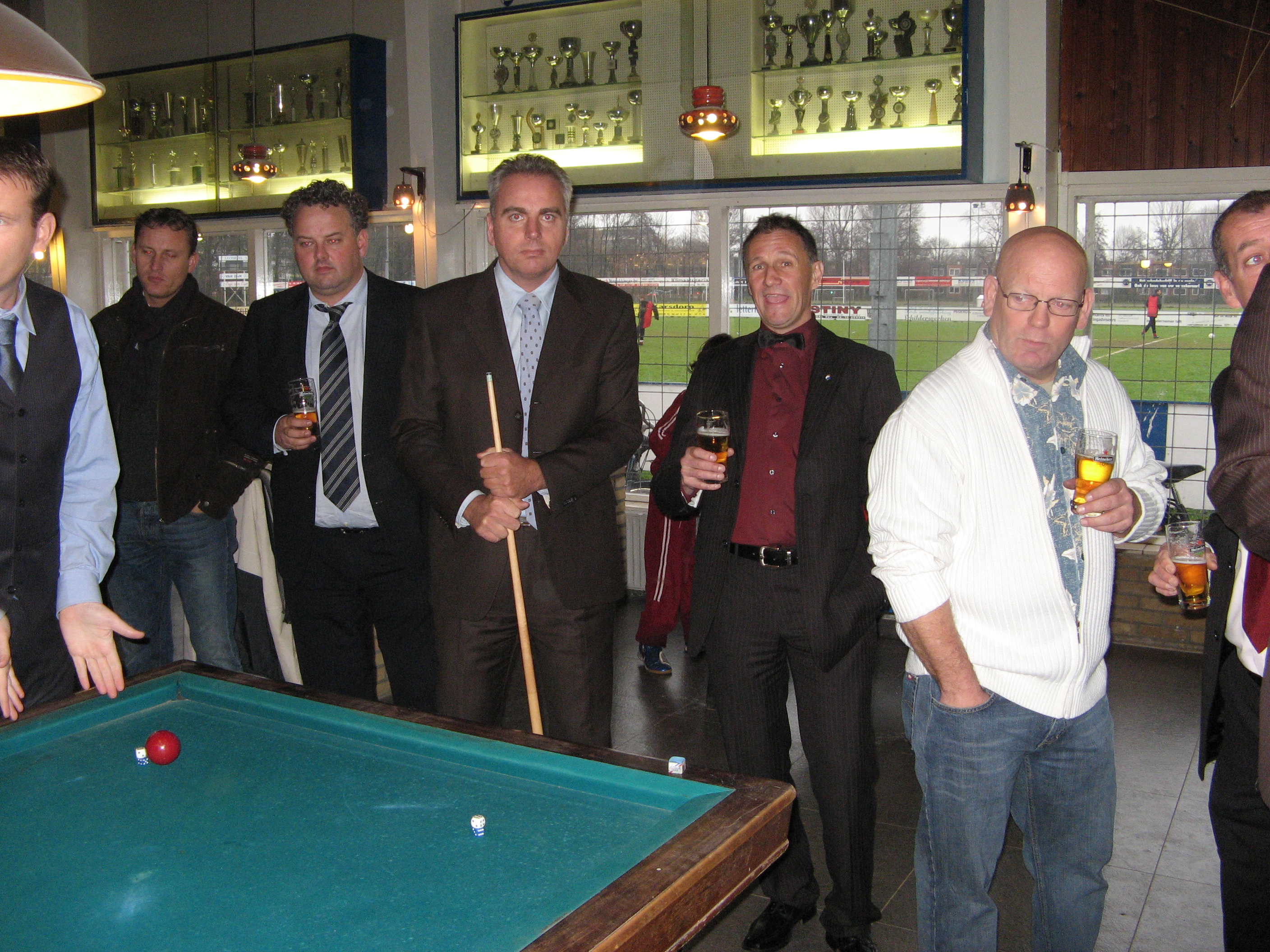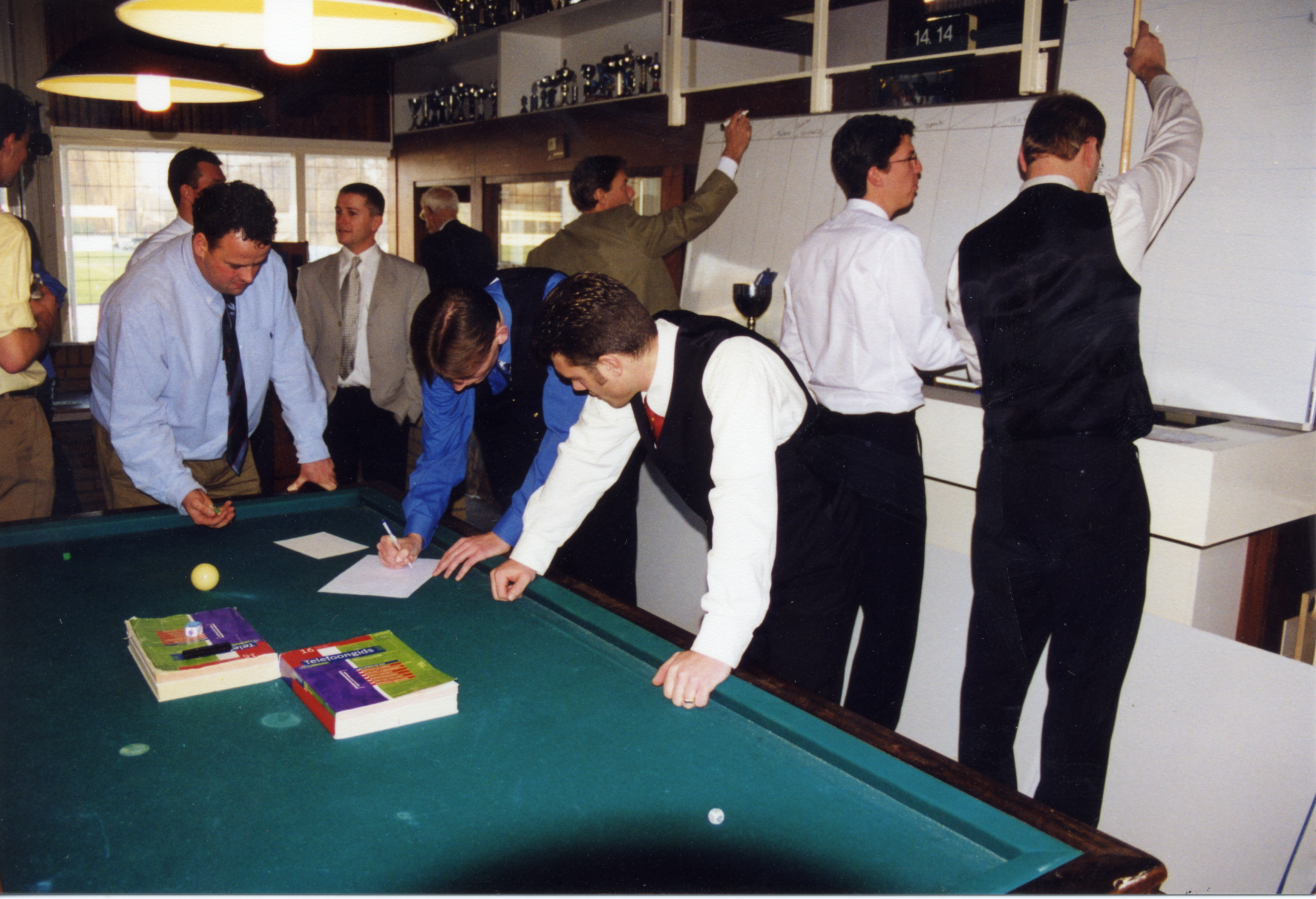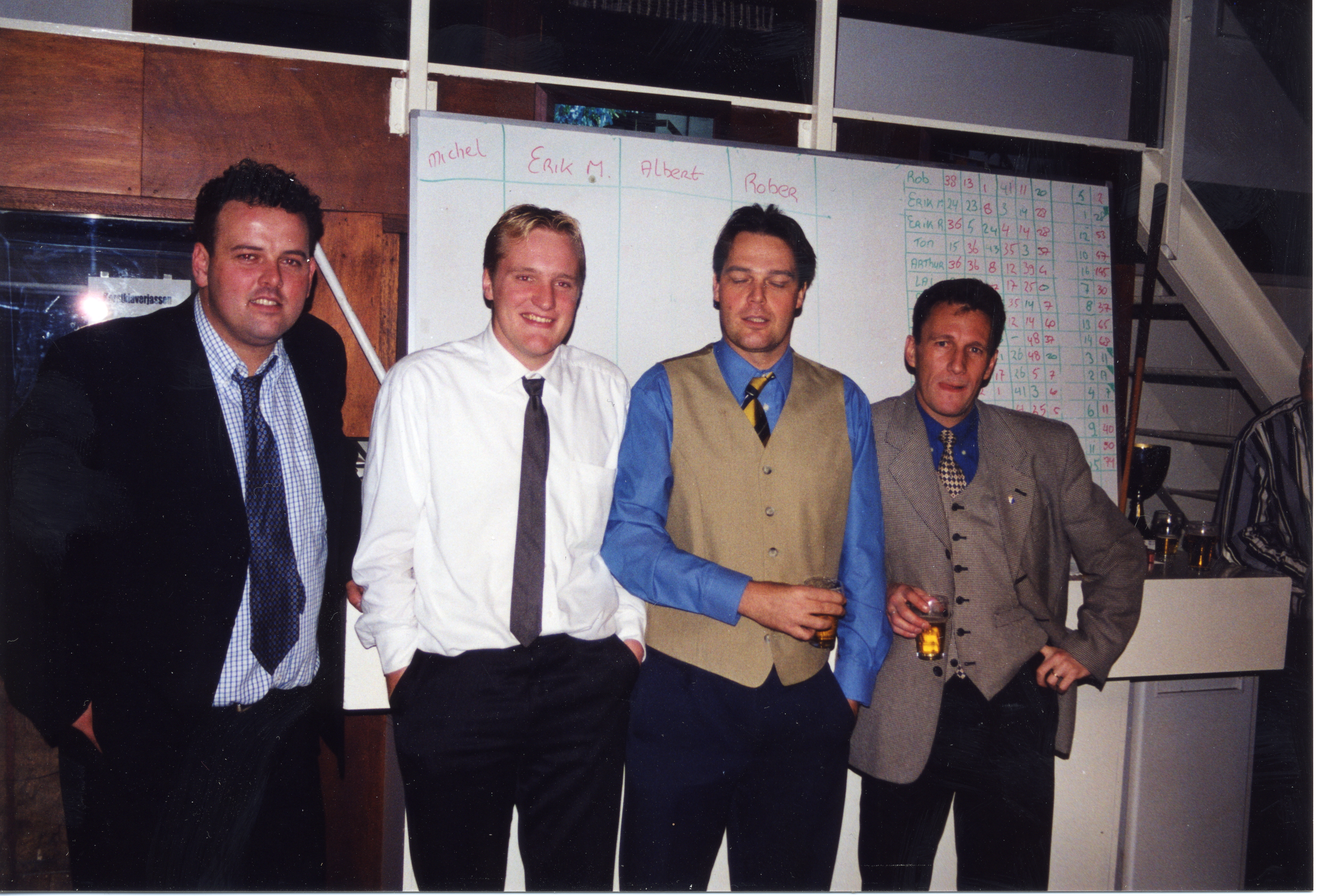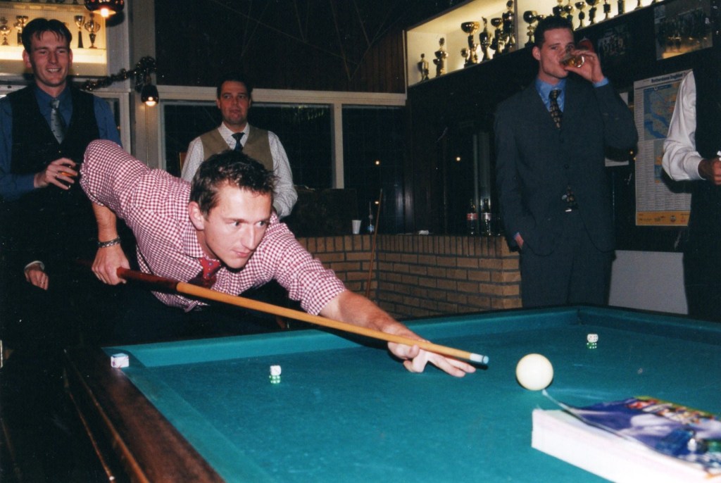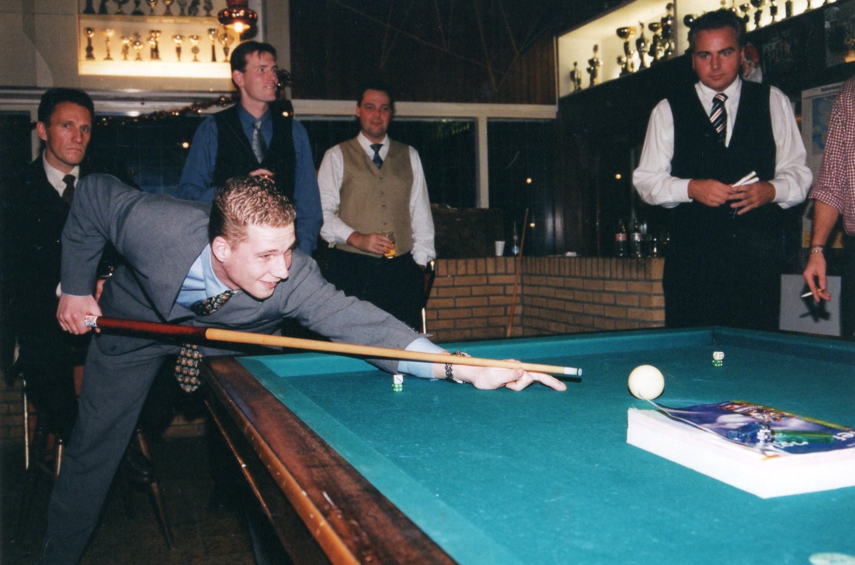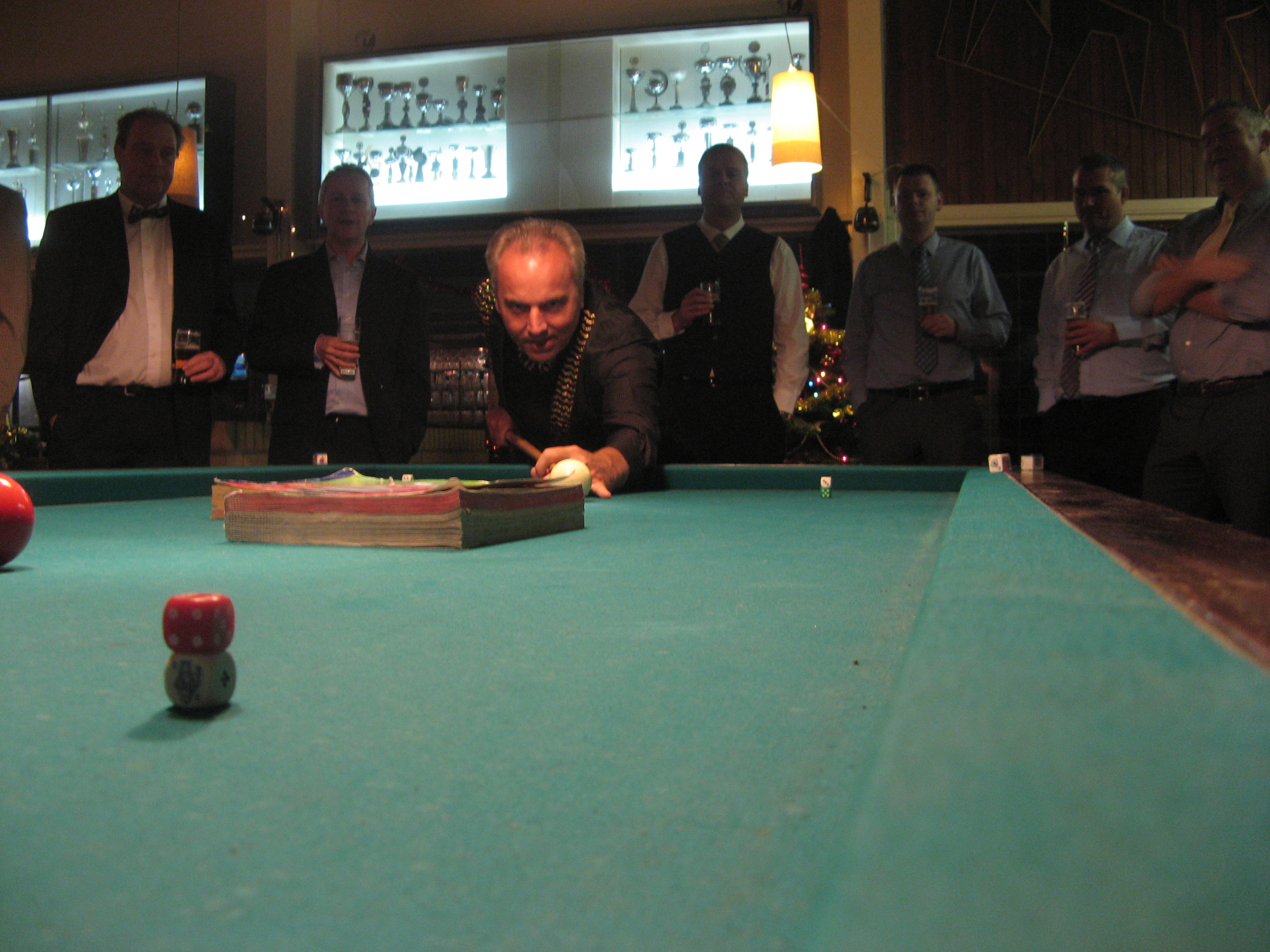 Verdere details zal ik hier niet geven, maar voor de echt geïnteresseerden zijn de spelregels in een heus spelregelboek verzameld en bovendien bent u natuurlijk van harte welkom vlak voor de Kerst. U komt er dan bijvoorbeeld achter dat het zogenaamde scoopen niet verboden is, maar door de echte vijfer verafschuwd wordt. Bij dit scoopen wordt de bal over de boeken “geschept” als er geen eenvoudige lijn naar de rode bal te vinden is. Topvijfers zijn immers niet alleen in staat zelf punten te scoren, maar ook een echte naaibal voor zijn tegenstander achter te laten. De echte vijfer vindt altijd een oplossing al moet hij over vele losse banden en langs de nodige wiebelende dobbelstenen. In dit boek uiteraard ook de spelregel wanneer het spel afgelopen is en nog belangrijker wat dit betekent voor de speler met de laagste score: bier halen voor de overige deelnemers aan het spel! Om geld is gelukkig nog nooit gespeeld. Al snel werd besloten dat er naast het wekelijkse bier eenmaal per jaar om de eer zou worden gespeeld om je een jaar lang de beste “vijfer” van Leonidas te mogen noemen. En laten we niet te bescheiden zijn: beste “vijfer” van Leonidas betekent in de praktijk beste “vijfer” ter wereld. Kortom, in het kader waar u de winnaars van dit jaarlijkse evenement aantreft, leest u eigenlijk een hele rij wereldkampioenen die Leonidas heeft voortgebracht.Zo ontstond, gelijk met de opkomst op tv van het snookeren en hun Masters toernooi, de Leonidas Masters. En hoewel onvergelijkbaar toch ook met een paar opvallende vergelijkbare kenmerken. Zo verschenen er bij de Leonidas Masters plotseling ook de uit het snooker bekende hulpstukken, waarop de speler de keu kon laten rusten als hij met zijn eigen handen onvoldoende kon ondersteunen. En daar waar er in het snooker kwijlend over een maximum break van 147 werd gesproken droomden de vijfers van een “topknol”, een stoot waarbij in 1 keer alle groene dobbelstenen om gingen. Na het overlijden van Hans Hollander, linkerspits van het vijfde, medebedenker van het spel en voor vele vijfers ook op andere vlakken een belangrijke bron van inspiratie, werden de Masters direct als eerbetoon in de “Hollander Masters” omgedoopt.