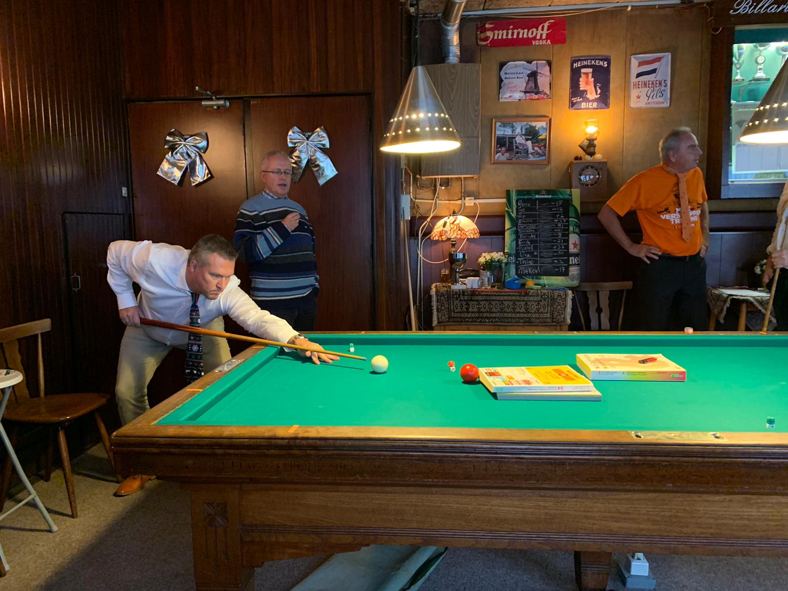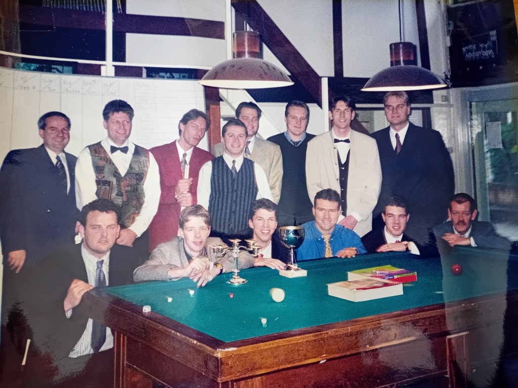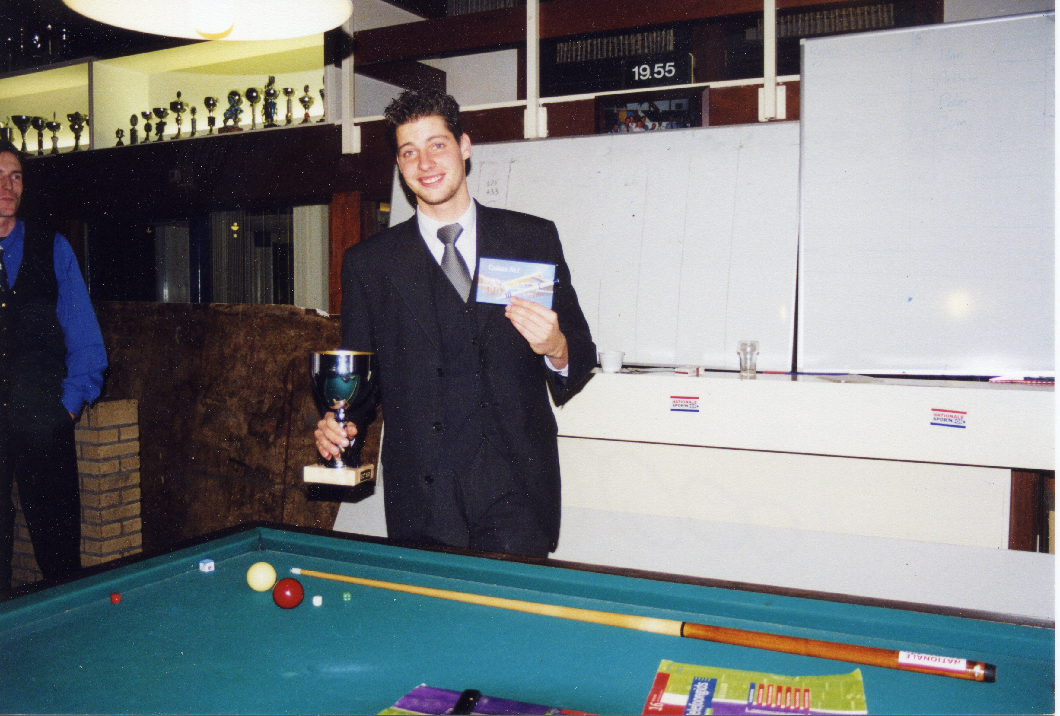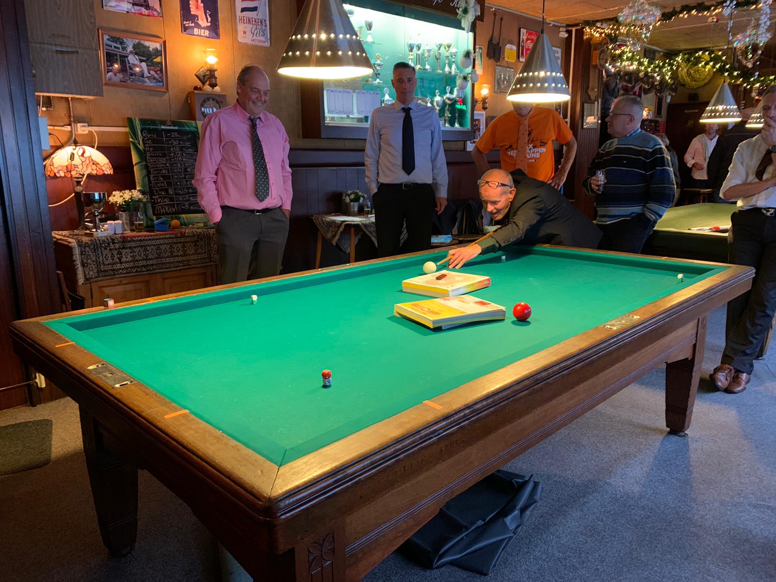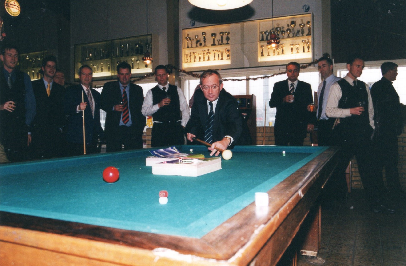 Verdere details zal ik hier niet geven, maar voor de echt geïnteresseerden zijn de spelregels in een heus spelregelboek verzameld en bovendien bent u natuurlijk van harte welkom vlak voor de Kerst. U komt er dan bijvoorbeeld achter dat het zogenaamde scoopen niet verboden is, maar door de echte vijfer verafschuwd wordt. Bij dit scoopen wordt de bal over de boeken “geschept” als er geen eenvoudige lijn naar de rode bal te vinden is. Topvijfers zijn immers niet alleen in staat zelf punten te scoren, maar ook een echte naaibal voor zijn tegenstander achter te laten. De echte vijfer vindt altijd een oplossing al moet hij over vele losse banden en langs de nodige wiebelende dobbelstenen. In dit boek uiteraard ook de spelregel wanneer het spel afgelopen is en nog belangrijker wat dit betekent voor de speler met de laagste score: bier halen voor de overige deelnemers aan het spel! Om geld is gelukkig nog nooit gespeeld. Al snel werd besloten dat er naast het wekelijkse bier eenmaal per jaar om de eer zou worden gespeeld om je een jaar lang de beste “vijfer” van Leonidas te mogen noemen. En laten we niet te bescheiden zijn: beste “vijfer” van Leonidas betekent in de praktijk beste “vijfer” ter wereld. Kortom, in het kader waar u de winnaars van dit jaarlijkse evenement aantreft, leest u eigenlijk een hele rij wereldkampioenen die Leonidas heeft voortgebracht.Zo ontstond, gelijk met de opkomst op tv van het snookeren en hun Masters toernooi, de Leonidas Masters. En hoewel onvergelijkbaar toch ook met een paar opvallende vergelijkbare kenmerken. Zo verschenen er bij de Leonidas Masters plotseling ook de uit het snooker bekende hulpstukken, waarop de speler de keu kon laten rusten als hij met zijn eigen handen onvoldoende kon ondersteunen. En daar waar er in het snooker kwijlend over een maximum break van 147 werd gesproken droomden de vijfers van een “topknol”, een stoot waarbij in 1 keer alle groene dobbelstenen om gingen. Na het overlijden van Hans Hollander, linkerspits van het vijfde, medebedenker van het spel en voor vele vijfers ook op andere vlakken een belangrijke bron van inspiratie, werden de Masters direct als eerbetoon in de “Hollander Masters” omgedoopt.