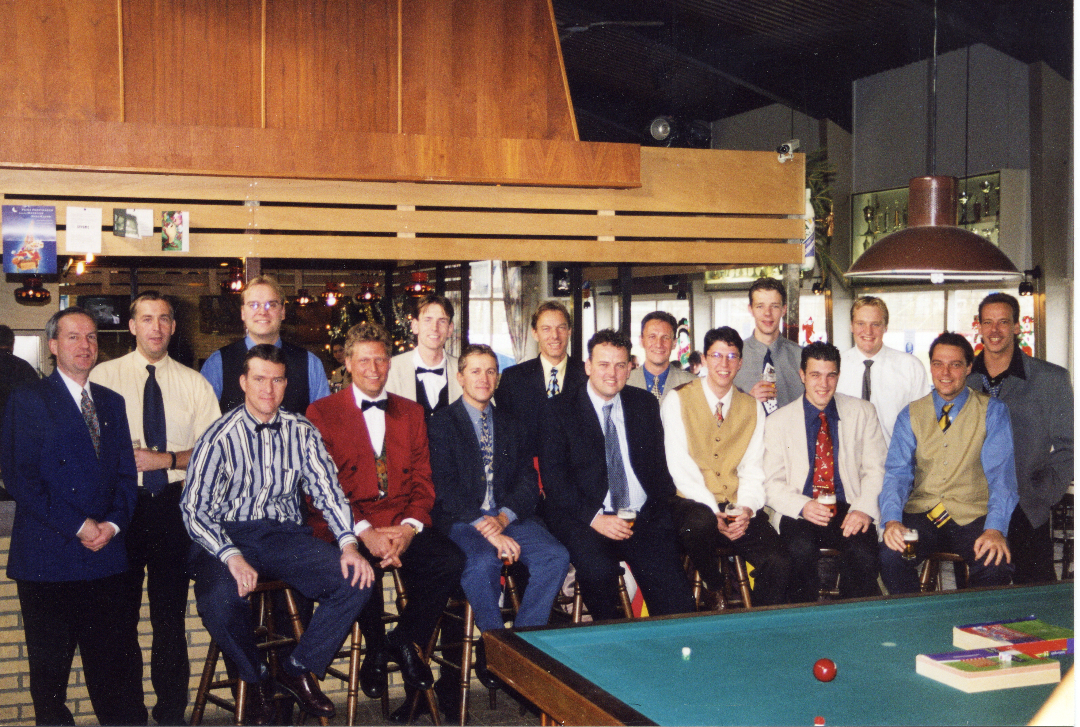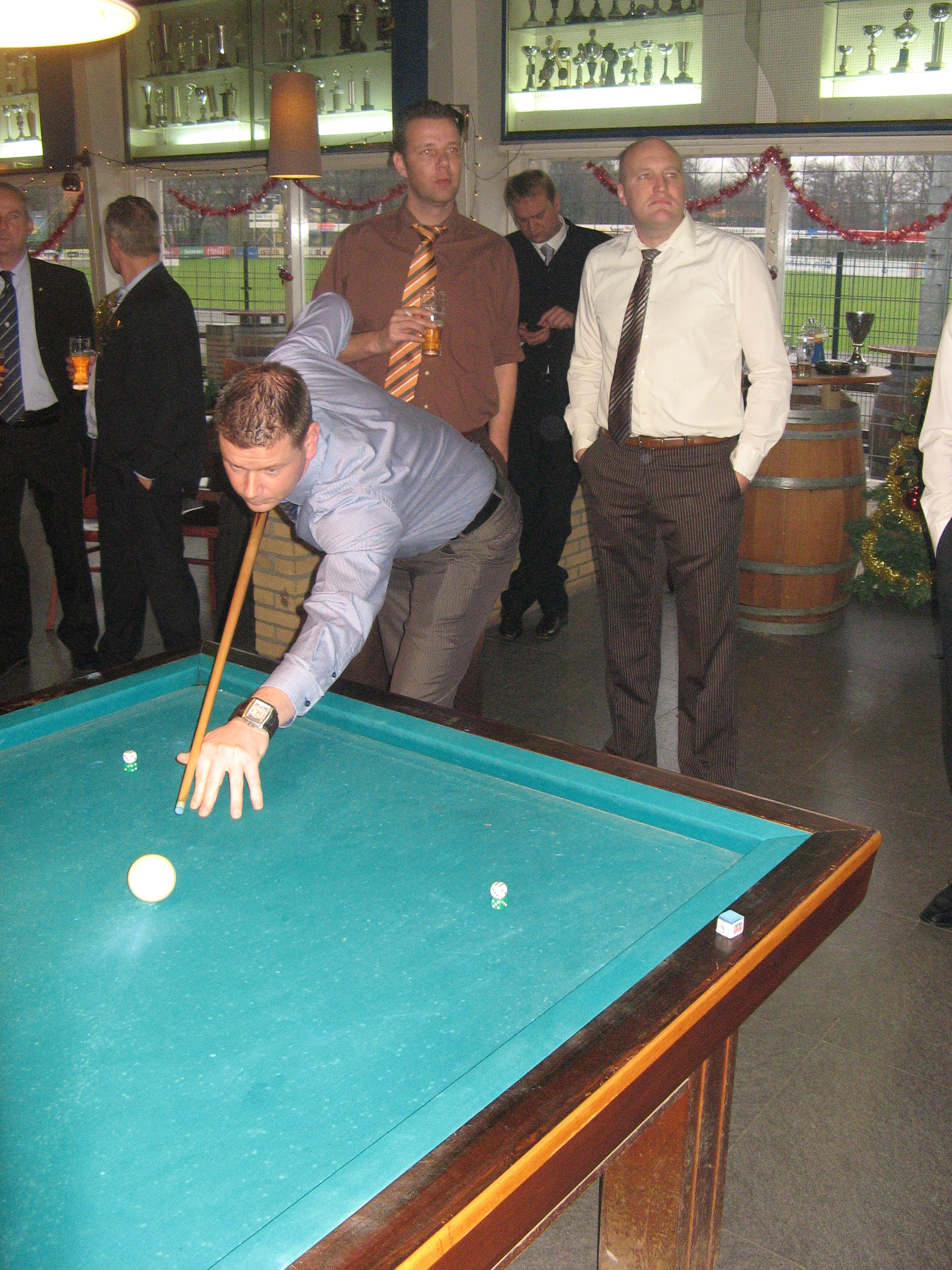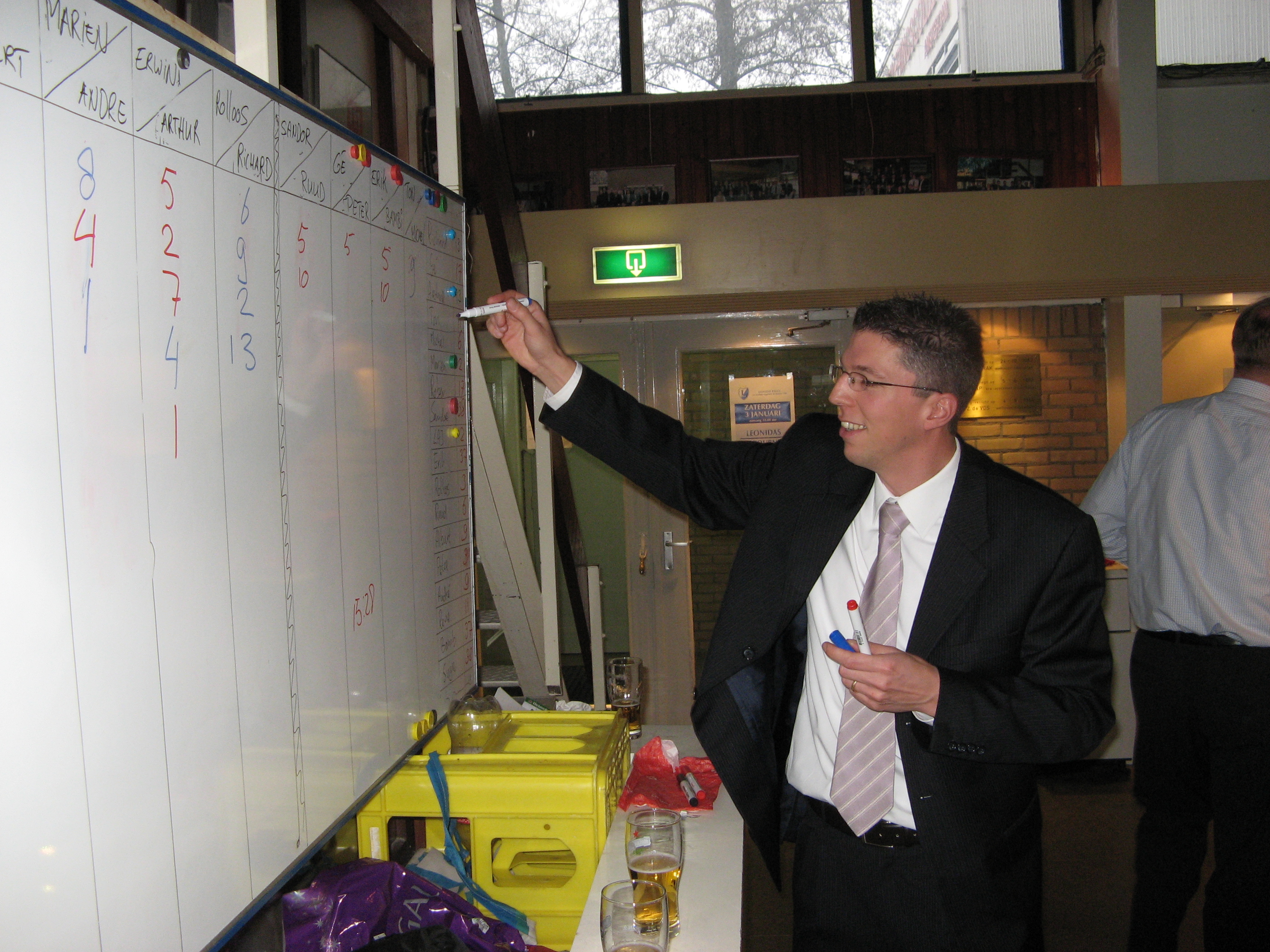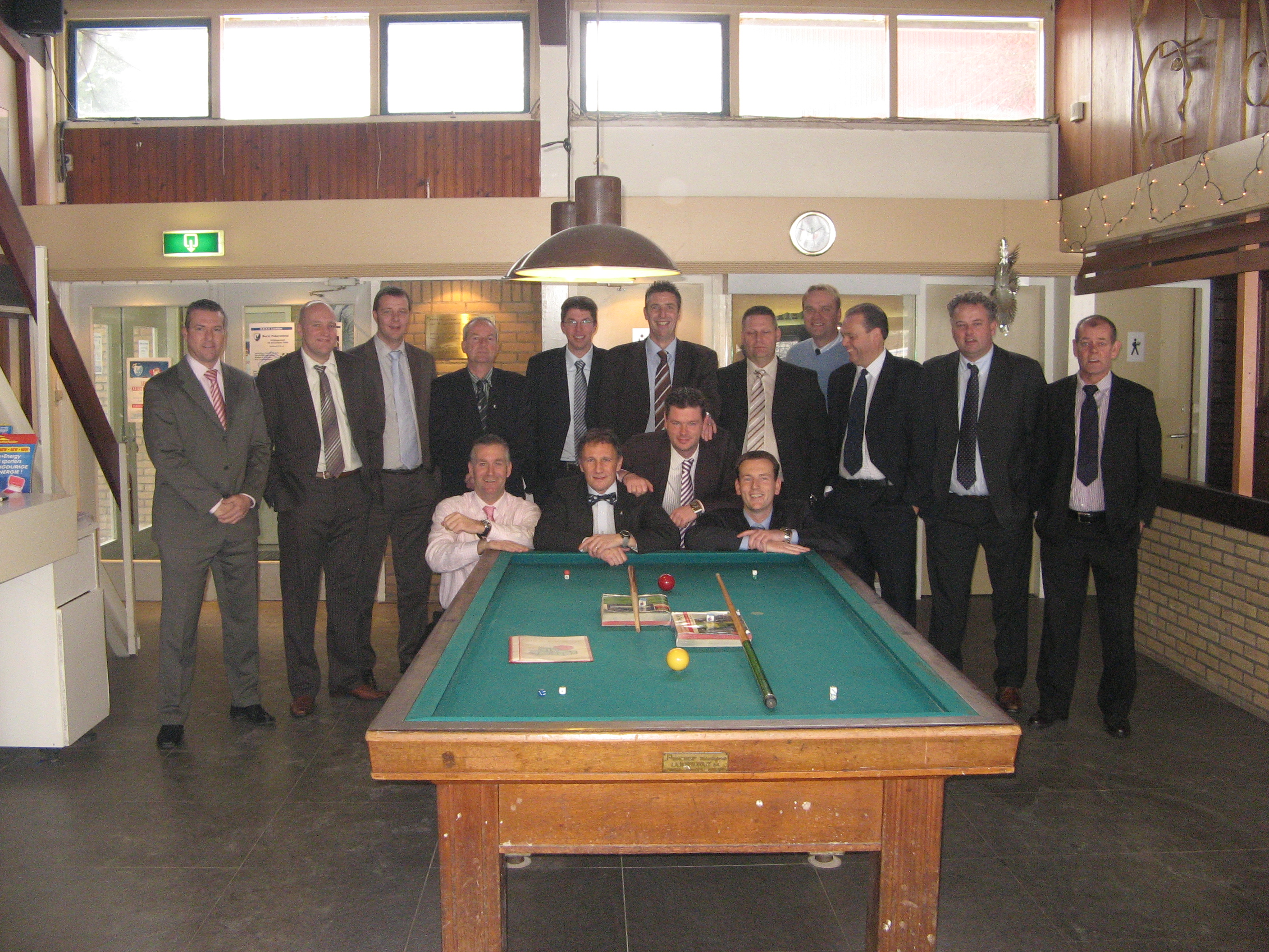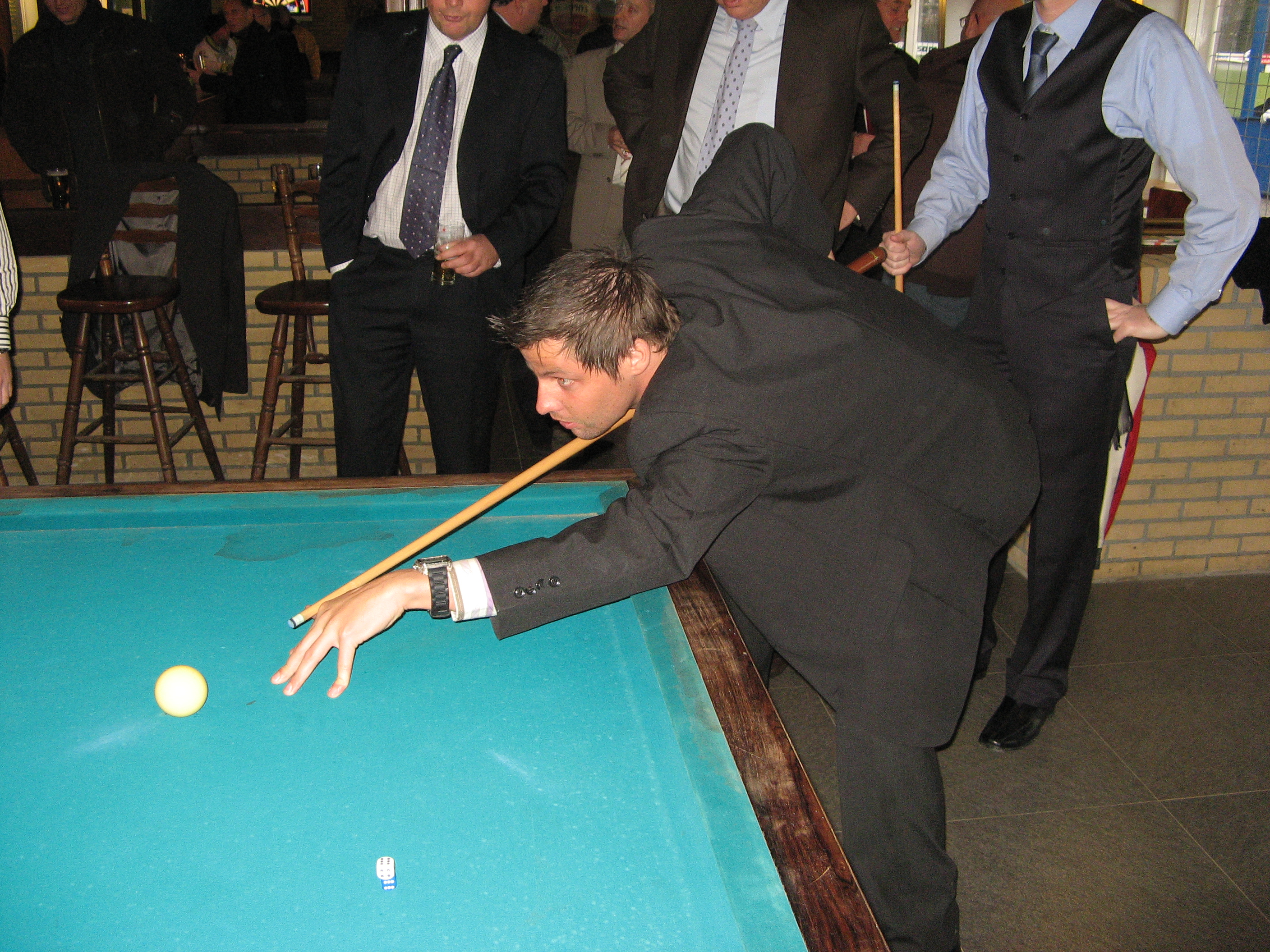 Verdere details zal ik hier niet geven, maar voor de echt geïnteresseerden zijn de spelregels in een heus spelregelboek verzameld en bovendien bent u natuurlijk van harte welkom vlak voor de Kerst. U komt er dan bijvoorbeeld achter dat het zogenaamde scoopen niet verboden is, maar door de echte vijfer verafschuwd wordt. Bij dit scoopen wordt de bal over de boeken “geschept” als er geen eenvoudige lijn naar de rode bal te vinden is. Topvijfers zijn immers niet alleen in staat zelf punten te scoren, maar ook een echte naaibal voor zijn tegenstander achter te laten. De echte vijfer vindt altijd een oplossing al moet hij over vele losse banden en langs de nodige wiebelende dobbelstenen. In dit boek uiteraard ook de spelregel wanneer het spel afgelopen is en nog belangrijker wat dit betekent voor de speler met de laagste score: bier halen voor de overige deelnemers aan het spel! Om geld is gelukkig nog nooit gespeeld. Al snel werd besloten dat er naast het wekelijkse bier eenmaal per jaar om de eer zou worden gespeeld om je een jaar lang de beste “vijfer” van Leonidas te mogen noemen. En laten we niet te bescheiden zijn: beste “vijfer” van Leonidas betekent in de praktijk beste “vijfer” ter wereld. Kortom, in het kader waar u de winnaars van dit jaarlijkse evenement aantreft, leest u eigenlijk een hele rij wereldkampioenen die Leonidas heeft voortgebracht.Zo ontstond, gelijk met de opkomst op tv van het snookeren en hun Masters toernooi, de Leonidas Masters. En hoewel onvergelijkbaar toch ook met een paar opvallende vergelijkbare kenmerken. Zo verschenen er bij de Leonidas Masters plotseling ook de uit het snooker bekende hulpstukken, waarop de speler de keu kon laten rusten als hij met zijn eigen handen onvoldoende kon ondersteunen. En daar waar er in het snooker kwijlend over een maximum break van 147 werd gesproken droomden de vijfers van een “topknol”, een stoot waarbij in 1 keer alle groene dobbelstenen om gingen. Na het overlijden van Hans Hollander, linkerspits van het vijfde, medebedenker van het spel en voor vele vijfers ook op andere vlakken een belangrijke bron van inspiratie, werden de Masters direct als eerbetoon in de “Hollander Masters” omgedoopt.
