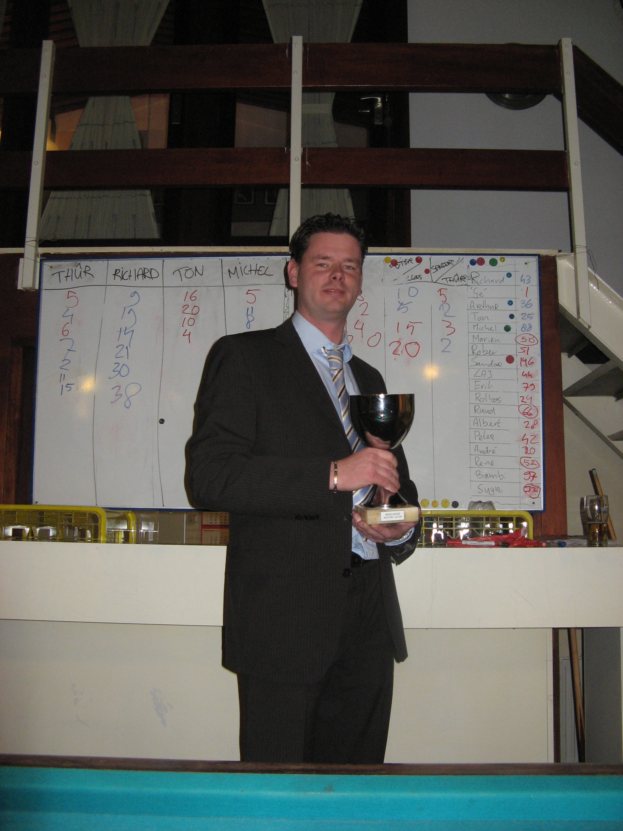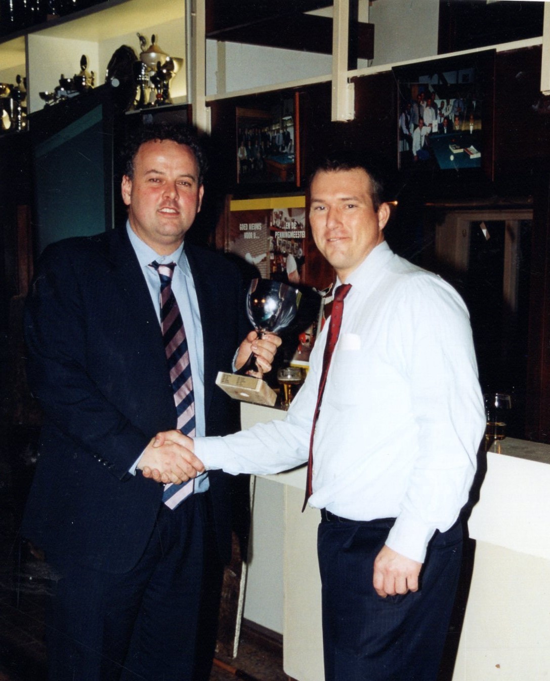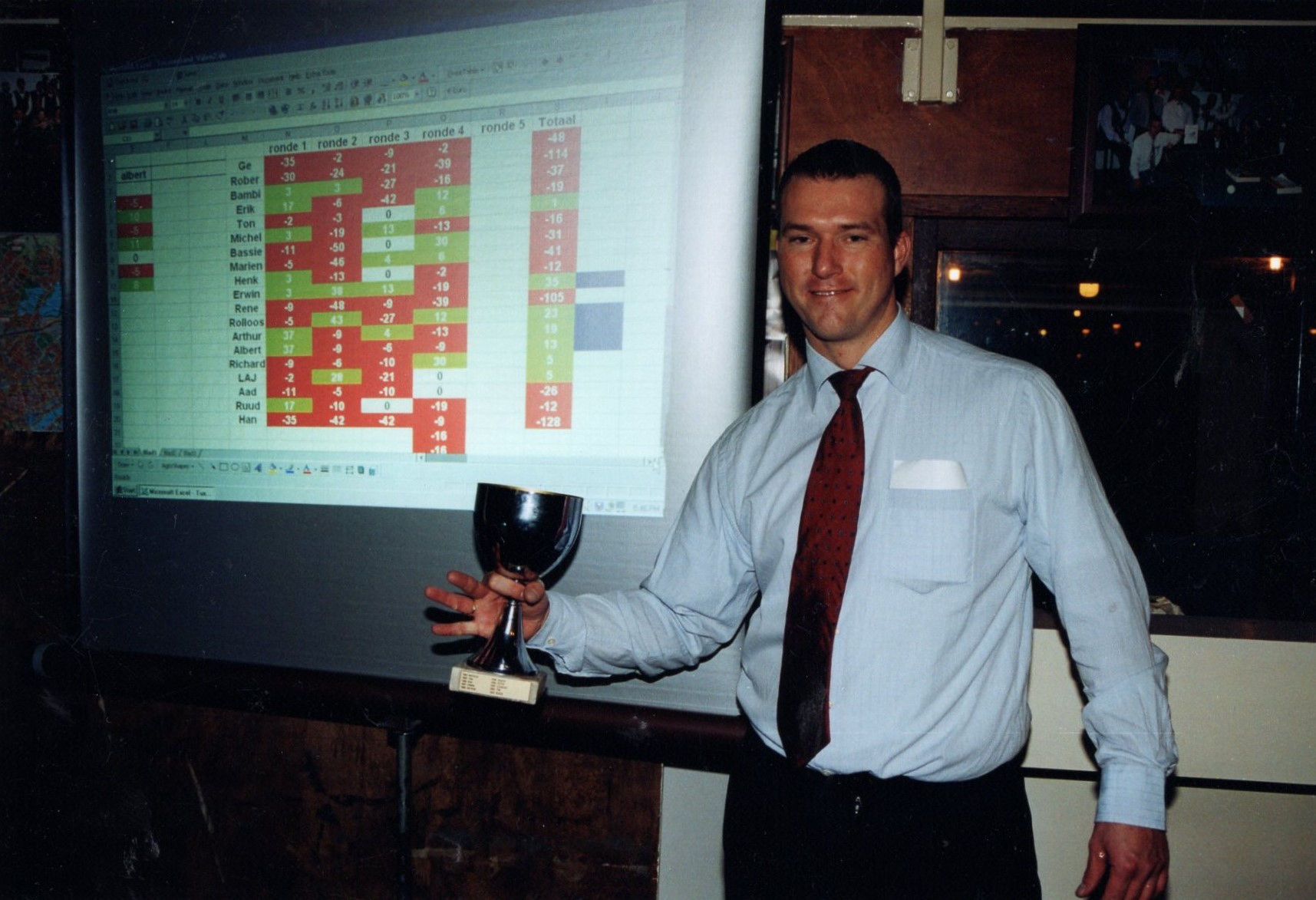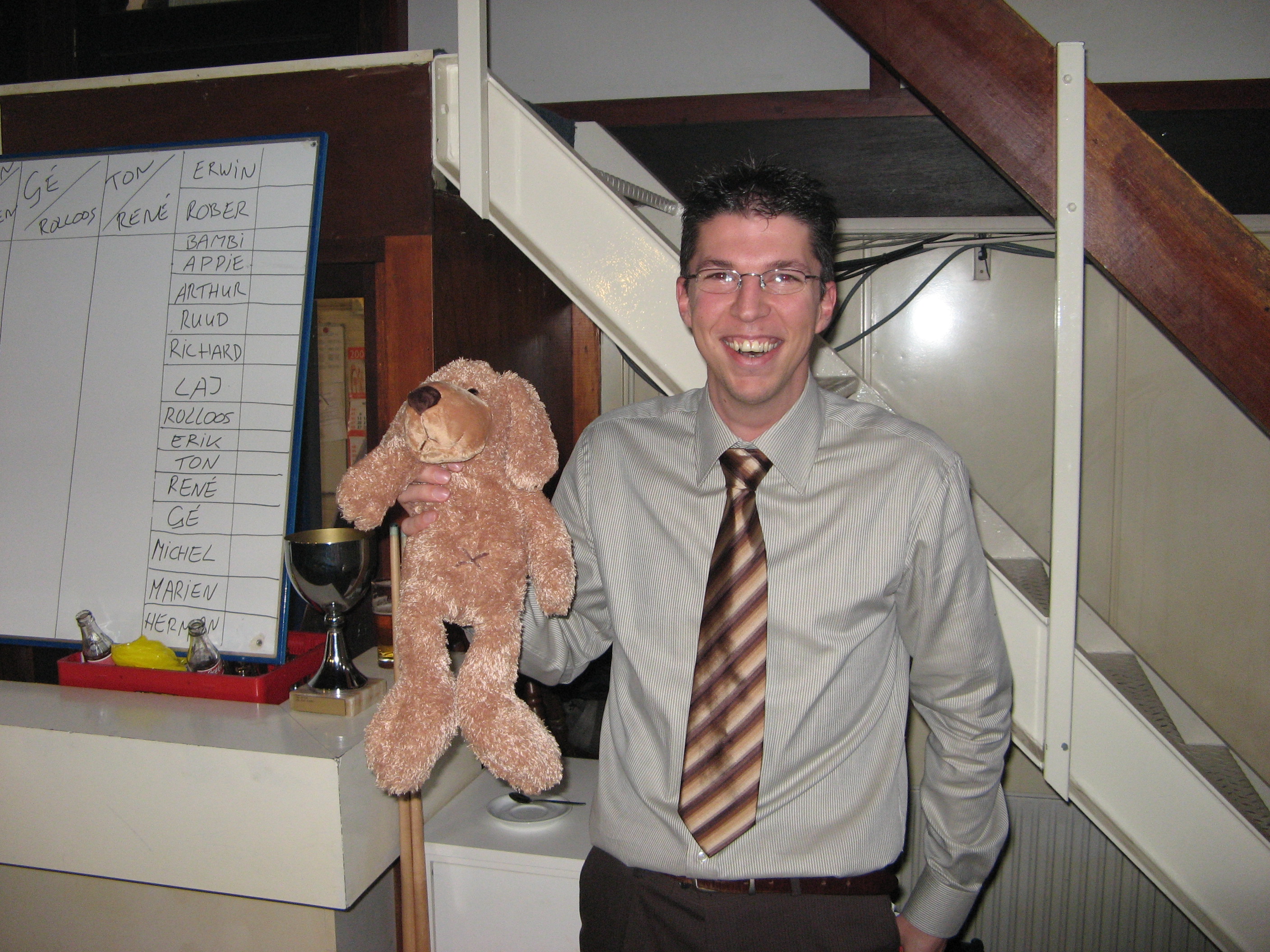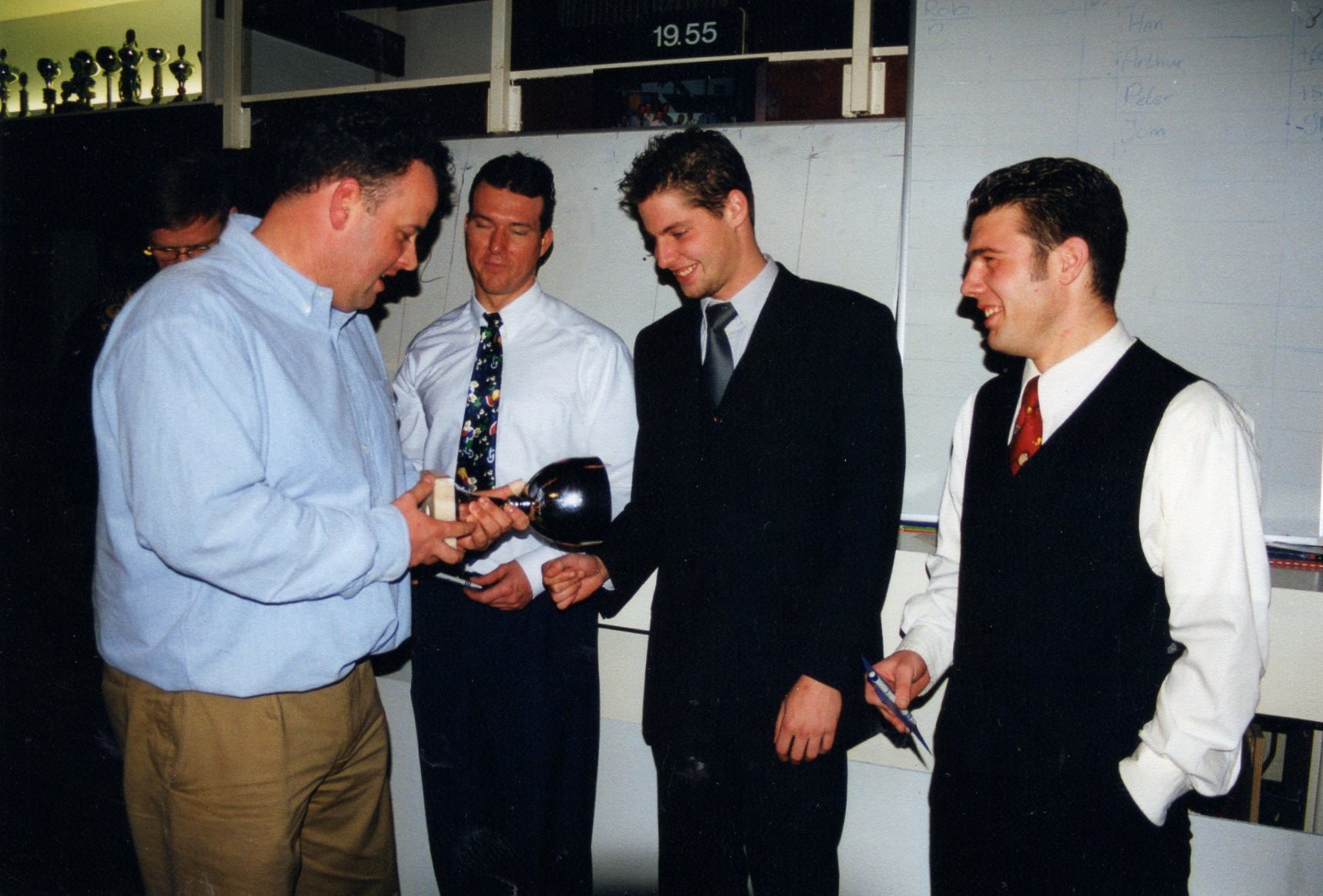 Verdere details zal ik hier niet geven, maar voor de echt geïnteresseerden zijn de spelregels in een heus spelregelboek verzameld en bovendien bent u natuurlijk van harte welkom vlak voor de Kerst. U komt er dan bijvoorbeeld achter dat het zogenaamde scoopen niet verboden is, maar door de echte vijfer verafschuwd wordt. Bij dit scoopen wordt de bal over de boeken “geschept” als er geen eenvoudige lijn naar de rode bal te vinden is. Topvijfers zijn immers niet alleen in staat zelf punten te scoren, maar ook een echte naaibal voor zijn tegenstander achter te laten. De echte vijfer vindt altijd een oplossing al moet hij over vele losse banden en langs de nodige wiebelende dobbelstenen. In dit boek uiteraard ook de spelregel wanneer het spel afgelopen is en nog belangrijker wat dit betekent voor de speler met de laagste score: bier halen voor de overige deelnemers aan het spel! Om geld is gelukkig nog nooit gespeeld. Al snel werd besloten dat er naast het wekelijkse bier eenmaal per jaar om de eer zou worden gespeeld om je een jaar lang de beste “vijfer” van Leonidas te mogen noemen. En laten we niet te bescheiden zijn: beste “vijfer” van Leonidas betekent in de praktijk beste “vijfer” ter wereld. Kortom, in het kader waar u de winnaars van dit jaarlijkse evenement aantreft, leest u eigenlijk een hele rij wereldkampioenen die Leonidas heeft voortgebracht.Zo ontstond, gelijk met de opkomst op tv van het snookeren en hun Masters toernooi, de Leonidas Masters. En hoewel onvergelijkbaar toch ook met een paar opvallende vergelijkbare kenmerken. Zo verschenen er bij de Leonidas Masters plotseling ook de uit het snooker bekende hulpstukken, waarop de speler de keu kon laten rusten als hij met zijn eigen handen onvoldoende kon ondersteunen. En daar waar er in het snooker kwijlend over een maximum break van 147 werd gesproken droomden de vijfers van een “topknol”, een stoot waarbij in 1 keer alle groene dobbelstenen om gingen. Na het overlijden van Hans Hollander, linkerspits van het vijfde, medebedenker van het spel en voor vele vijfers ook op andere vlakken een belangrijke bron van inspiratie, werden de Masters direct als eerbetoon in de “Hollander Masters” omgedoopt.