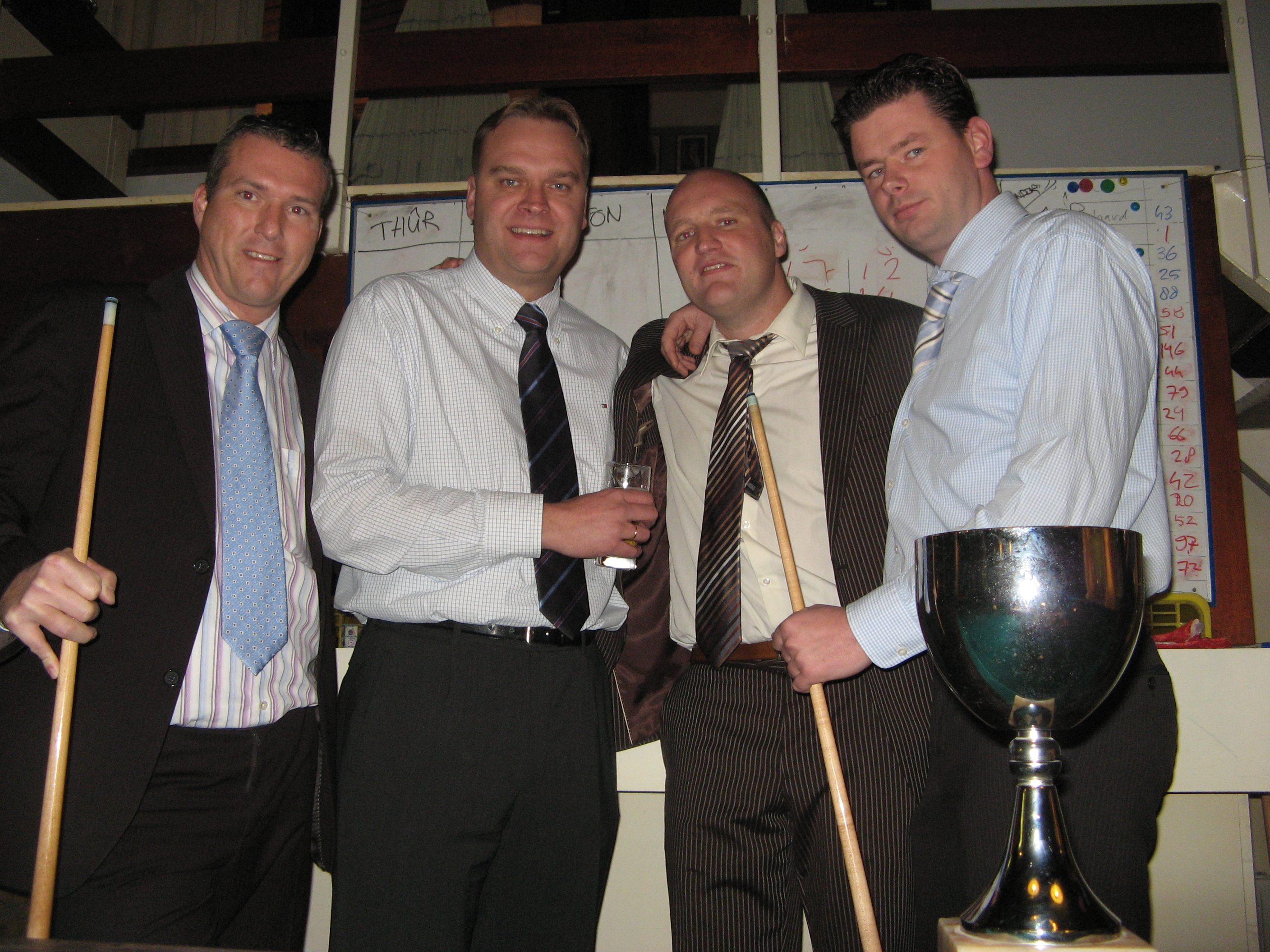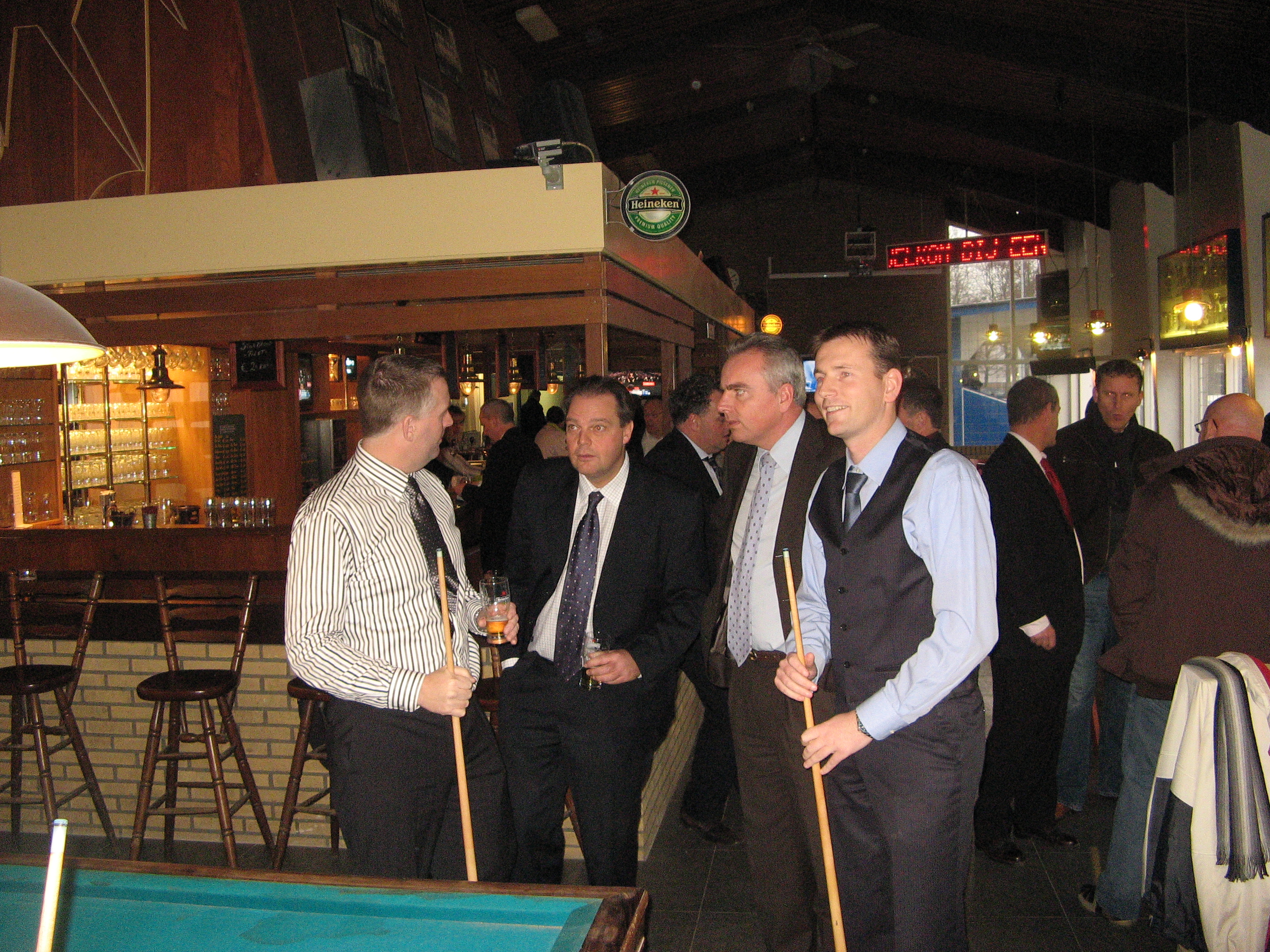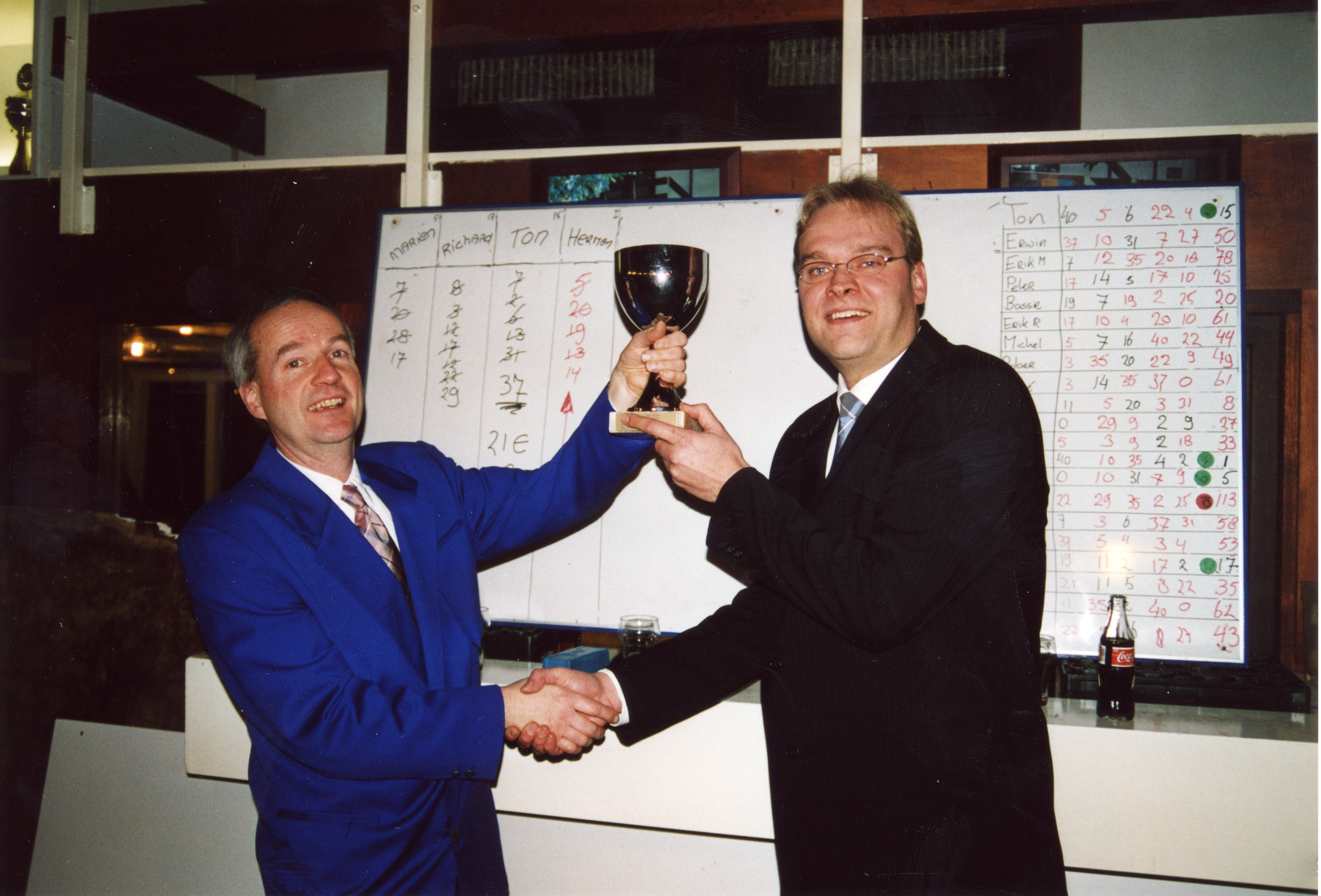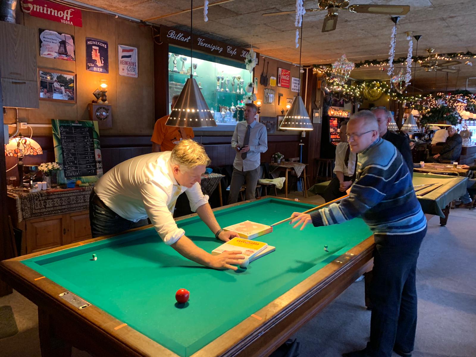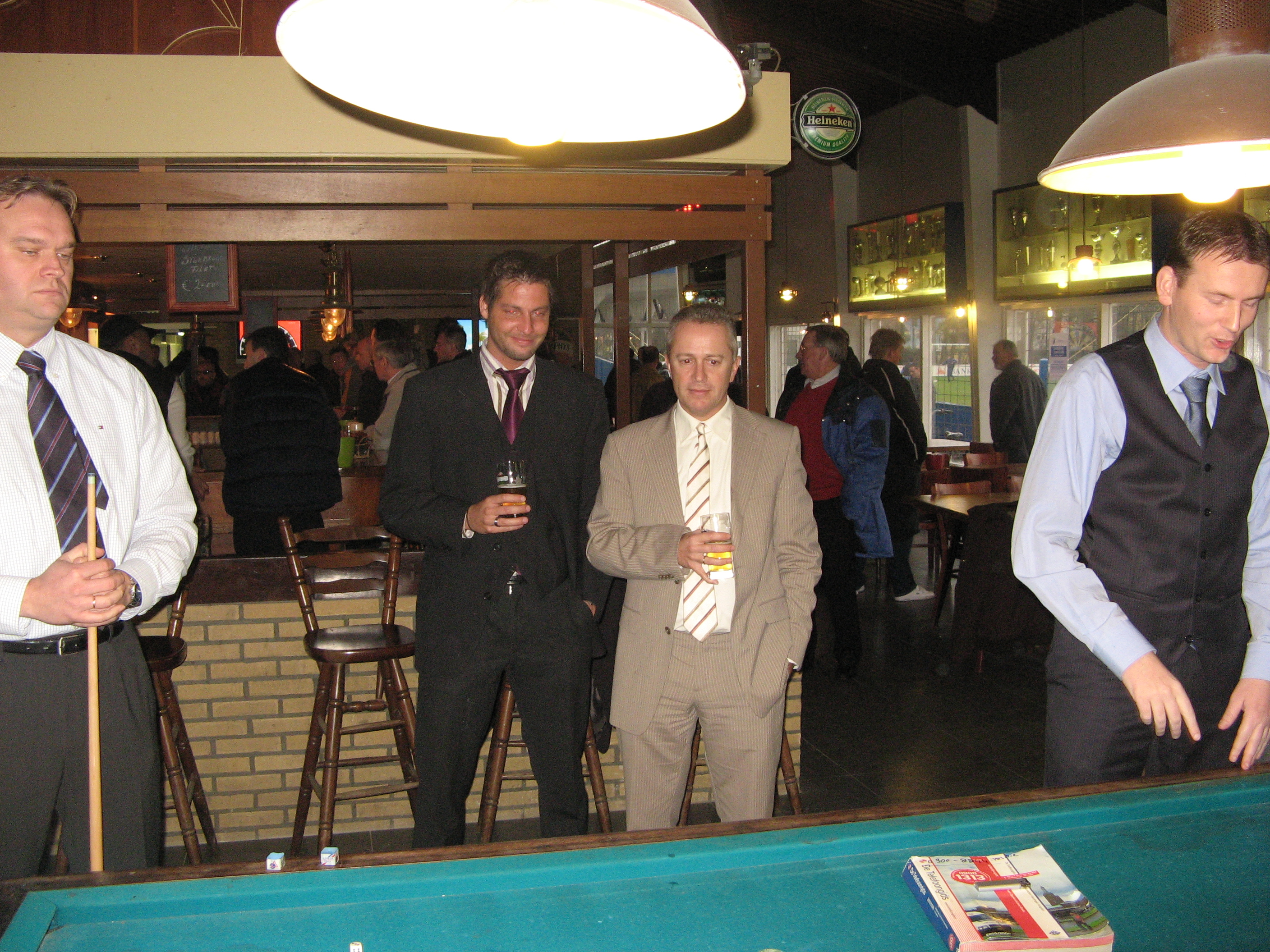 Verdere details zal ik hier niet geven, maar voor de echt geïnteresseerden zijn de spelregels in een heus spelregelboek verzameld en bovendien bent u natuurlijk van harte welkom vlak voor de Kerst. U komt er dan bijvoorbeeld achter dat het zogenaamde scoopen niet verboden is, maar door de echte vijfer verafschuwd wordt. Bij dit scoopen wordt de bal over de boeken “geschept” als er geen eenvoudige lijn naar de rode bal te vinden is. Topvijfers zijn immers niet alleen in staat zelf punten te scoren, maar ook een echte naaibal voor zijn tegenstander achter te laten. De echte vijfer vindt altijd een oplossing al moet hij over vele losse banden en langs de nodige wiebelende dobbelstenen. In dit boek uiteraard ook de spelregel wanneer het spel afgelopen is en nog belangrijker wat dit betekent voor de speler met de laagste score: bier halen voor de overige deelnemers aan het spel! Om geld is gelukkig nog nooit gespeeld. Al snel werd besloten dat er naast het wekelijkse bier eenmaal per jaar om de eer zou worden gespeeld om je een jaar lang de beste “vijfer” van Leonidas te mogen noemen. En laten we niet te bescheiden zijn: beste “vijfer” van Leonidas betekent in de praktijk beste “vijfer” ter wereld. Kortom, in het kader waar u de winnaars van dit jaarlijkse evenement aantreft, leest u eigenlijk een hele rij wereldkampioenen die Leonidas heeft voortgebracht.Zo ontstond, gelijk met de opkomst op tv van het snookeren en hun Masters toernooi, de Leonidas Masters. En hoewel onvergelijkbaar toch ook met een paar opvallende vergelijkbare kenmerken. Zo verschenen er bij de Leonidas Masters plotseling ook de uit het snooker bekende hulpstukken, waarop de speler de keu kon laten rusten als hij met zijn eigen handen onvoldoende kon ondersteunen. En daar waar er in het snooker kwijlend over een maximum break van 147 werd gesproken droomden de vijfers van een “topknol”, een stoot waarbij in 1 keer alle groene dobbelstenen om gingen. Na het overlijden van Hans Hollander, linkerspits van het vijfde, medebedenker van het spel en voor vele vijfers ook op andere vlakken een belangrijke bron van inspiratie, werden de Masters direct als eerbetoon in de “Hollander Masters” omgedoopt.