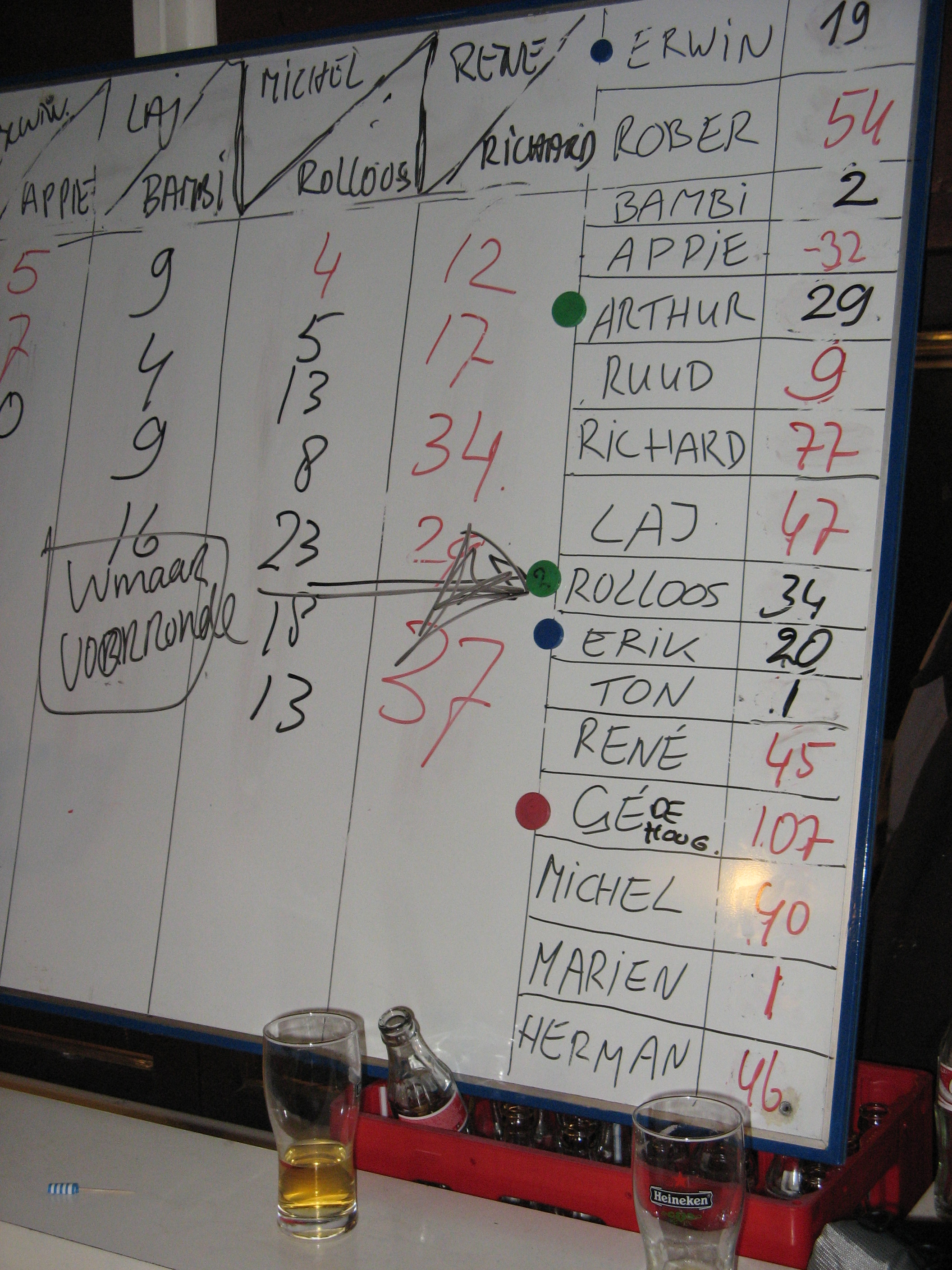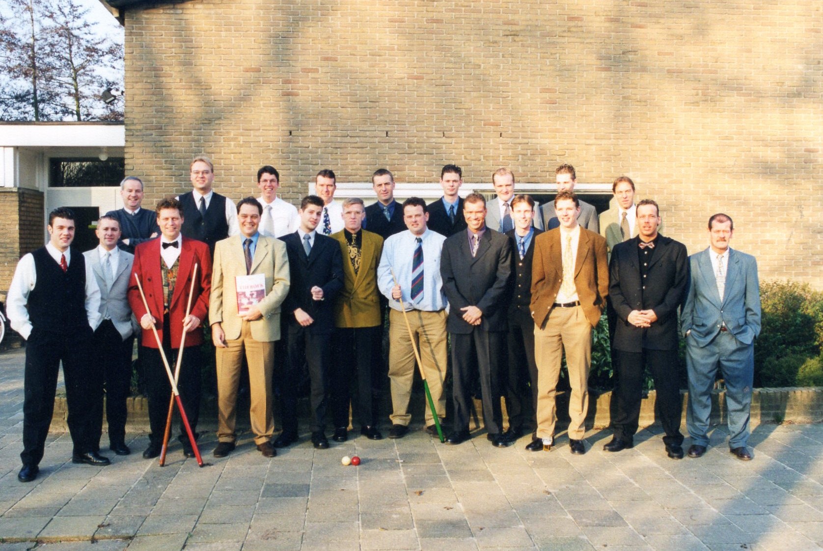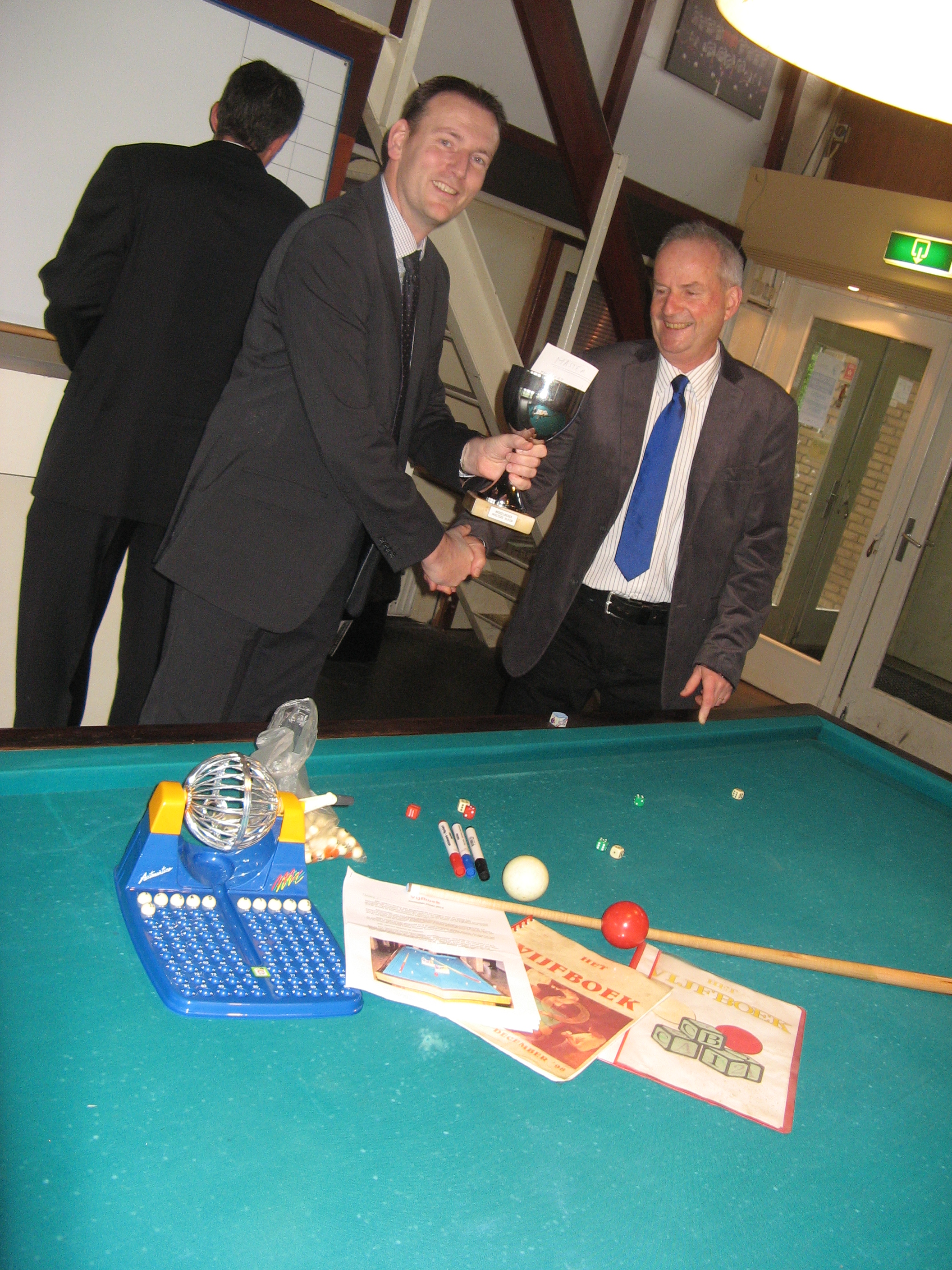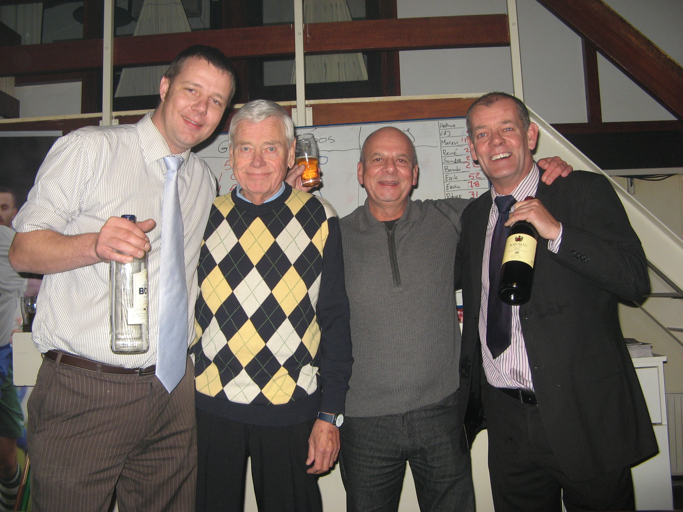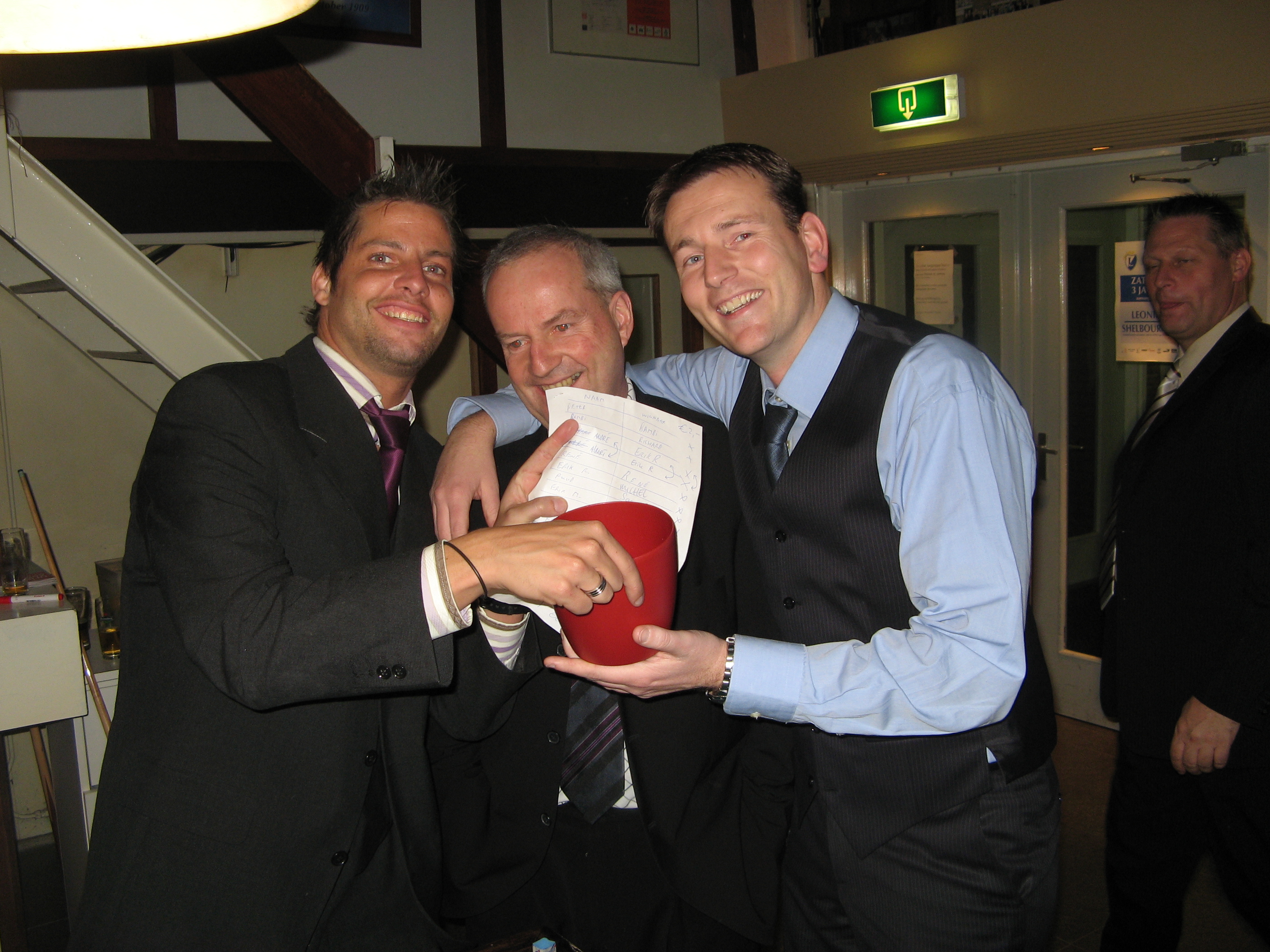 Verdere details zal ik hier niet geven, maar voor de echt geïnteresseerden zijn de spelregels in een heus spelregelboek verzameld en bovendien bent u natuurlijk van harte welkom vlak voor de Kerst. U komt er dan bijvoorbeeld achter dat het zogenaamde scoopen niet verboden is, maar door de echte vijfer verafschuwd wordt. Bij dit scoopen wordt de bal over de boeken “geschept” als er geen eenvoudige lijn naar de rode bal te vinden is. Topvijfers zijn immers niet alleen in staat zelf punten te scoren, maar ook een echte naaibal voor zijn tegenstander achter te laten. De echte vijfer vindt altijd een oplossing al moet hij over vele losse banden en langs de nodige wiebelende dobbelstenen. In dit boek uiteraard ook de spelregel wanneer het spel afgelopen is en nog belangrijker wat dit betekent voor de speler met de laagste score: bier halen voor de overige deelnemers aan het spel! Om geld is gelukkig nog nooit gespeeld. Al snel werd besloten dat er naast het wekelijkse bier eenmaal per jaar om de eer zou worden gespeeld om je een jaar lang de beste “vijfer” van Leonidas te mogen noemen. En laten we niet te bescheiden zijn: beste “vijfer” van Leonidas betekent in de praktijk beste “vijfer” ter wereld. Kortom, in het kader waar u de winnaars van dit jaarlijkse evenement aantreft, leest u eigenlijk een hele rij wereldkampioenen die Leonidas heeft voortgebracht.Zo ontstond, gelijk met de opkomst op tv van het snookeren en hun Masters toernooi, de Leonidas Masters. En hoewel onvergelijkbaar toch ook met een paar opvallende vergelijkbare kenmerken. Zo verschenen er bij de Leonidas Masters plotseling ook de uit het snooker bekende hulpstukken, waarop de speler de keu kon laten rusten als hij met zijn eigen handen onvoldoende kon ondersteunen. En daar waar er in het snooker kwijlend over een maximum break van 147 werd gesproken droomden de vijfers van een “topknol”, een stoot waarbij in 1 keer alle groene dobbelstenen om gingen. Na het overlijden van Hans Hollander, linkerspits van het vijfde, medebedenker van het spel en voor vele vijfers ook op andere vlakken een belangrijke bron van inspiratie, werden de Masters direct als eerbetoon in de “Hollander Masters” omgedoopt.
