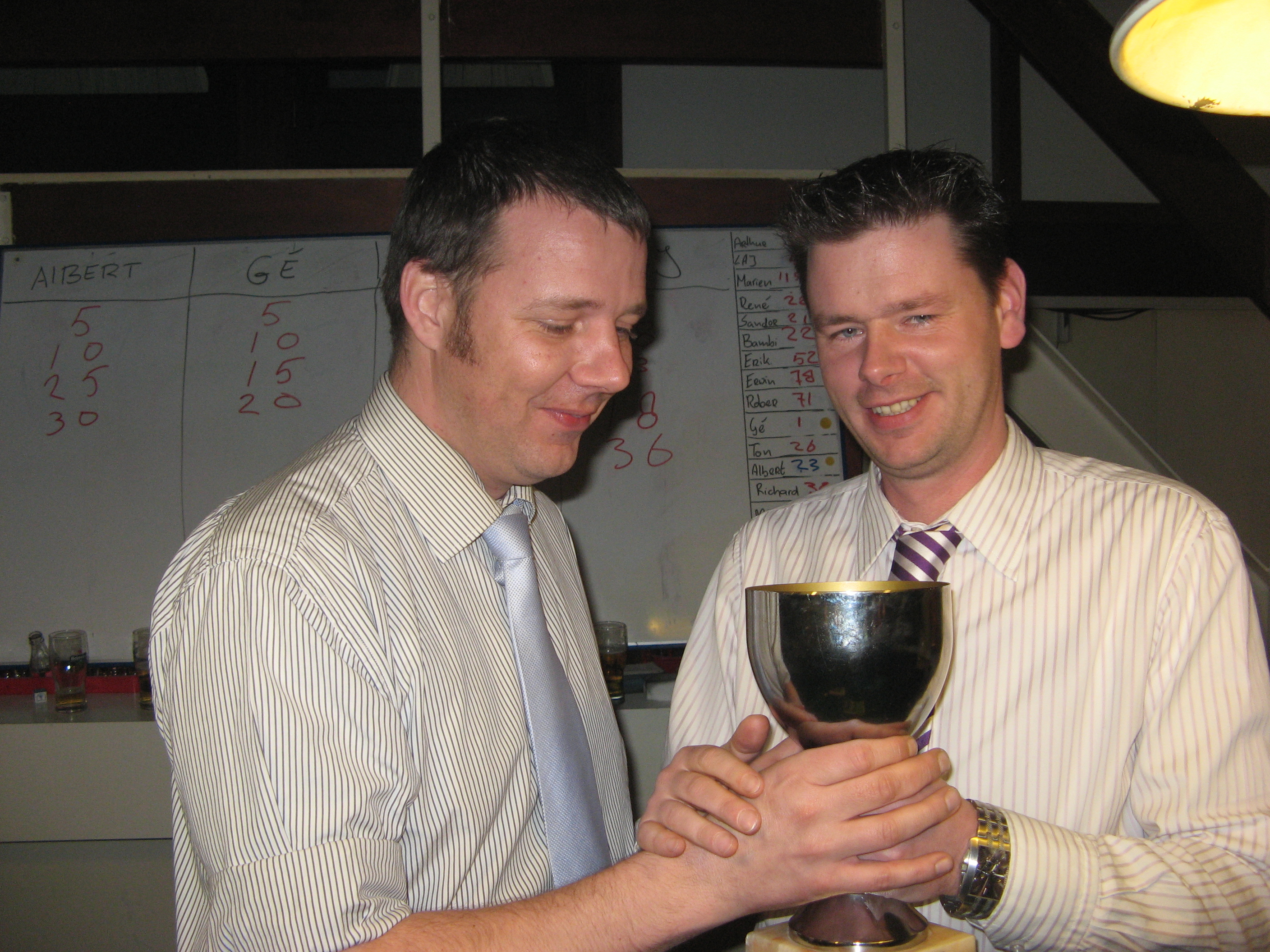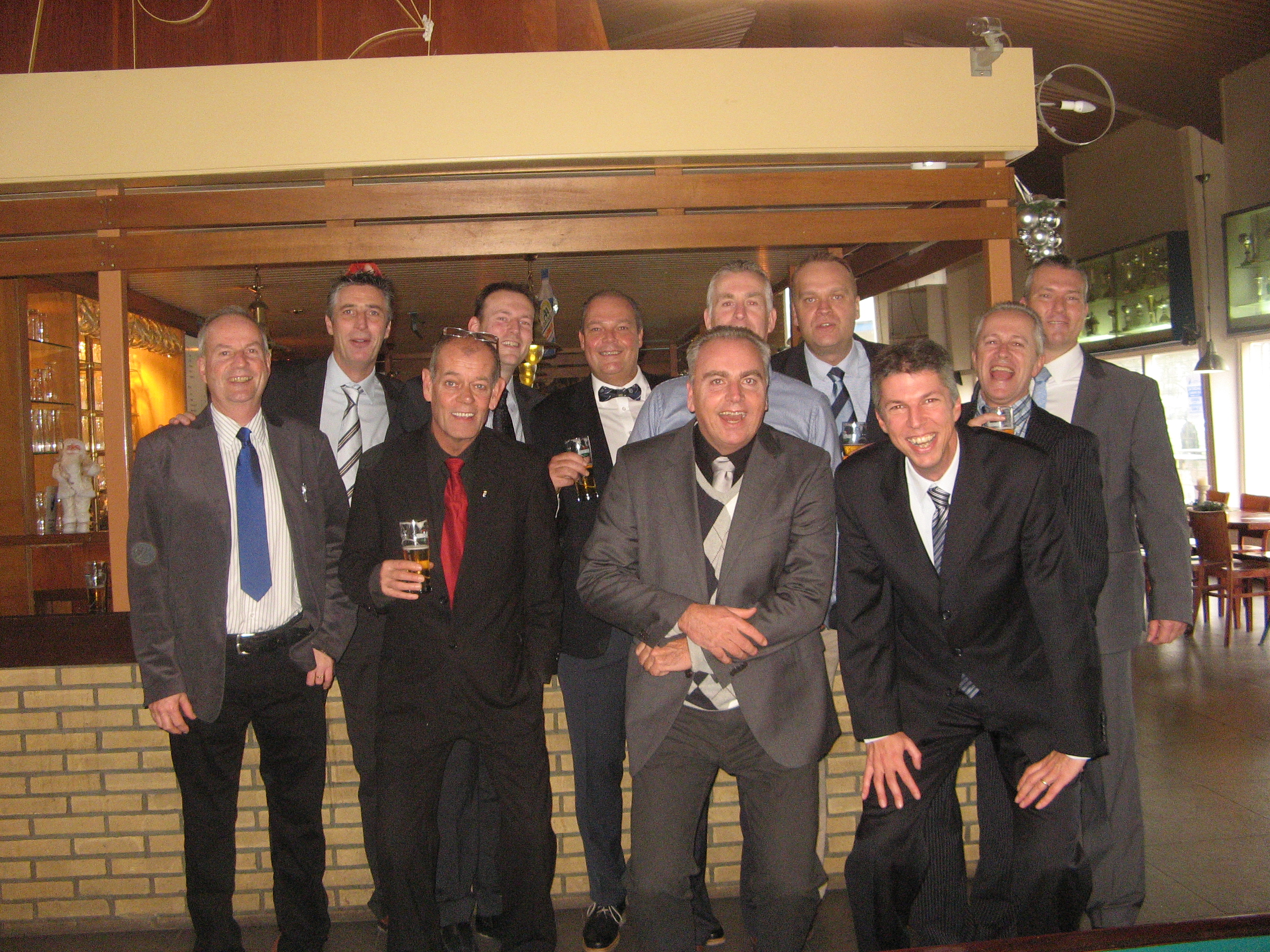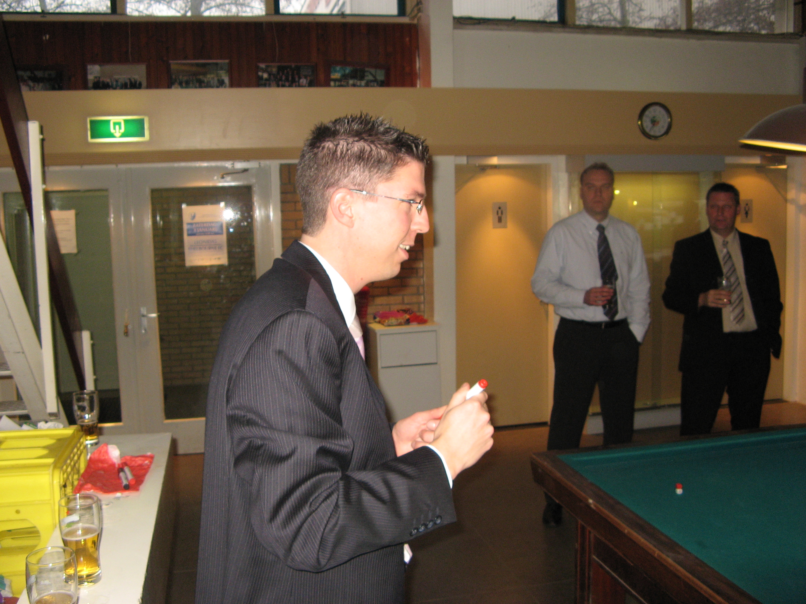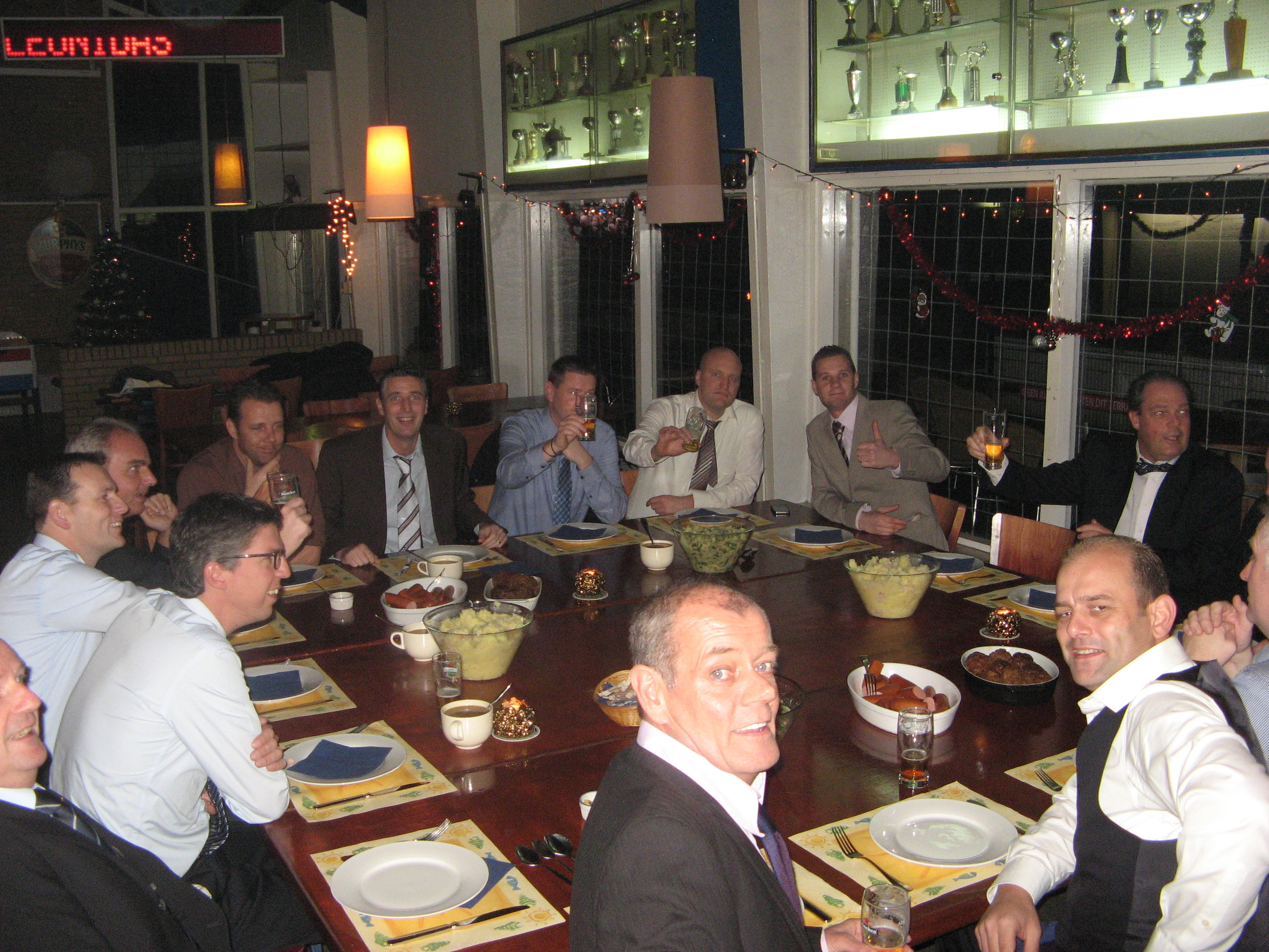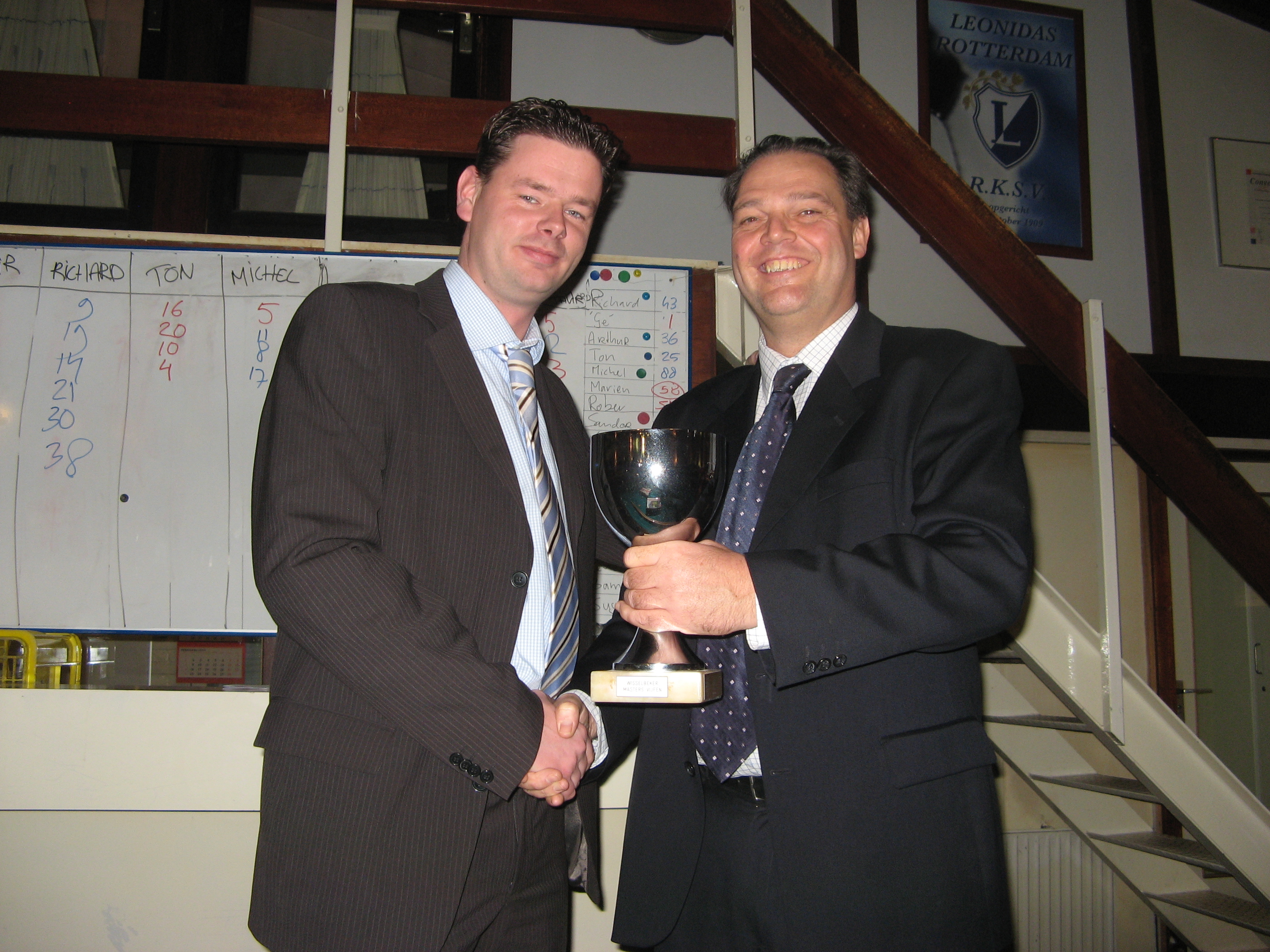 Verdere details zal ik hier niet geven, maar voor de echt geïnteresseerden zijn de spelregels in een heus spelregelboek verzameld en bovendien bent u natuurlijk van harte welkom vlak voor de Kerst. U komt er dan bijvoorbeeld achter dat het zogenaamde scoopen niet verboden is, maar door de echte vijfer verafschuwd wordt. Bij dit scoopen wordt de bal over de boeken “geschept” als er geen eenvoudige lijn naar de rode bal te vinden is. Topvijfers zijn immers niet alleen in staat zelf punten te scoren, maar ook een echte naaibal voor zijn tegenstander achter te laten. De echte vijfer vindt altijd een oplossing al moet hij over vele losse banden en langs de nodige wiebelende dobbelstenen. In dit boek uiteraard ook de spelregel wanneer het spel afgelopen is en nog belangrijker wat dit betekent voor de speler met de laagste score: bier halen voor de overige deelnemers aan het spel! Om geld is gelukkig nog nooit gespeeld. Al snel werd besloten dat er naast het wekelijkse bier eenmaal per jaar om de eer zou worden gespeeld om je een jaar lang de beste “vijfer” van Leonidas te mogen noemen. En laten we niet te bescheiden zijn: beste “vijfer” van Leonidas betekent in de praktijk beste “vijfer” ter wereld. Kortom, in het kader waar u de winnaars van dit jaarlijkse evenement aantreft, leest u eigenlijk een hele rij wereldkampioenen die Leonidas heeft voortgebracht.Zo ontstond, gelijk met de opkomst op tv van het snookeren en hun Masters toernooi, de Leonidas Masters. En hoewel onvergelijkbaar toch ook met een paar opvallende vergelijkbare kenmerken. Zo verschenen er bij de Leonidas Masters plotseling ook de uit het snooker bekende hulpstukken, waarop de speler de keu kon laten rusten als hij met zijn eigen handen onvoldoende kon ondersteunen. En daar waar er in het snooker kwijlend over een maximum break van 147 werd gesproken droomden de vijfers van een “topknol”, een stoot waarbij in 1 keer alle groene dobbelstenen om gingen. Na het overlijden van Hans Hollander, linkerspits van het vijfde, medebedenker van het spel en voor vele vijfers ook op andere vlakken een belangrijke bron van inspiratie, werden de Masters direct als eerbetoon in de “Hollander Masters” omgedoopt.