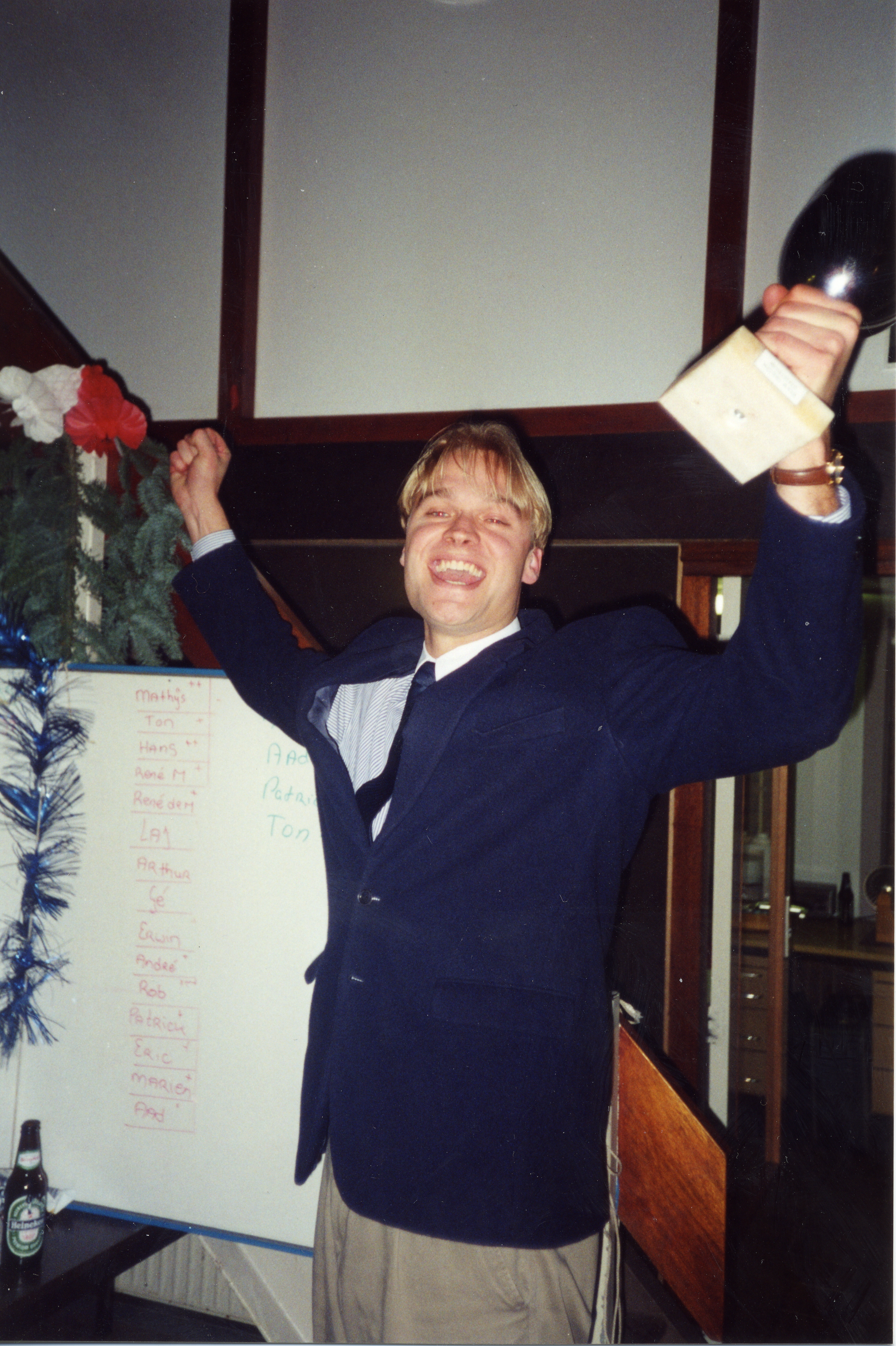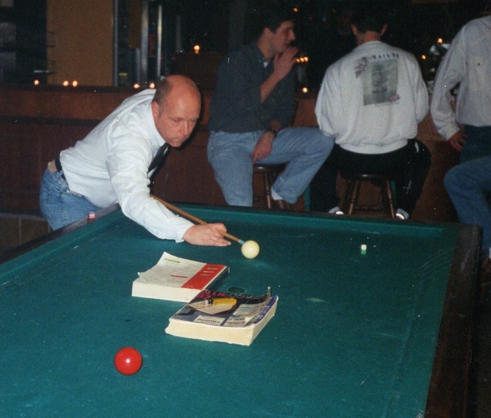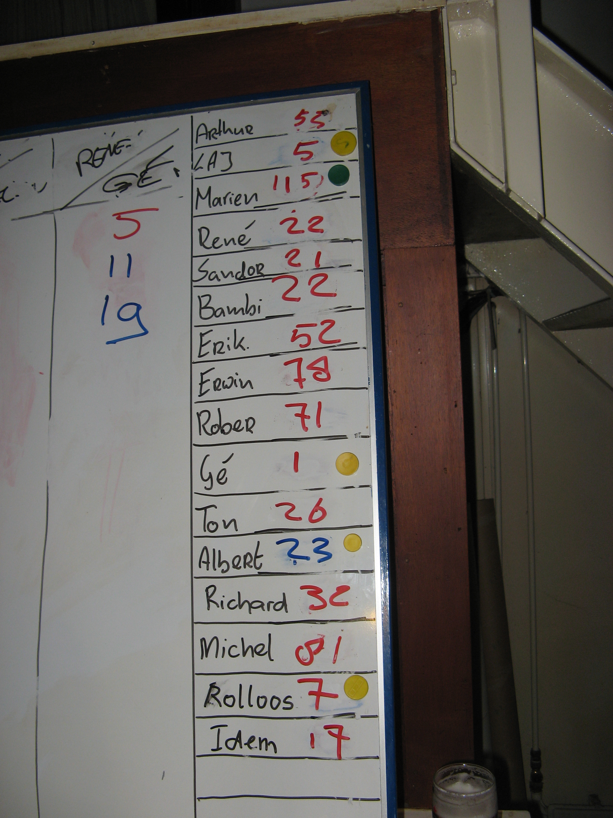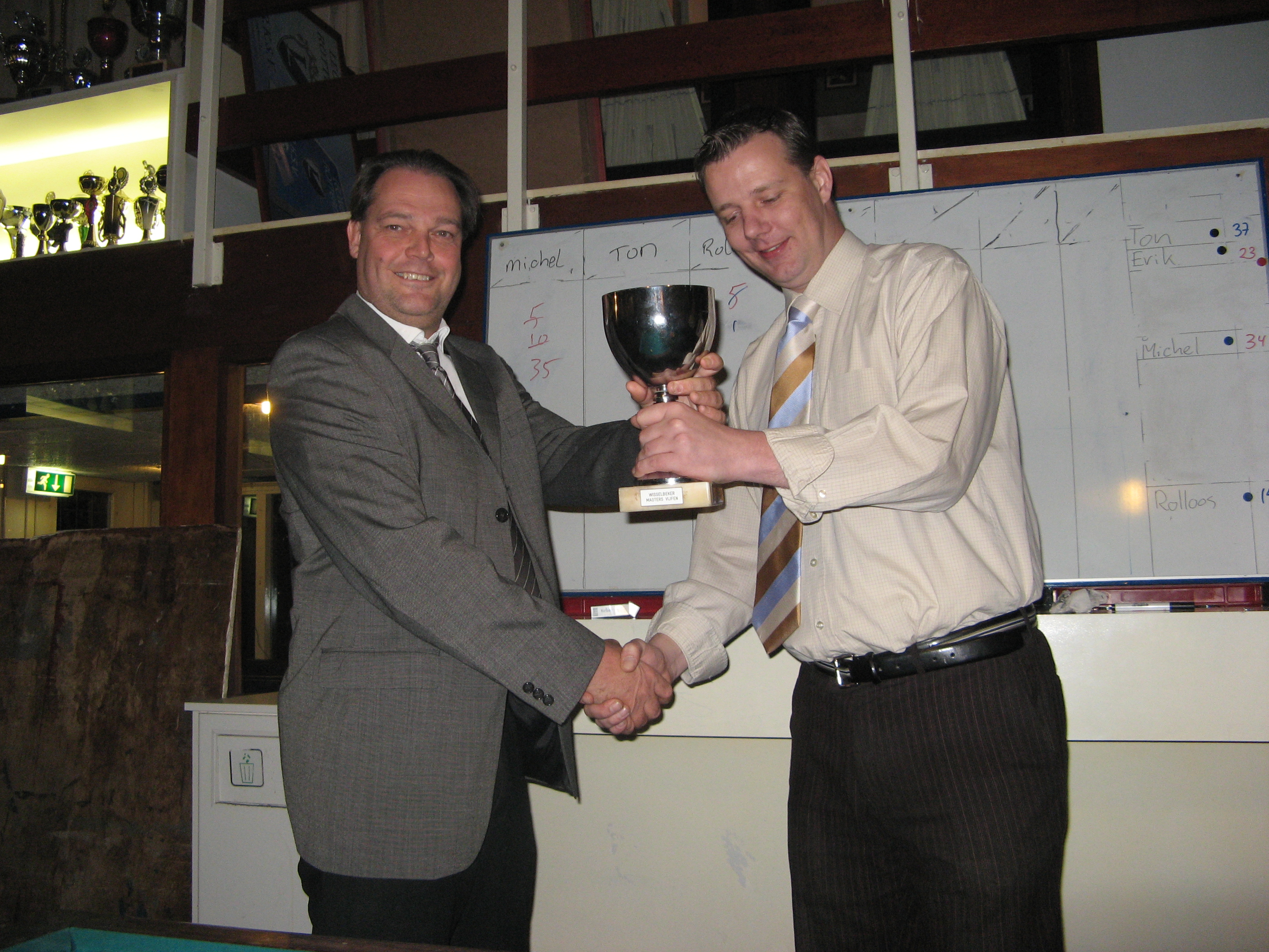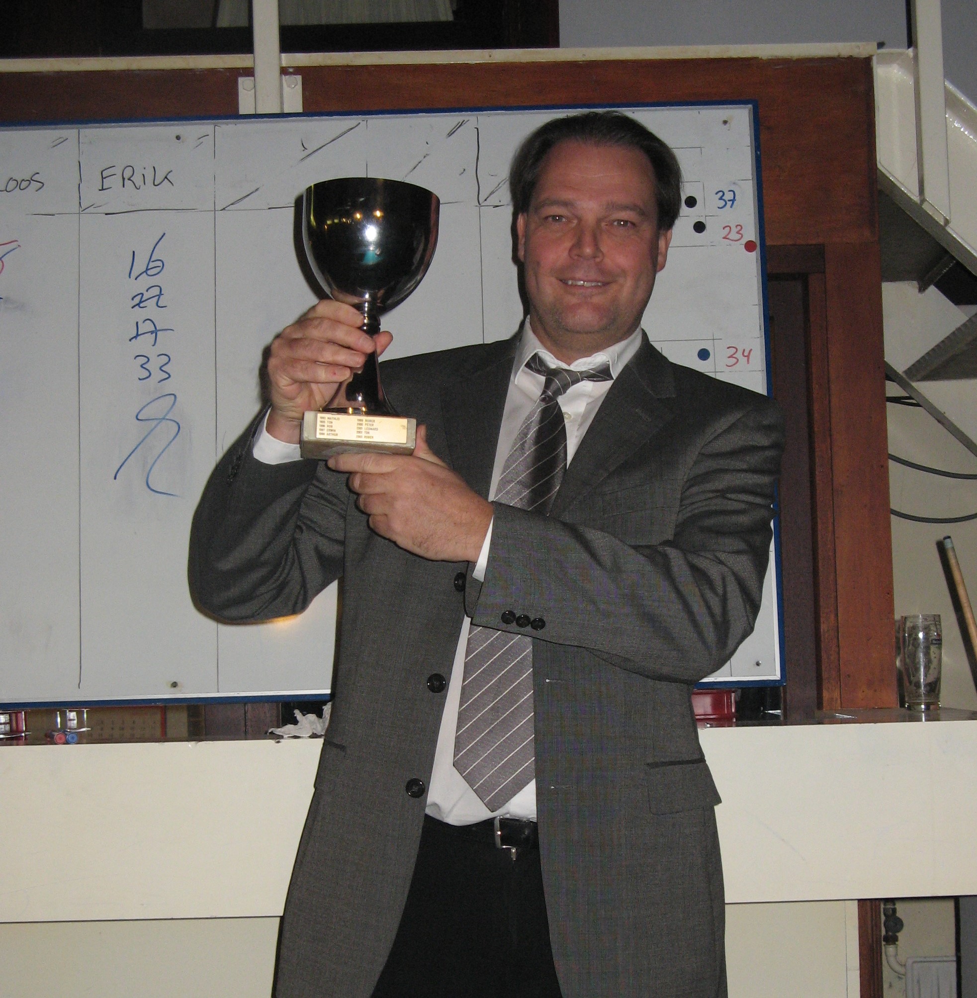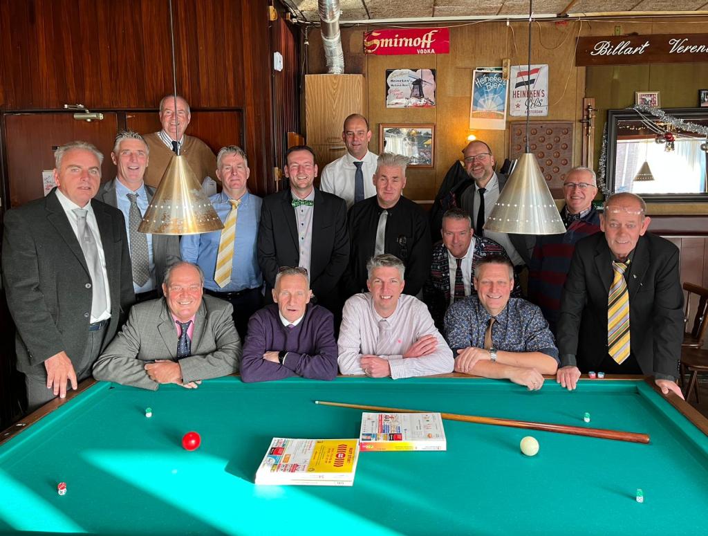 Verdere details zal ik hier niet geven, maar voor de echt geïnteresseerden zijn de spelregels in een heus spelregelboek verzameld en bovendien bent u natuurlijk van harte welkom vlak voor de Kerst. U komt er dan bijvoorbeeld achter dat het zogenaamde scoopen niet verboden is, maar door de echte vijfer verafschuwd wordt. Bij dit scoopen wordt de bal over de boeken “geschept” als er geen eenvoudige lijn naar de rode bal te vinden is. Topvijfers zijn immers niet alleen in staat zelf punten te scoren, maar ook een echte naaibal voor zijn tegenstander achter te laten. De echte vijfer vindt altijd een oplossing al moet hij over vele losse banden en langs de nodige wiebelende dobbelstenen. In dit boek uiteraard ook de spelregel wanneer het spel afgelopen is en nog belangrijker wat dit betekent voor de speler met de laagste score: bier halen voor de overige deelnemers aan het spel! Om geld is gelukkig nog nooit gespeeld. Al snel werd besloten dat er naast het wekelijkse bier eenmaal per jaar om de eer zou worden gespeeld om je een jaar lang de beste “vijfer” van Leonidas te mogen noemen. En laten we niet te bescheiden zijn: beste “vijfer” van Leonidas betekent in de praktijk beste “vijfer” ter wereld. Kortom, in het kader waar u de winnaars van dit jaarlijkse evenement aantreft, leest u eigenlijk een hele rij wereldkampioenen die Leonidas heeft voortgebracht.Zo ontstond, gelijk met de opkomst op tv van het snookeren en hun Masters toernooi, de Leonidas Masters. En hoewel onvergelijkbaar toch ook met een paar opvallende vergelijkbare kenmerken. Zo verschenen er bij de Leonidas Masters plotseling ook de uit het snooker bekende hulpstukken, waarop de speler de keu kon laten rusten als hij met zijn eigen handen onvoldoende kon ondersteunen. En daar waar er in het snooker kwijlend over een maximum break van 147 werd gesproken droomden de vijfers van een “topknol”, een stoot waarbij in 1 keer alle groene dobbelstenen om gingen. Na het overlijden van Hans Hollander, linkerspits van het vijfde, medebedenker van het spel en voor vele vijfers ook op andere vlakken een belangrijke bron van inspiratie, werden de Masters direct als eerbetoon in de “Hollander Masters” omgedoopt.