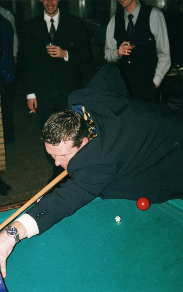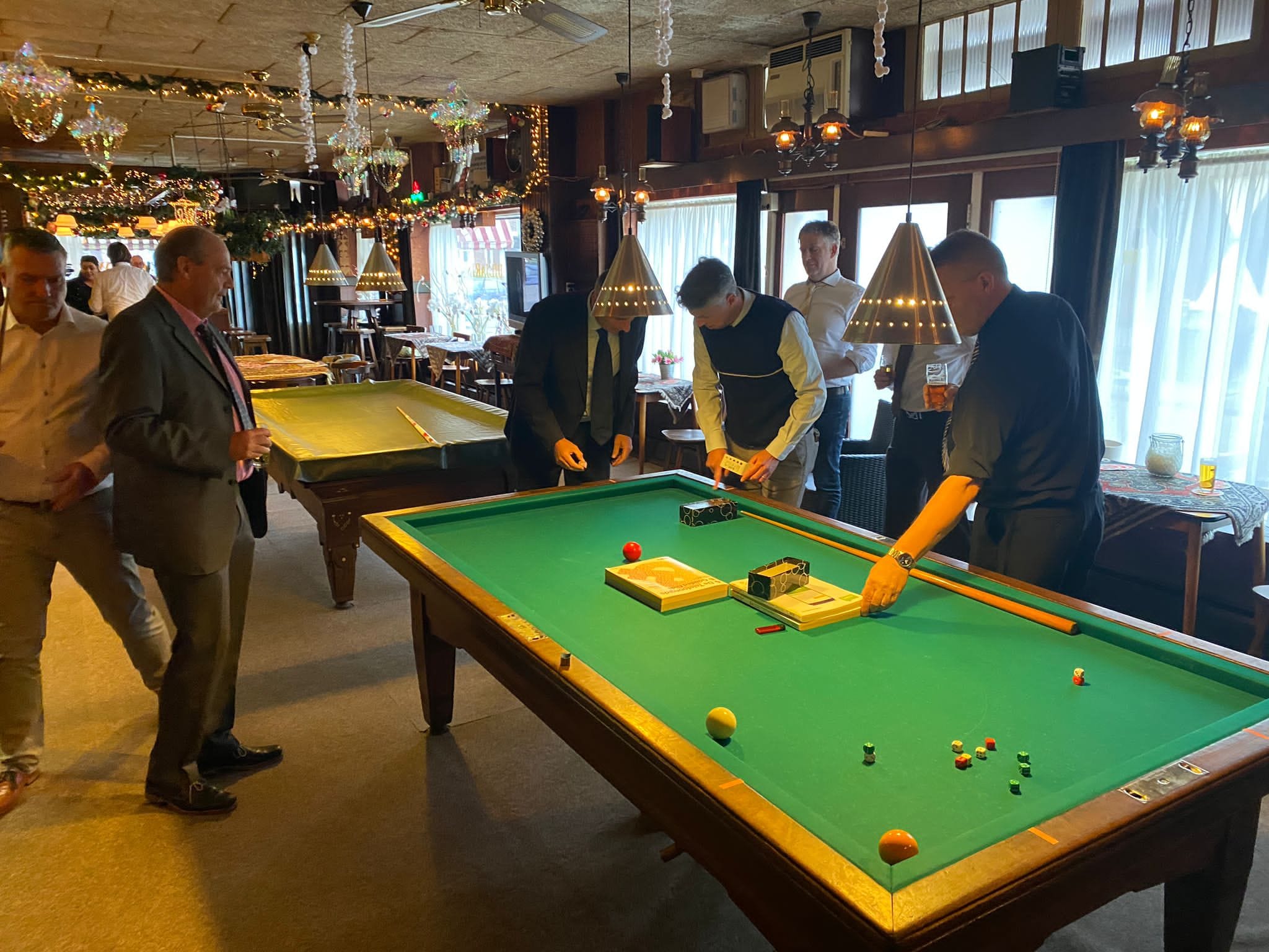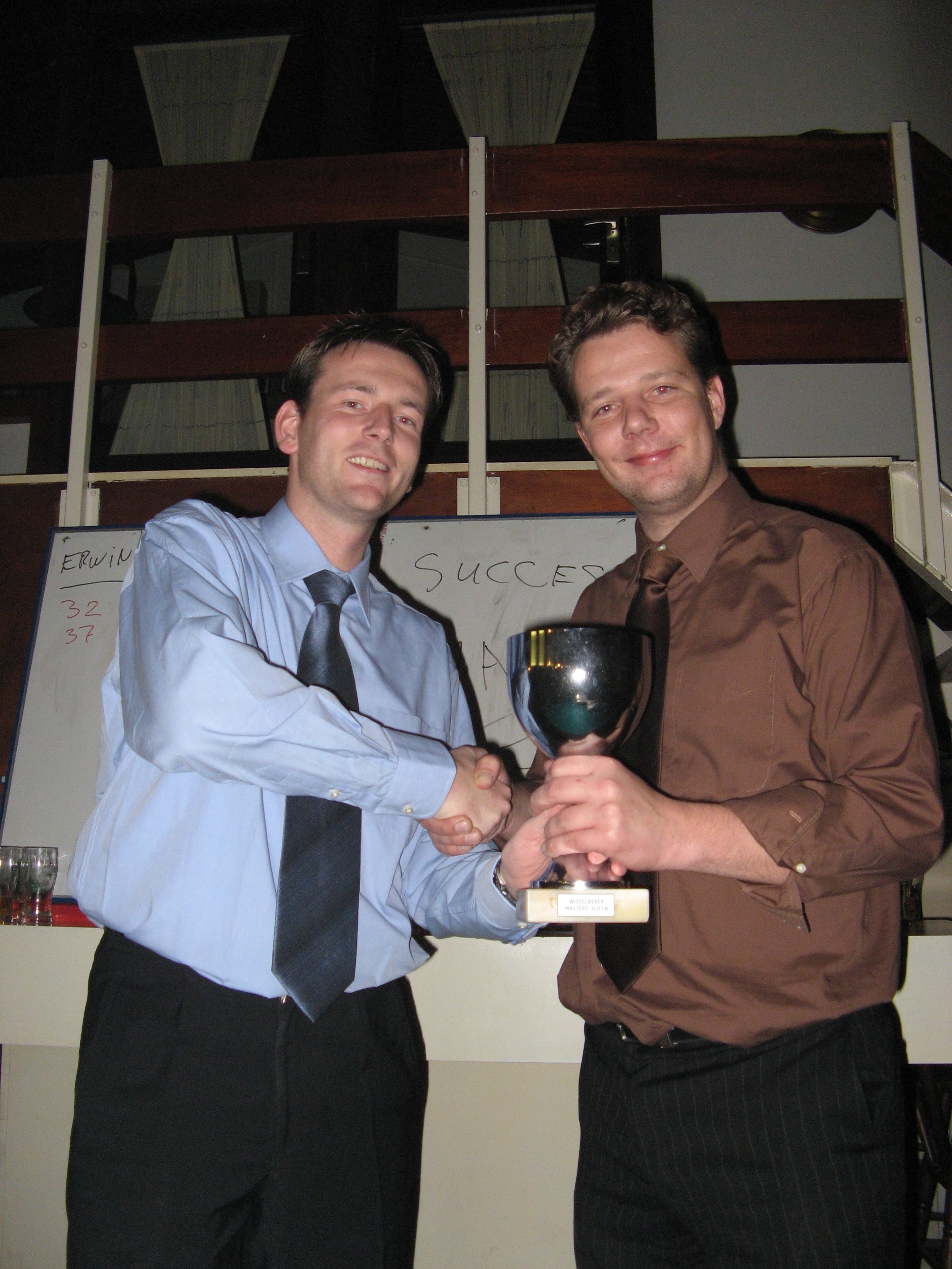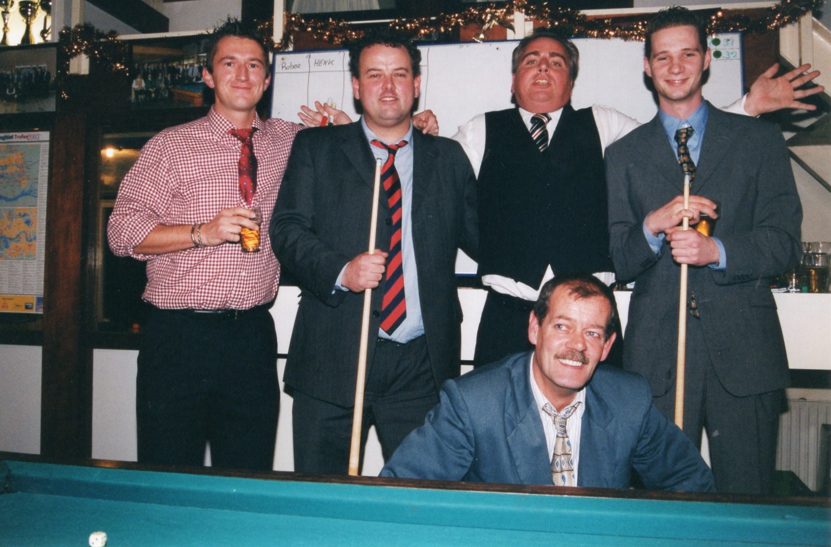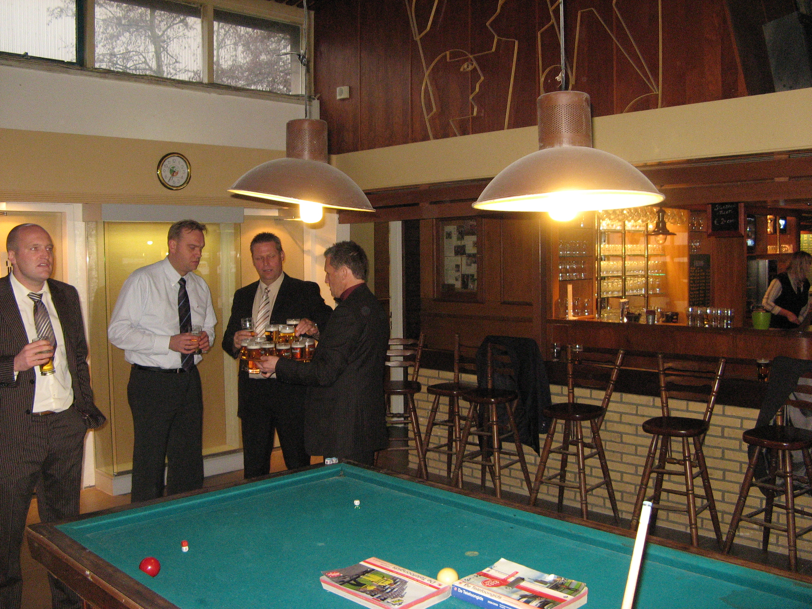 Verdere details zal ik hier niet geven, maar voor de echt geïnteresseerden zijn de spelregels in een heus spelregelboek verzameld en bovendien bent u natuurlijk van harte welkom vlak voor de Kerst. U komt er dan bijvoorbeeld achter dat het zogenaamde scoopen niet verboden is, maar door de echte vijfer verafschuwd wordt. Bij dit scoopen wordt de bal over de boeken “geschept” als er geen eenvoudige lijn naar de rode bal te vinden is. Topvijfers zijn immers niet alleen in staat zelf punten te scoren, maar ook een echte naaibal voor zijn tegenstander achter te laten. De echte vijfer vindt altijd een oplossing al moet hij over vele losse banden en langs de nodige wiebelende dobbelstenen. In dit boek uiteraard ook de spelregel wanneer het spel afgelopen is en nog belangrijker wat dit betekent voor de speler met de laagste score: bier halen voor de overige deelnemers aan het spel! Om geld is gelukkig nog nooit gespeeld. Al snel werd besloten dat er naast het wekelijkse bier eenmaal per jaar om de eer zou worden gespeeld om je een jaar lang de beste “vijfer” van Leonidas te mogen noemen. En laten we niet te bescheiden zijn: beste “vijfer” van Leonidas betekent in de praktijk beste “vijfer” ter wereld. Kortom, in het kader waar u de winnaars van dit jaarlijkse evenement aantreft, leest u eigenlijk een hele rij wereldkampioenen die Leonidas heeft voortgebracht.Zo ontstond, gelijk met de opkomst op tv van het snookeren en hun Masters toernooi, de Leonidas Masters. En hoewel onvergelijkbaar toch ook met een paar opvallende vergelijkbare kenmerken. Zo verschenen er bij de Leonidas Masters plotseling ook de uit het snooker bekende hulpstukken, waarop de speler de keu kon laten rusten als hij met zijn eigen handen onvoldoende kon ondersteunen. En daar waar er in het snooker kwijlend over een maximum break van 147 werd gesproken droomden de vijfers van een “topknol”, een stoot waarbij in 1 keer alle groene dobbelstenen om gingen. Na het overlijden van Hans Hollander, linkerspits van het vijfde, medebedenker van het spel en voor vele vijfers ook op andere vlakken een belangrijke bron van inspiratie, werden de Masters direct als eerbetoon in de “Hollander Masters” omgedoopt.