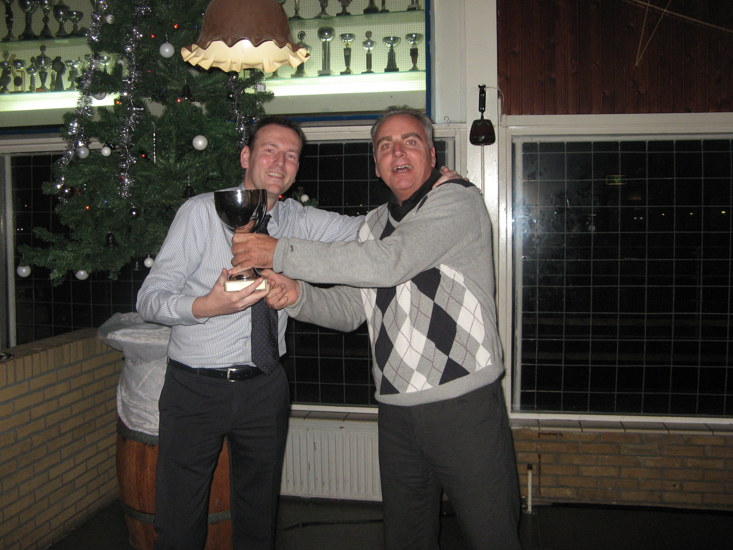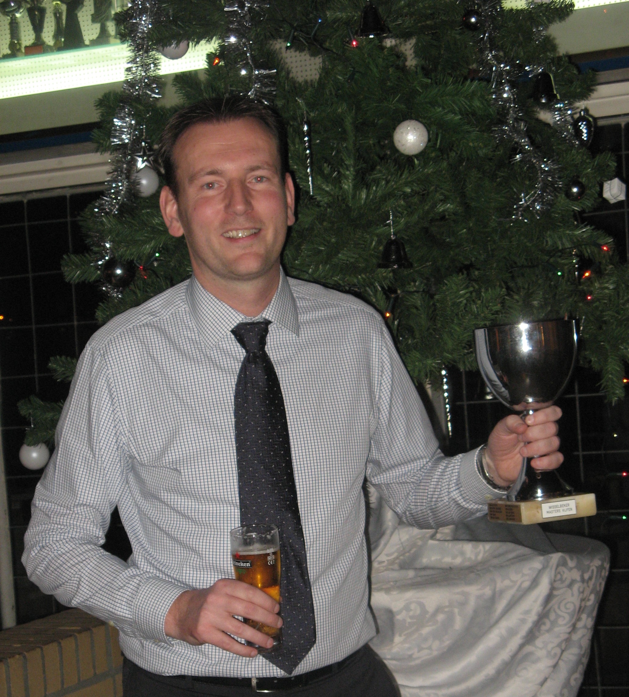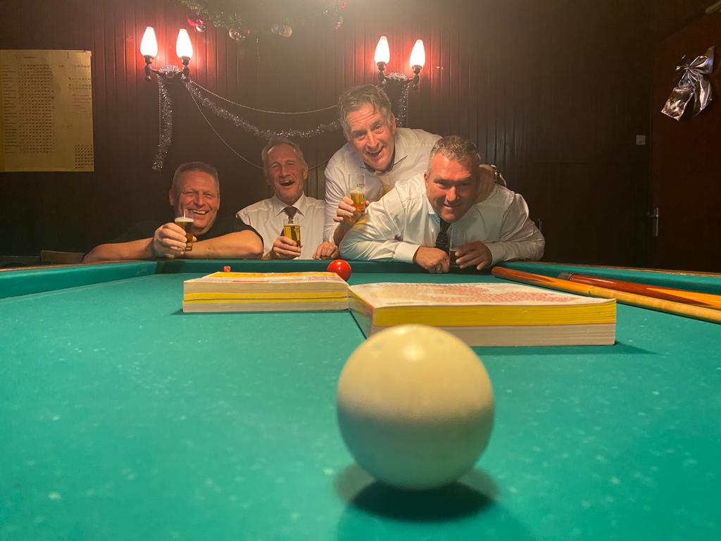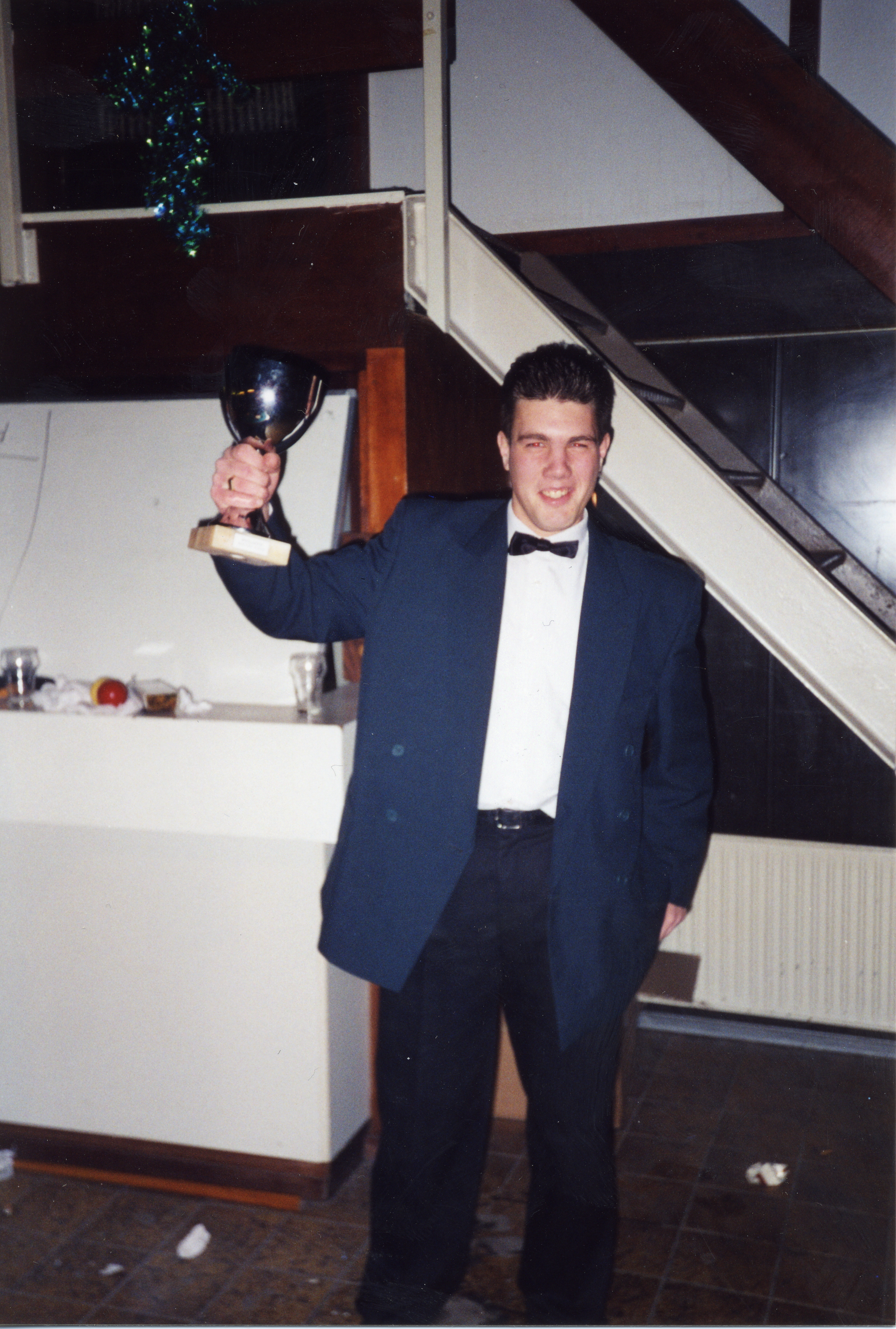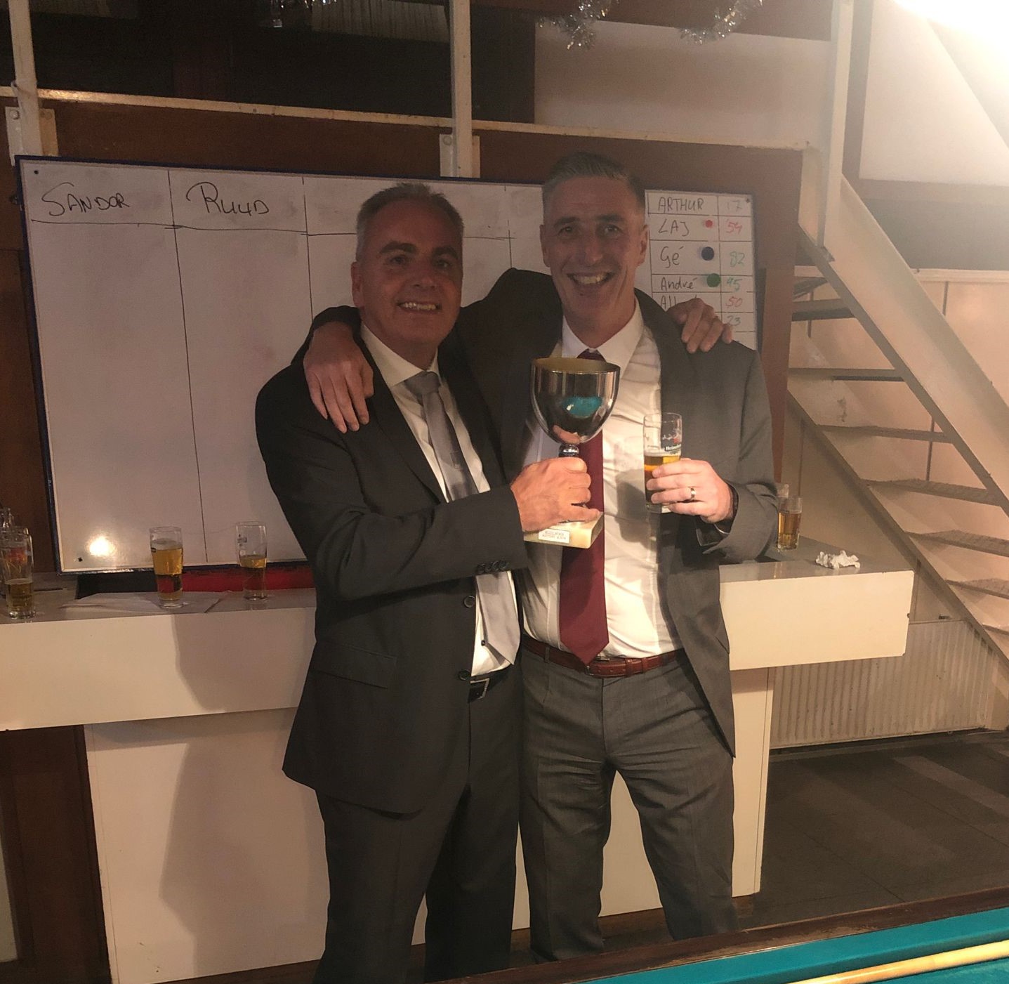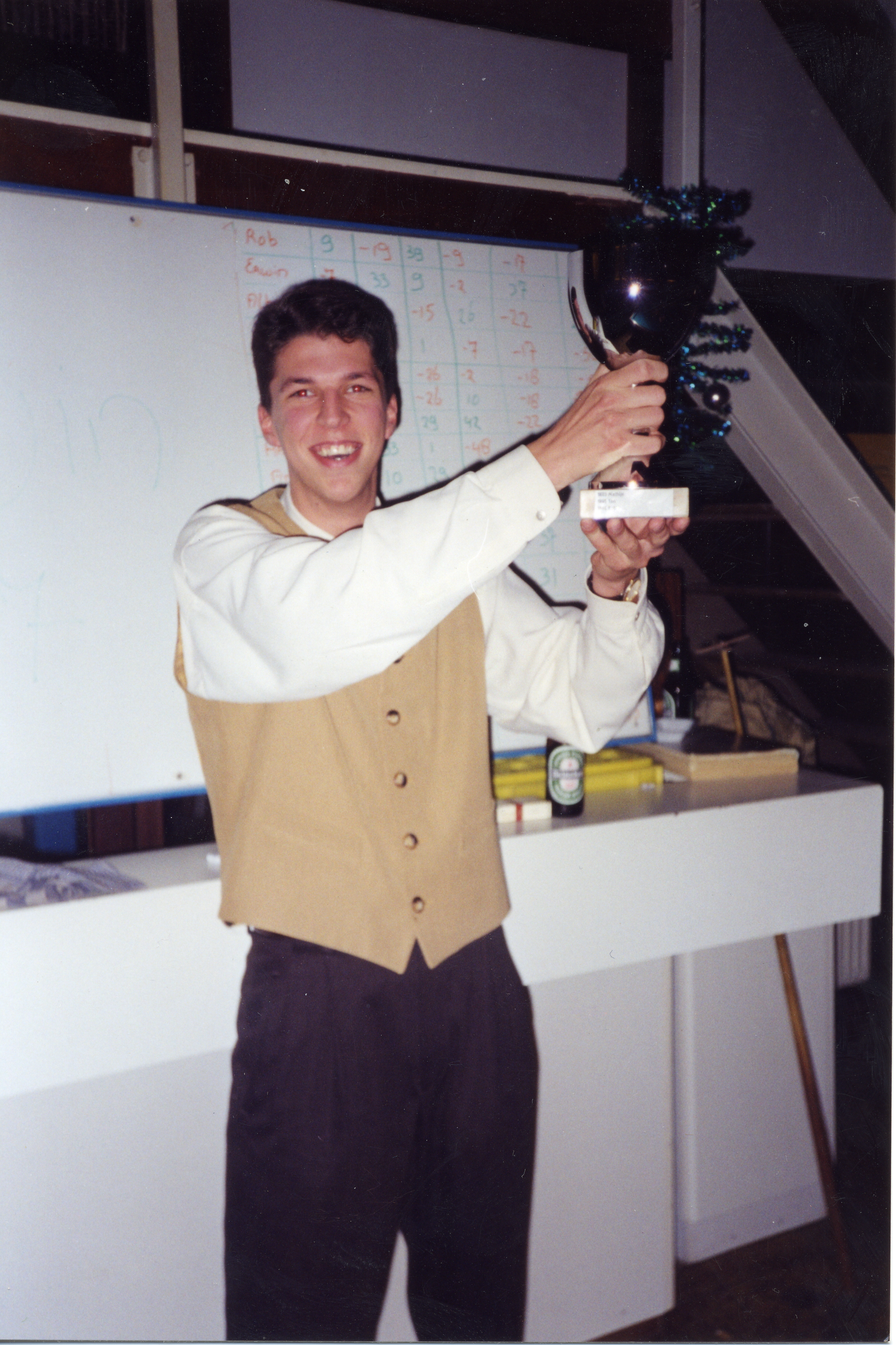Verdere details zal ik hier niet geven, maar voor de echt geïnteresseerden zijn de spelregels in een heus spelregelboek verzameld en bovendien bent u natuurlijk van harte welkom vlak voor de Kerst. U komt er dan bijvoorbeeld achter dat het zogenaamde scoopen niet verboden is, maar door de echte vijfer verafschuwd wordt. Bij dit scoopen wordt de bal over de boeken “geschept” als er geen eenvoudige lijn naar de rode bal te vinden is. Topvijfers zijn immers niet alleen in staat zelf punten te scoren, maar ook een echte naaibal voor zijn tegenstander achter te laten. De echte vijfer vindt altijd een oplossing al moet hij over vele losse banden en langs de nodige wiebelende dobbelstenen. In dit boek uiteraard ook de spelregel wanneer het spel afgelopen is en nog belangrijker wat dit betekent voor de speler met de laagste score: bier halen voor de overige deelnemers aan het spel! Om geld is gelukkig nog nooit gespeeld. Al snel werd besloten dat er naast het wekelijkse bier eenmaal per jaar om de eer zou worden gespeeld om je een jaar lang de beste “vijfer” van Leonidas te mogen noemen. En laten we niet te bescheiden zijn: beste “vijfer” van Leonidas betekent in de praktijk beste “vijfer” ter wereld. Kortom, in het kader waar u de winnaars van dit jaarlijkse evenement aantreft, leest u eigenlijk een hele rij wereldkampioenen die Leonidas heeft voortgebracht.Zo ontstond, gelijk met de opkomst op tv van het snookeren en hun Masters toernooi, de Leonidas Masters. En hoewel onvergelijkbaar toch ook met een paar opvallende vergelijkbare kenmerken. Zo verschenen er bij de Leonidas Masters plotseling ook de uit het snooker bekende hulpstukken, waarop de speler de keu kon laten rusten als hij met zijn eigen handen onvoldoende kon ondersteunen. En daar waar er in het snooker kwijlend over een maximum break van 147 werd gesproken droomden de vijfers van een “topknol”, een stoot waarbij in 1 keer alle groene dobbelstenen om gingen. Na het overlijden van Hans Hollander, linkerspits van het vijfde, medebedenker van het spel en voor vele vijfers ook op andere vlakken een belangrijke bron van inspiratie, werden de Masters direct als eerbetoon in de “Hollander Masters” omgedoopt.