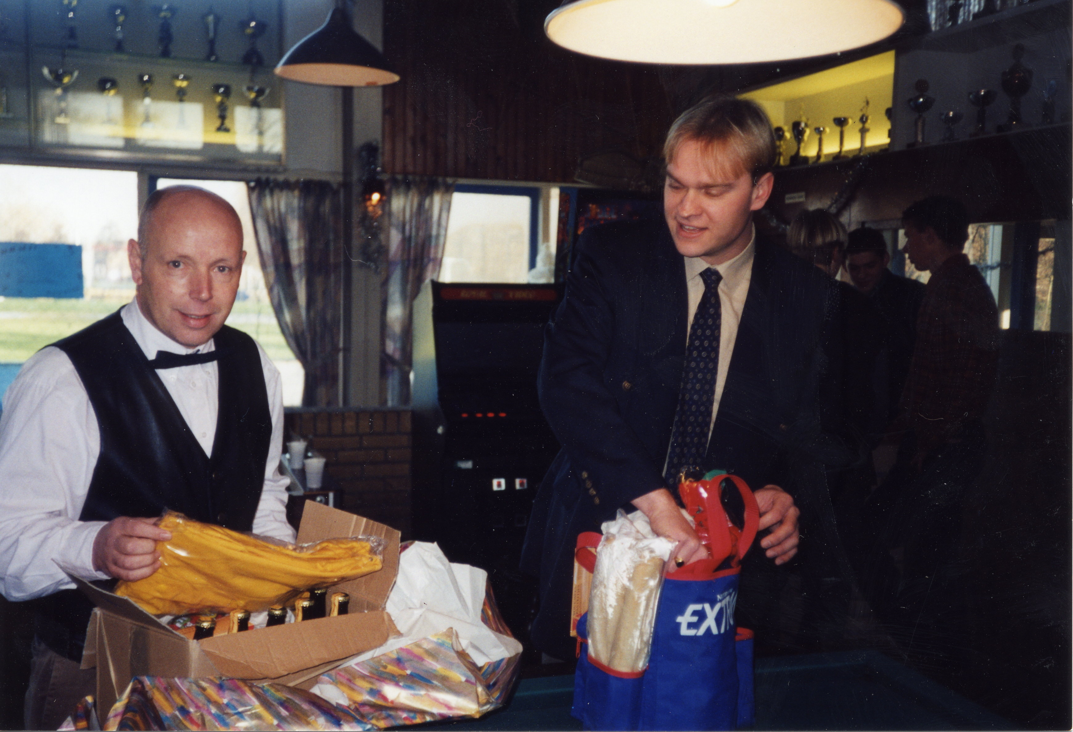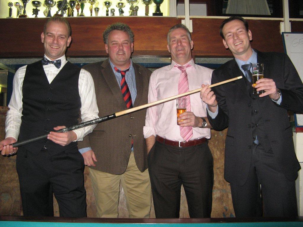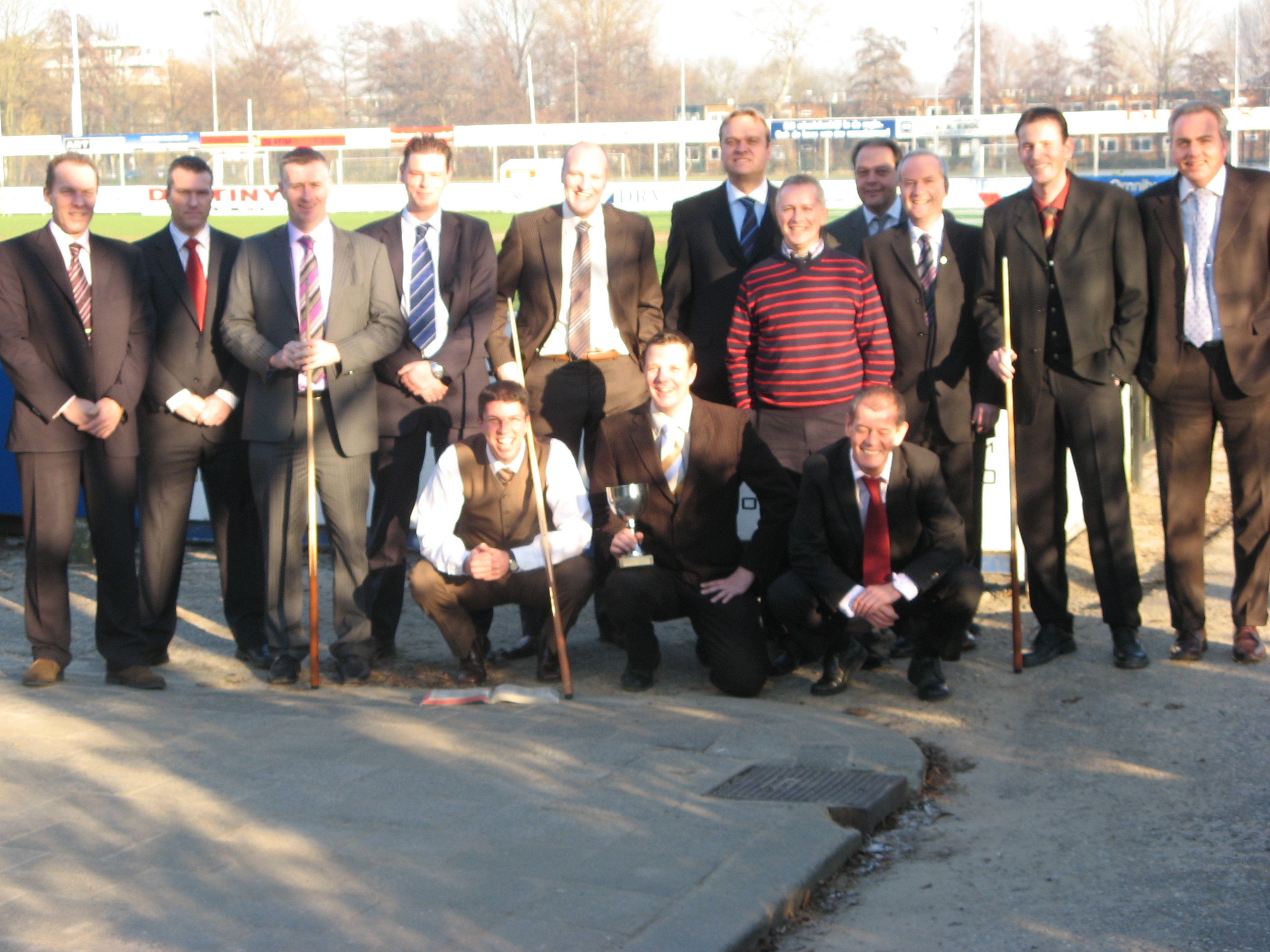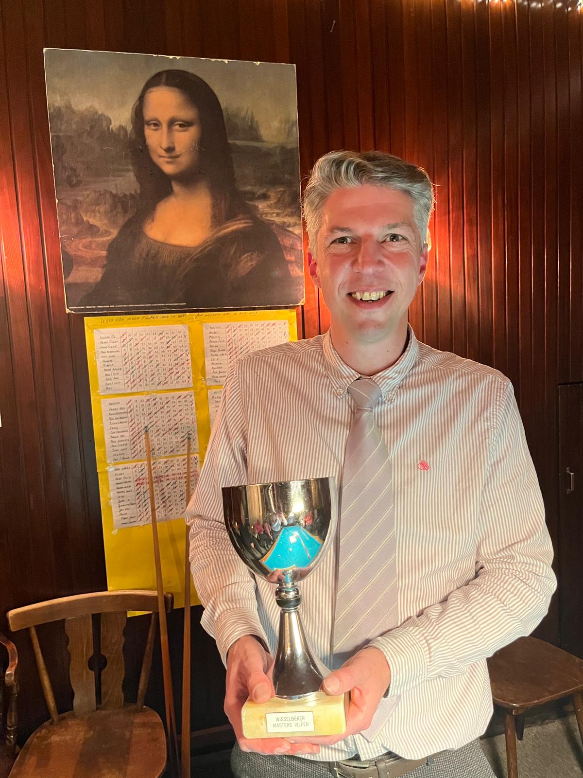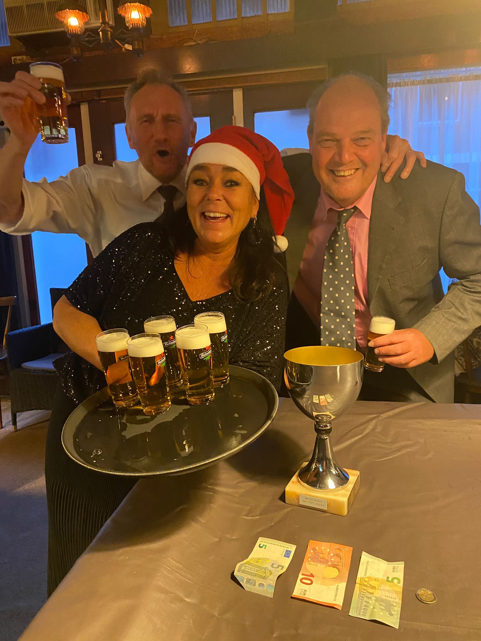 Verdere details zal ik hier niet geven, maar voor de echt geïnteresseerden zijn de spelregels in een heus spelregelboek verzameld en bovendien bent u natuurlijk van harte welkom vlak voor de Kerst. U komt er dan bijvoorbeeld achter dat het zogenaamde scoopen niet verboden is, maar door de echte vijfer verafschuwd wordt. Bij dit scoopen wordt de bal over de boeken “geschept” als er geen eenvoudige lijn naar de rode bal te vinden is. Topvijfers zijn immers niet alleen in staat zelf punten te scoren, maar ook een echte naaibal voor zijn tegenstander achter te laten. De echte vijfer vindt altijd een oplossing al moet hij over vele losse banden en langs de nodige wiebelende dobbelstenen. In dit boek uiteraard ook de spelregel wanneer het spel afgelopen is en nog belangrijker wat dit betekent voor de speler met de laagste score: bier halen voor de overige deelnemers aan het spel! Om geld is gelukkig nog nooit gespeeld. Al snel werd besloten dat er naast het wekelijkse bier eenmaal per jaar om de eer zou worden gespeeld om je een jaar lang de beste “vijfer” van Leonidas te mogen noemen. En laten we niet te bescheiden zijn: beste “vijfer” van Leonidas betekent in de praktijk beste “vijfer” ter wereld. Kortom, in het kader waar u de winnaars van dit jaarlijkse evenement aantreft, leest u eigenlijk een hele rij wereldkampioenen die Leonidas heeft voortgebracht.Zo ontstond, gelijk met de opkomst op tv van het snookeren en hun Masters toernooi, de Leonidas Masters. En hoewel onvergelijkbaar toch ook met een paar opvallende vergelijkbare kenmerken. Zo verschenen er bij de Leonidas Masters plotseling ook de uit het snooker bekende hulpstukken, waarop de speler de keu kon laten rusten als hij met zijn eigen handen onvoldoende kon ondersteunen. En daar waar er in het snooker kwijlend over een maximum break van 147 werd gesproken droomden de vijfers van een “topknol”, een stoot waarbij in 1 keer alle groene dobbelstenen om gingen. Na het overlijden van Hans Hollander, linkerspits van het vijfde, medebedenker van het spel en voor vele vijfers ook op andere vlakken een belangrijke bron van inspiratie, werden de Masters direct als eerbetoon in de “Hollander Masters” omgedoopt.