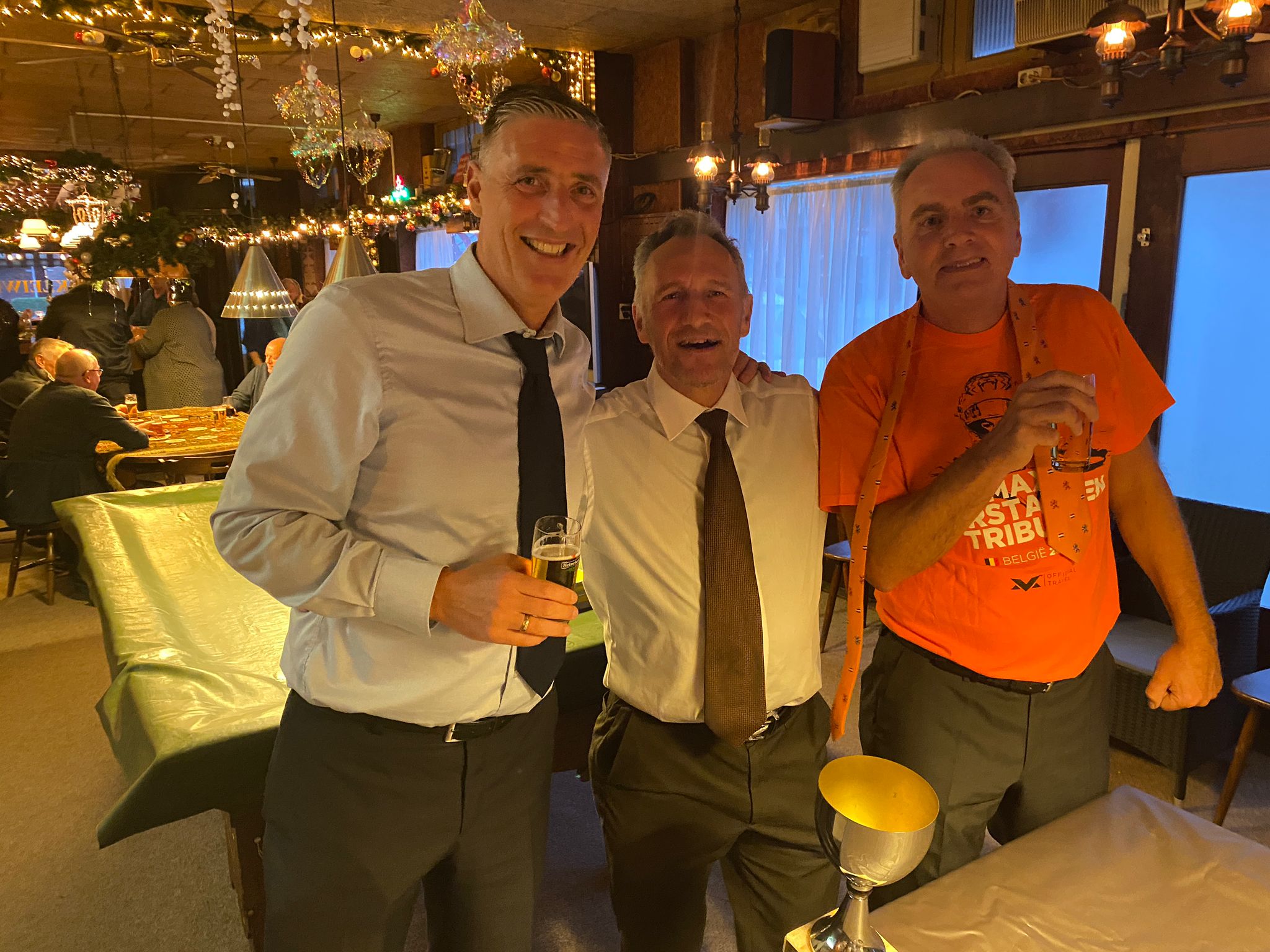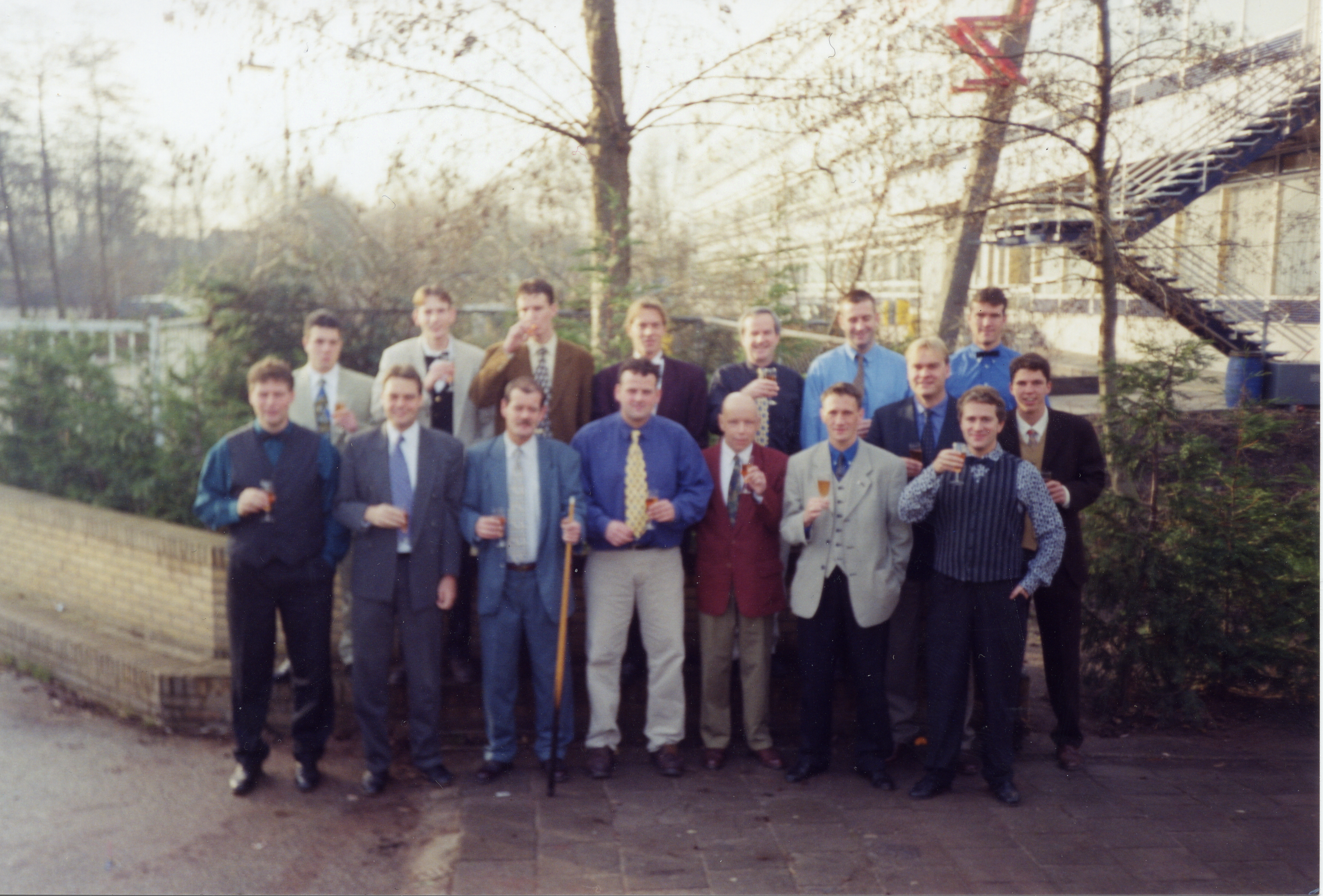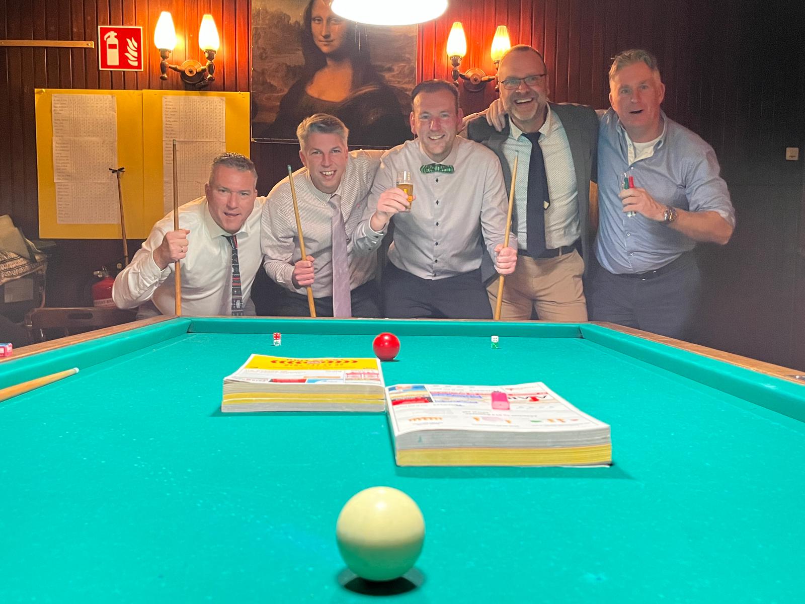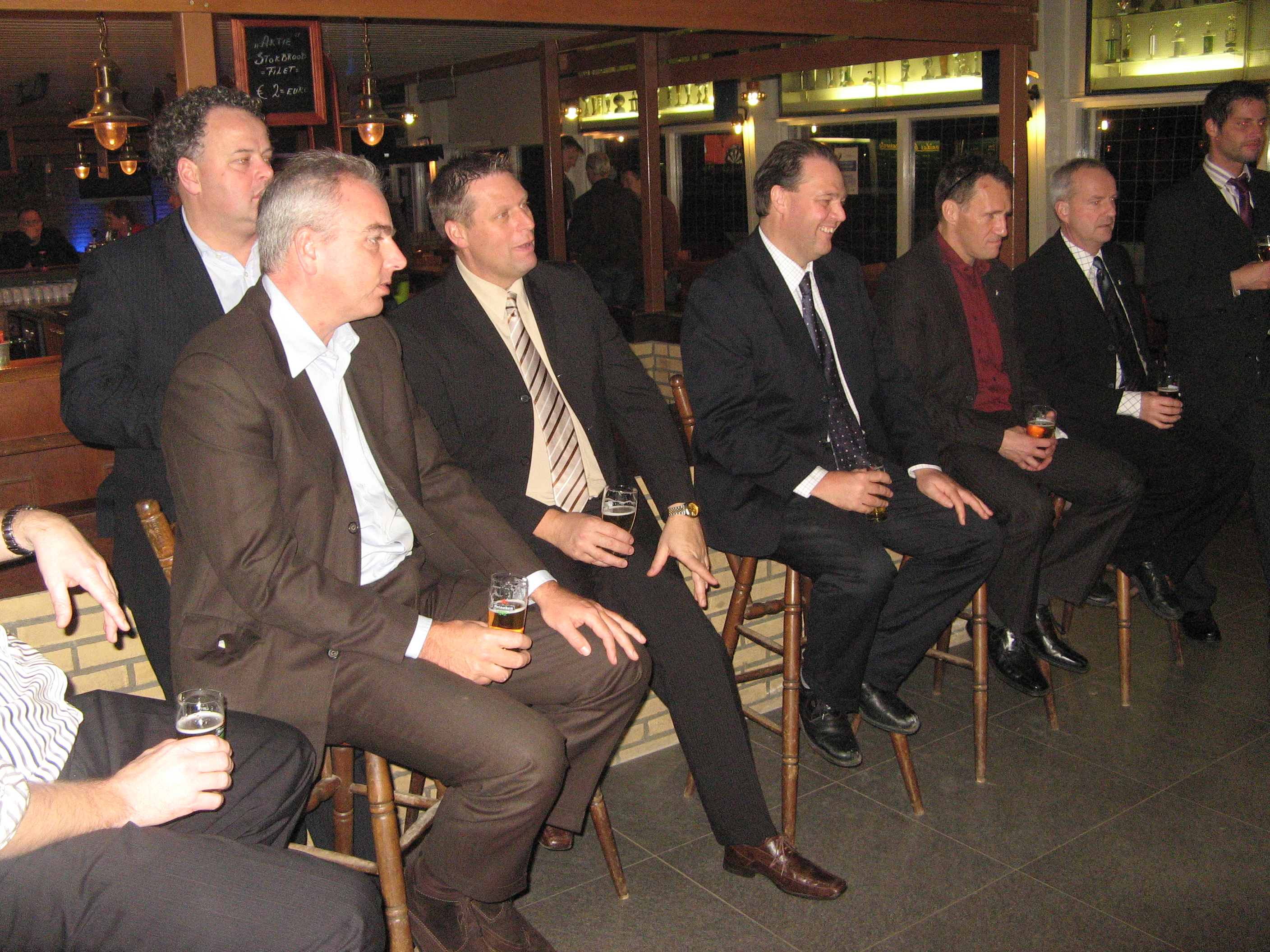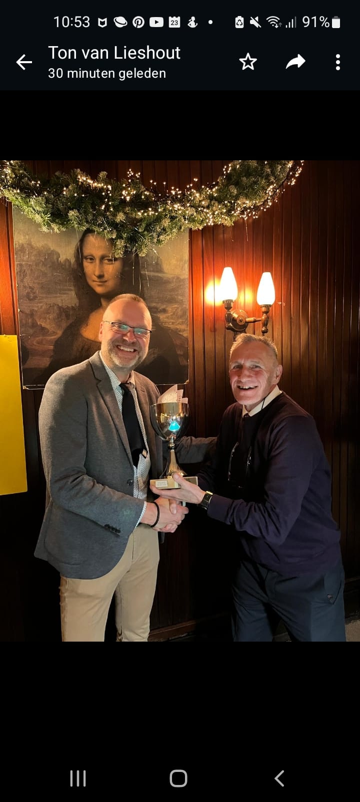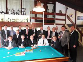 Verdere details zal ik hier niet geven, maar voor de echt geïnteresseerden zijn de spelregels in een heus spelregelboek verzameld en bovendien bent u natuurlijk van harte welkom vlak voor de Kerst. U komt er dan bijvoorbeeld achter dat het zogenaamde scoopen niet verboden is, maar door de echte vijfer verafschuwd wordt. Bij dit scoopen wordt de bal over de boeken “geschept” als er geen eenvoudige lijn naar de rode bal te vinden is. Topvijfers zijn immers niet alleen in staat zelf punten te scoren, maar ook een echte naaibal voor zijn tegenstander achter te laten. De echte vijfer vindt altijd een oplossing al moet hij over vele losse banden en langs de nodige wiebelende dobbelstenen. In dit boek uiteraard ook de spelregel wanneer het spel afgelopen is en nog belangrijker wat dit betekent voor de speler met de laagste score: bier halen voor de overige deelnemers aan het spel! Om geld is gelukkig nog nooit gespeeld. Al snel werd besloten dat er naast het wekelijkse bier eenmaal per jaar om de eer zou worden gespeeld om je een jaar lang de beste “vijfer” van Leonidas te mogen noemen. En laten we niet te bescheiden zijn: beste “vijfer” van Leonidas betekent in de praktijk beste “vijfer” ter wereld. Kortom, in het kader waar u de winnaars van dit jaarlijkse evenement aantreft, leest u eigenlijk een hele rij wereldkampioenen die Leonidas heeft voortgebracht.Zo ontstond, gelijk met de opkomst op tv van het snookeren en hun Masters toernooi, de Leonidas Masters. En hoewel onvergelijkbaar toch ook met een paar opvallende vergelijkbare kenmerken. Zo verschenen er bij de Leonidas Masters plotseling ook de uit het snooker bekende hulpstukken, waarop de speler de keu kon laten rusten als hij met zijn eigen handen onvoldoende kon ondersteunen. En daar waar er in het snooker kwijlend over een maximum break van 147 werd gesproken droomden de vijfers van een “topknol”, een stoot waarbij in 1 keer alle groene dobbelstenen om gingen. Na het overlijden van Hans Hollander, linkerspits van het vijfde, medebedenker van het spel en voor vele vijfers ook op andere vlakken een belangrijke bron van inspiratie, werden de Masters direct als eerbetoon in de “Hollander Masters” omgedoopt.