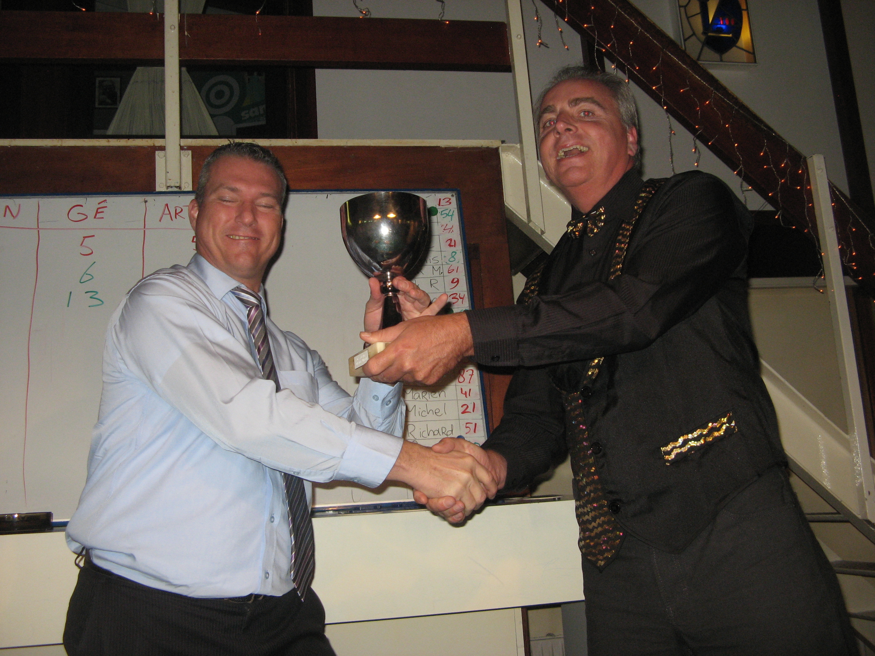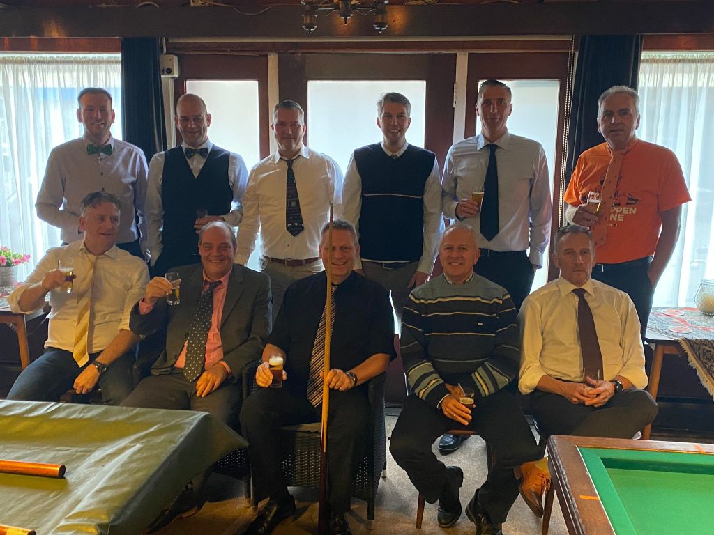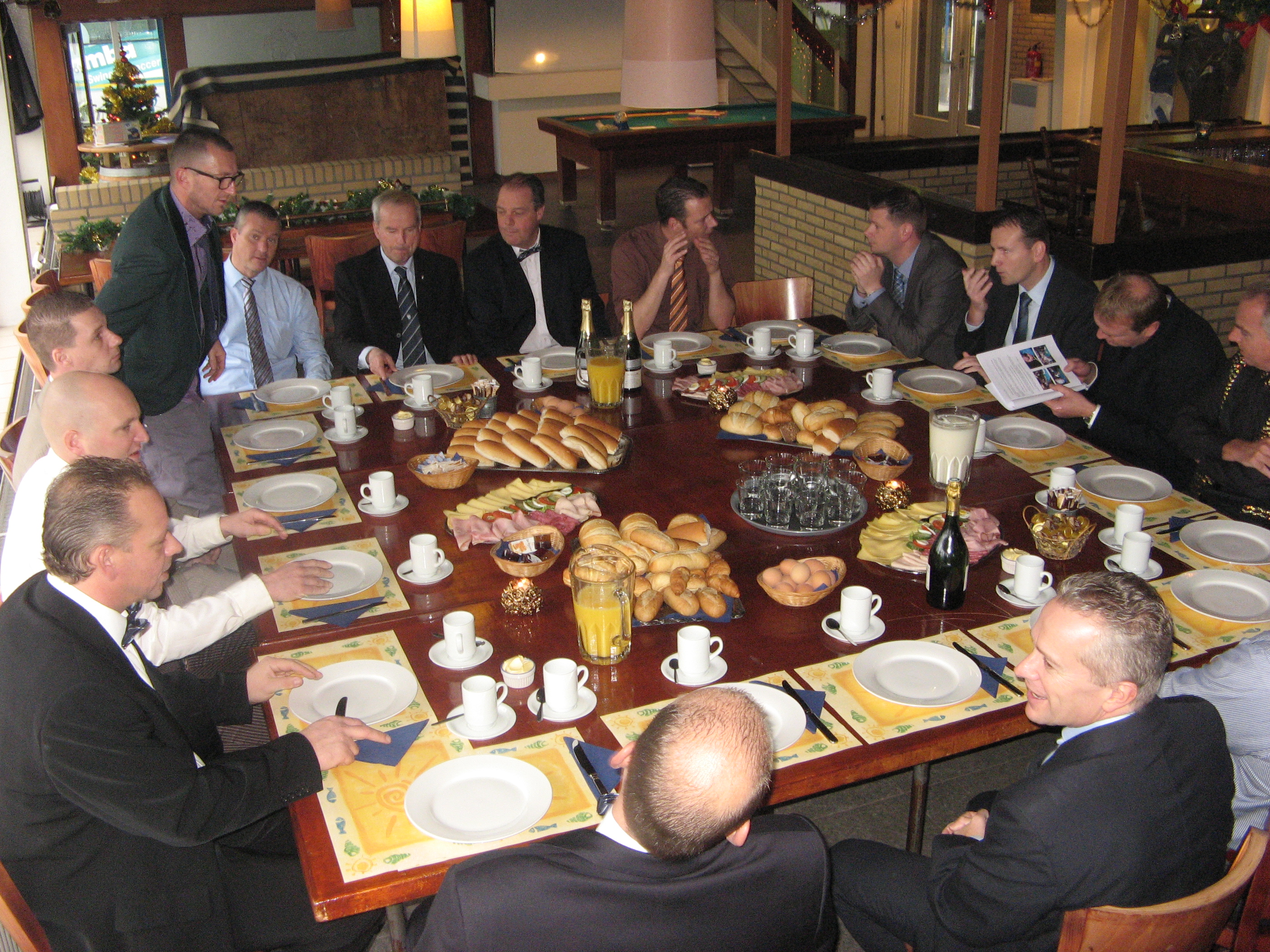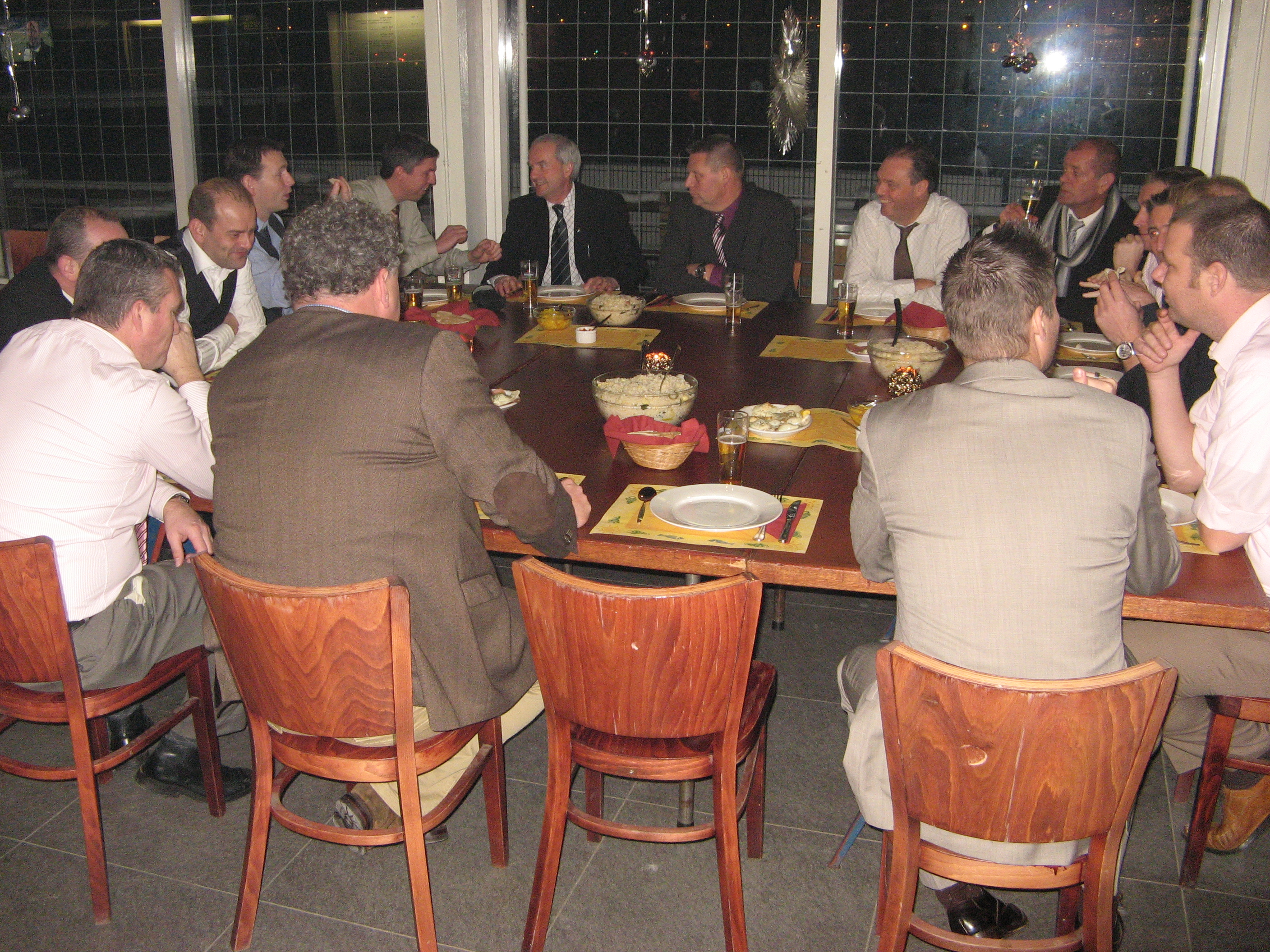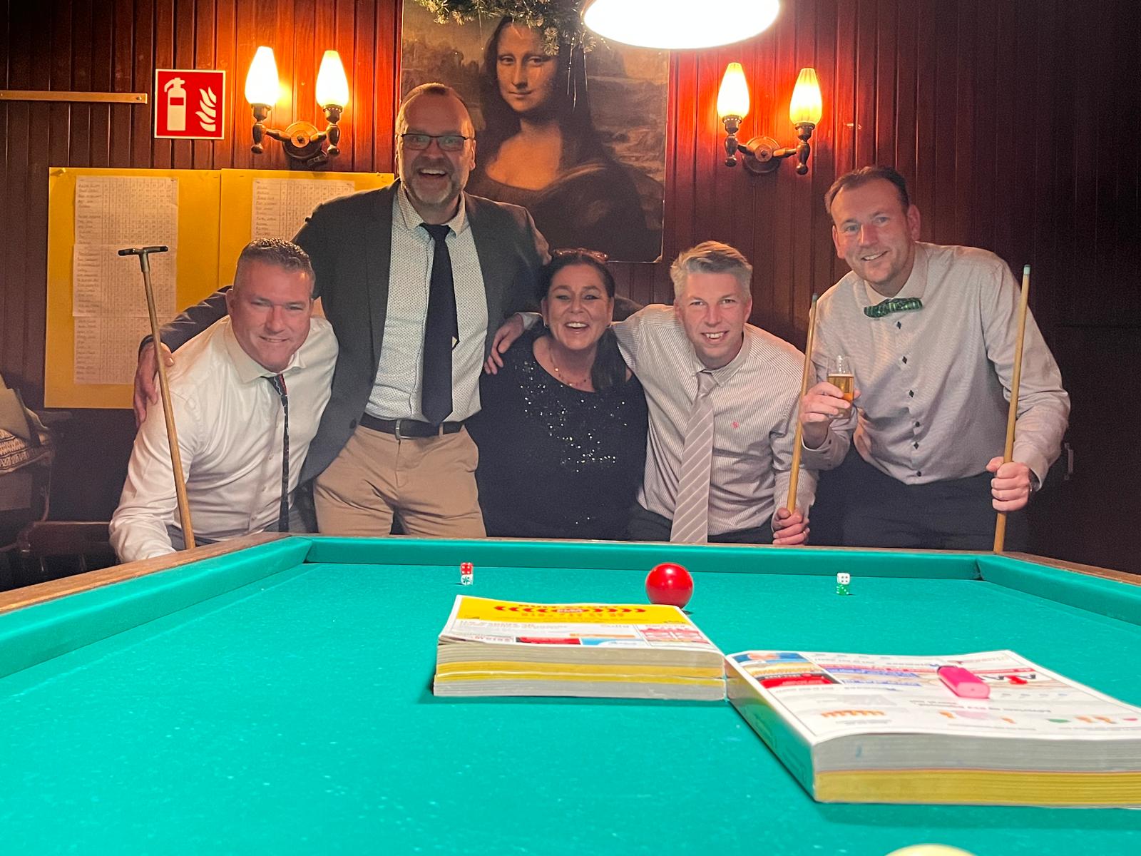 Verdere details zal ik hier niet geven, maar voor de echt geïnteresseerden zijn de spelregels in een heus spelregelboek verzameld en bovendien bent u natuurlijk van harte welkom vlak voor de Kerst. U komt er dan bijvoorbeeld achter dat het zogenaamde scoopen niet verboden is, maar door de echte vijfer verafschuwd wordt. Bij dit scoopen wordt de bal over de boeken “geschept” als er geen eenvoudige lijn naar de rode bal te vinden is. Topvijfers zijn immers niet alleen in staat zelf punten te scoren, maar ook een echte naaibal voor zijn tegenstander achter te laten. De echte vijfer vindt altijd een oplossing al moet hij over vele losse banden en langs de nodige wiebelende dobbelstenen. In dit boek uiteraard ook de spelregel wanneer het spel afgelopen is en nog belangrijker wat dit betekent voor de speler met de laagste score: bier halen voor de overige deelnemers aan het spel! Om geld is gelukkig nog nooit gespeeld. Al snel werd besloten dat er naast het wekelijkse bier eenmaal per jaar om de eer zou worden gespeeld om je een jaar lang de beste “vijfer” van Leonidas te mogen noemen. En laten we niet te bescheiden zijn: beste “vijfer” van Leonidas betekent in de praktijk beste “vijfer” ter wereld. Kortom, in het kader waar u de winnaars van dit jaarlijkse evenement aantreft, leest u eigenlijk een hele rij wereldkampioenen die Leonidas heeft voortgebracht.Zo ontstond, gelijk met de opkomst op tv van het snookeren en hun Masters toernooi, de Leonidas Masters. En hoewel onvergelijkbaar toch ook met een paar opvallende vergelijkbare kenmerken. Zo verschenen er bij de Leonidas Masters plotseling ook de uit het snooker bekende hulpstukken, waarop de speler de keu kon laten rusten als hij met zijn eigen handen onvoldoende kon ondersteunen. En daar waar er in het snooker kwijlend over een maximum break van 147 werd gesproken droomden de vijfers van een “topknol”, een stoot waarbij in 1 keer alle groene dobbelstenen om gingen. Na het overlijden van Hans Hollander, linkerspits van het vijfde, medebedenker van het spel en voor vele vijfers ook op andere vlakken een belangrijke bron van inspiratie, werden de Masters direct als eerbetoon in de “Hollander Masters” omgedoopt.