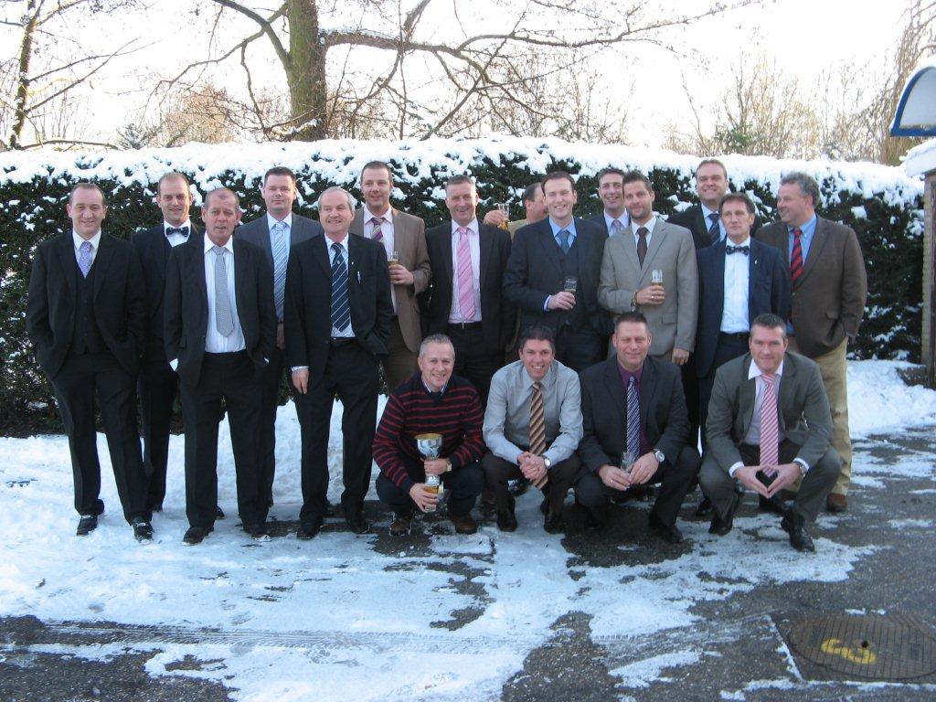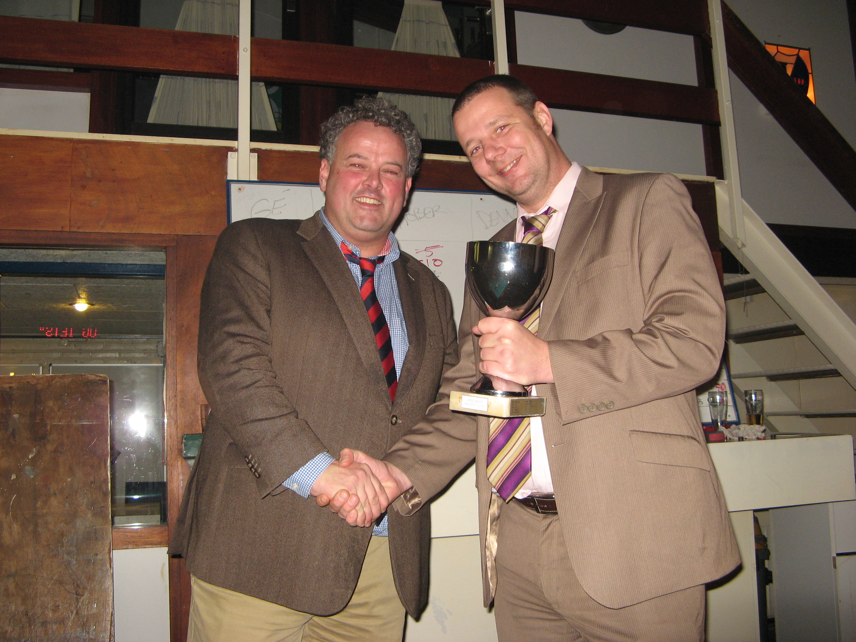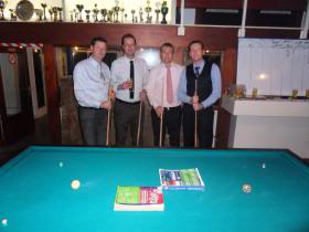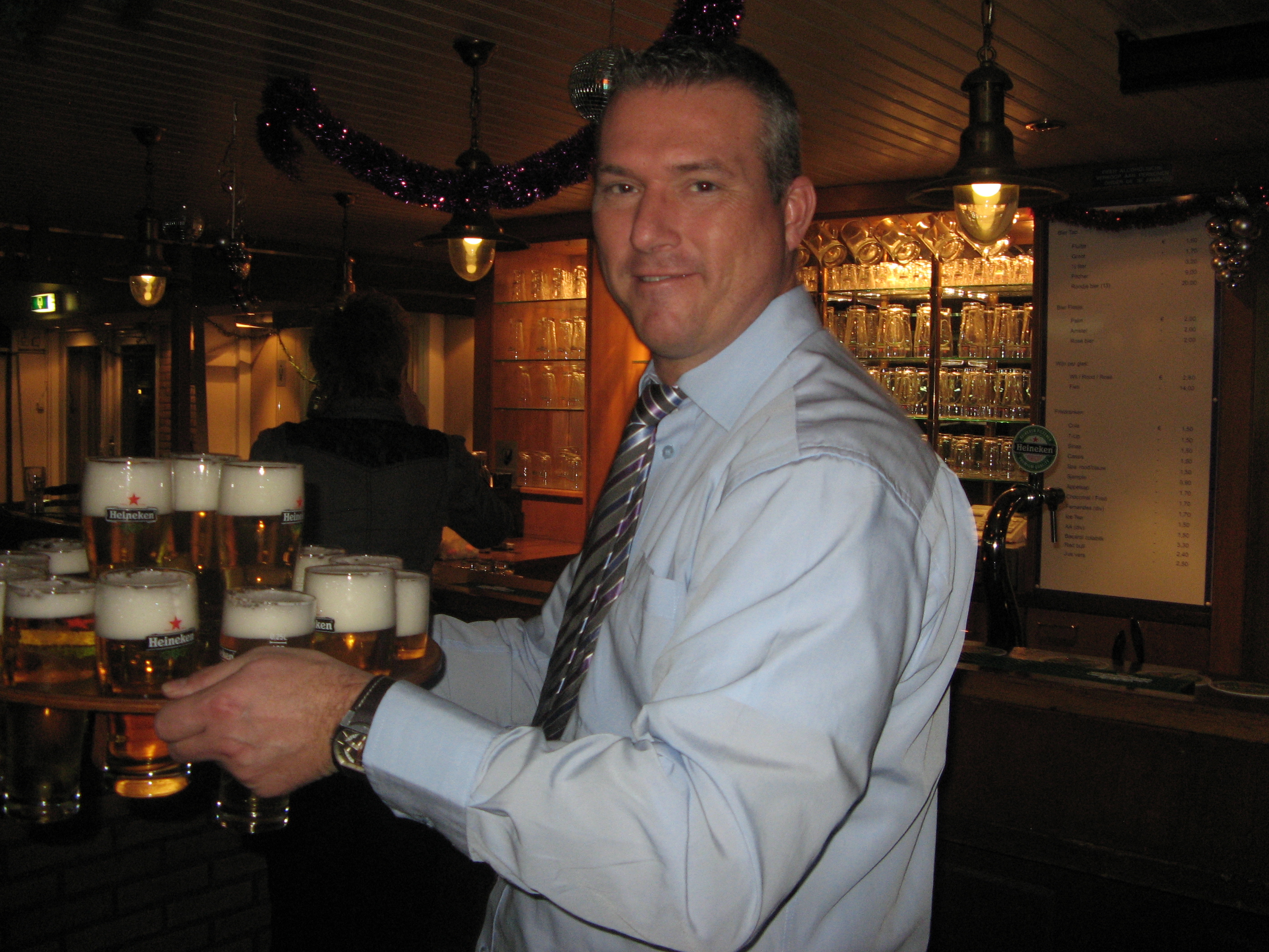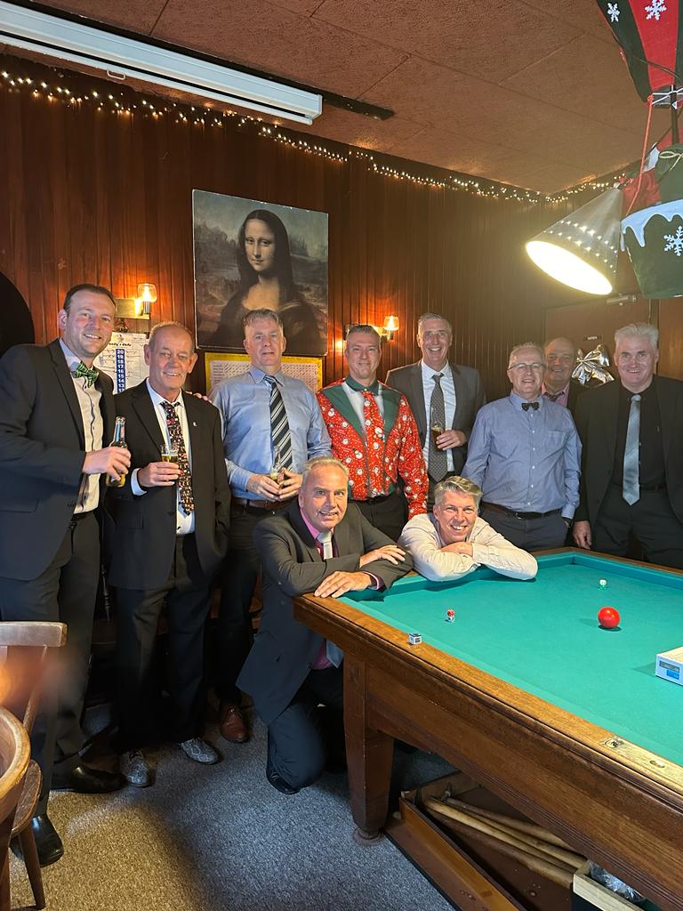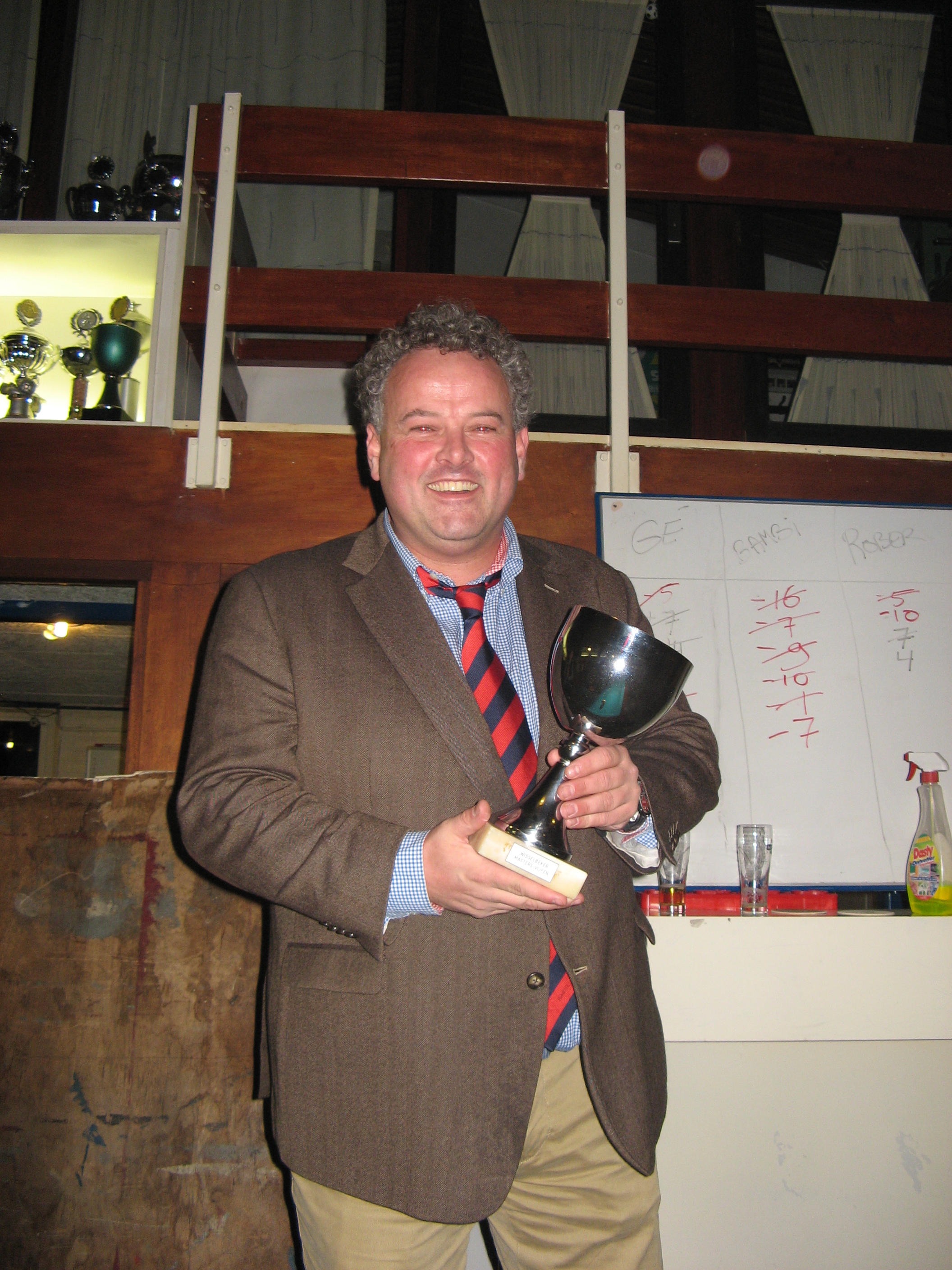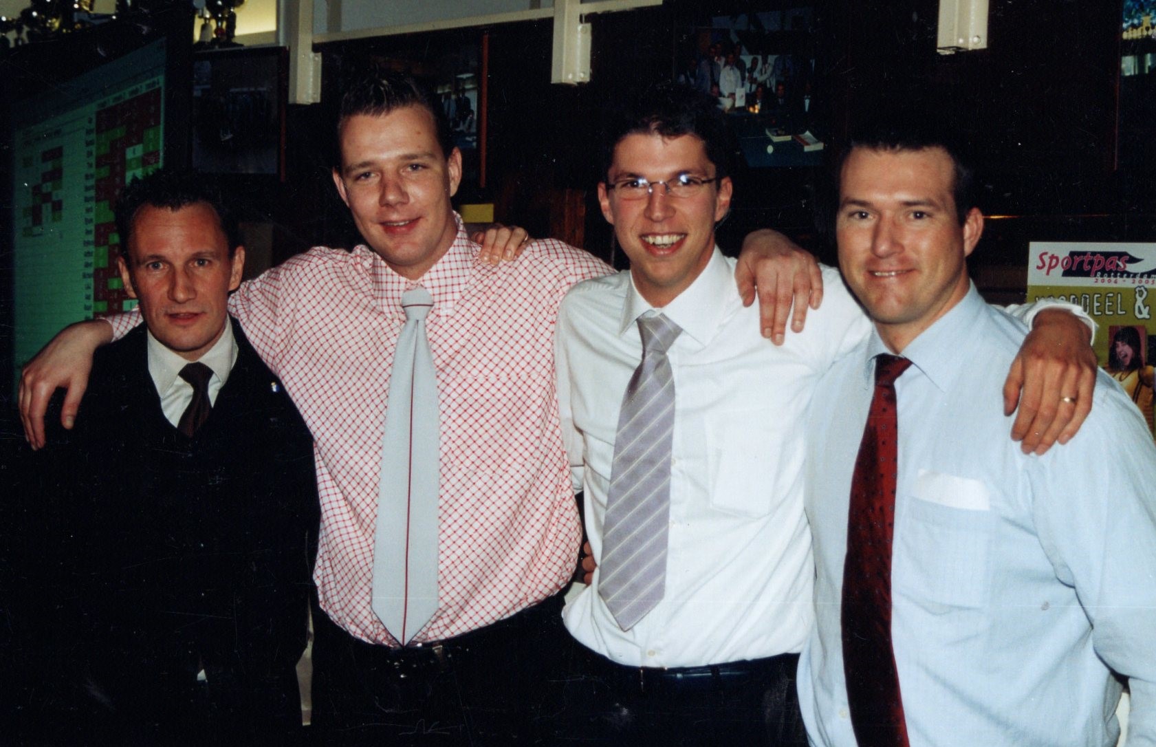 Verdere details zal ik hier niet geven, maar voor de echt geïnteresseerden zijn de spelregels in een heus spelregelboek verzameld en bovendien bent u natuurlijk van harte welkom vlak voor de Kerst. U komt er dan bijvoorbeeld achter dat het zogenaamde scoopen niet verboden is, maar door de echte vijfer verafschuwd wordt. Bij dit scoopen wordt de bal over de boeken “geschept” als er geen eenvoudige lijn naar de rode bal te vinden is. Topvijfers zijn immers niet alleen in staat zelf punten te scoren, maar ook een echte naaibal voor zijn tegenstander achter te laten. De echte vijfer vindt altijd een oplossing al moet hij over vele losse banden en langs de nodige wiebelende dobbelstenen. In dit boek uiteraard ook de spelregel wanneer het spel afgelopen is en nog belangrijker wat dit betekent voor de speler met de laagste score: bier halen voor de overige deelnemers aan het spel! Om geld is gelukkig nog nooit gespeeld. Al snel werd besloten dat er naast het wekelijkse bier eenmaal per jaar om de eer zou worden gespeeld om je een jaar lang de beste “vijfer” van Leonidas te mogen noemen. En laten we niet te bescheiden zijn: beste “vijfer” van Leonidas betekent in de praktijk beste “vijfer” ter wereld. Kortom, in het kader waar u de winnaars van dit jaarlijkse evenement aantreft, leest u eigenlijk een hele rij wereldkampioenen die Leonidas heeft voortgebracht.Zo ontstond, gelijk met de opkomst op tv van het snookeren en hun Masters toernooi, de Leonidas Masters. En hoewel onvergelijkbaar toch ook met een paar opvallende vergelijkbare kenmerken. Zo verschenen er bij de Leonidas Masters plotseling ook de uit het snooker bekende hulpstukken, waarop de speler de keu kon laten rusten als hij met zijn eigen handen onvoldoende kon ondersteunen. En daar waar er in het snooker kwijlend over een maximum break van 147 werd gesproken droomden de vijfers van een “topknol”, een stoot waarbij in 1 keer alle groene dobbelstenen om gingen. Na het overlijden van Hans Hollander, linkerspits van het vijfde, medebedenker van het spel en voor vele vijfers ook op andere vlakken een belangrijke bron van inspiratie, werden de Masters direct als eerbetoon in de “Hollander Masters” omgedoopt.