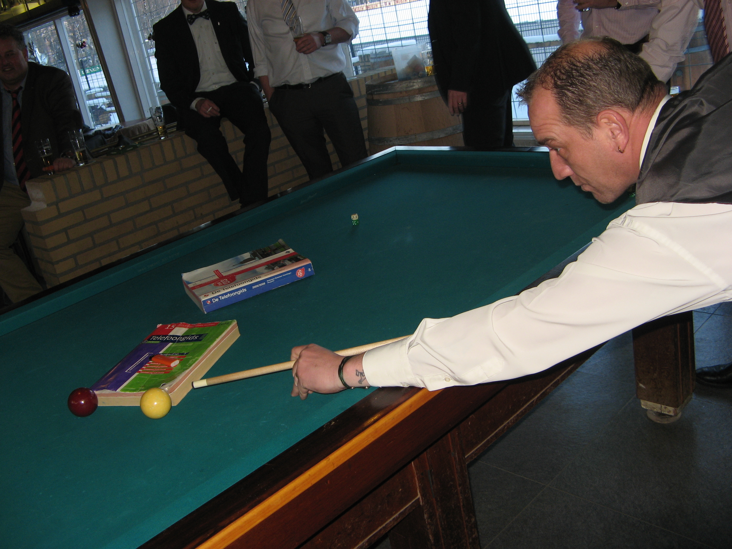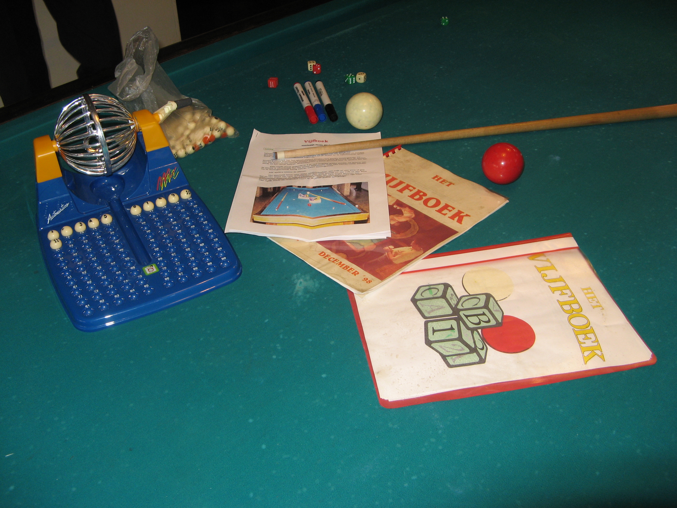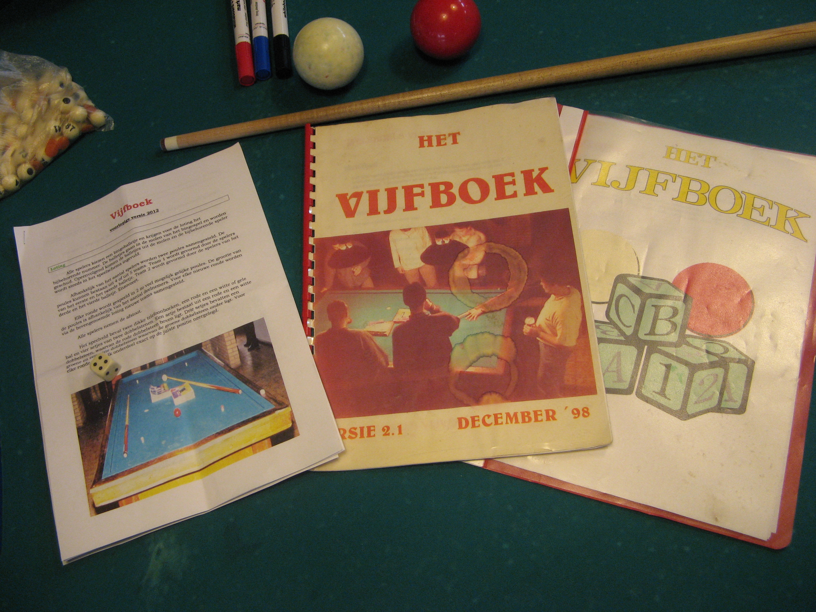 Computergames passen niet bij deze generatie, dus er werd gezocht naar een innovatieve oplossing. Een gezamenlijke creatieve innovatiesessie was het gevolg. Bij dit soort processen is het altijd onduidelijk op welke moment de oplossing exact komt bovendrijven en al helemaal is onduidelijk wie nu verantwoordelijk is voor het beslissende zetje in de juiste richting. Onbelangrijk , als het resultaat er uiteindelijk maar is. En met dat resultaat zat het wel goed: een nieuwe spelsoort in het biljarten was geboren: het vijfen, uiteraard een verwijzing naar het elftal waar vrijwel alle bedenkers in speelden of zich in ieder geval nauw verwant mee voelden. De eerste keren werd er tijdens het spel nog wat aan de spelregels gesleuteld, maar de basisregels lagen eigenlijk al heel snel vast. De eerste basisregel is vrij eenvoudig: met de witte bal moet de rode bal geraakt worden, waarbij net als bij het reguliere biljarten de keu als stootmiddel dienst doet. De echte vijfers zullen het woord keu overigens in dit kader nooit gebruiken. Zoals de echte golfers het niet over stokken maar over clubs hebben zo heeft de vijfer het over prikstok in plaats van keu. De gebruikelijke gele bal ontbreekt volledig in het spel. Wel zo overzichtelijk! Maar in ruil daarvoor worden wel twee telefoonboeken in het centrum van het biljart geplaatst. Bij het niet raken van de witte bal worden strafpunten uitgedeeld. Daarnaast worden in de 4 hoeken van het biljart dobbelstenen opgesteld: groene dobbelstenen voor pluspunten, waarbij het wel een voorwaarde is eerst de rode bal te raken en een rode dobbelsteen voor minscores.