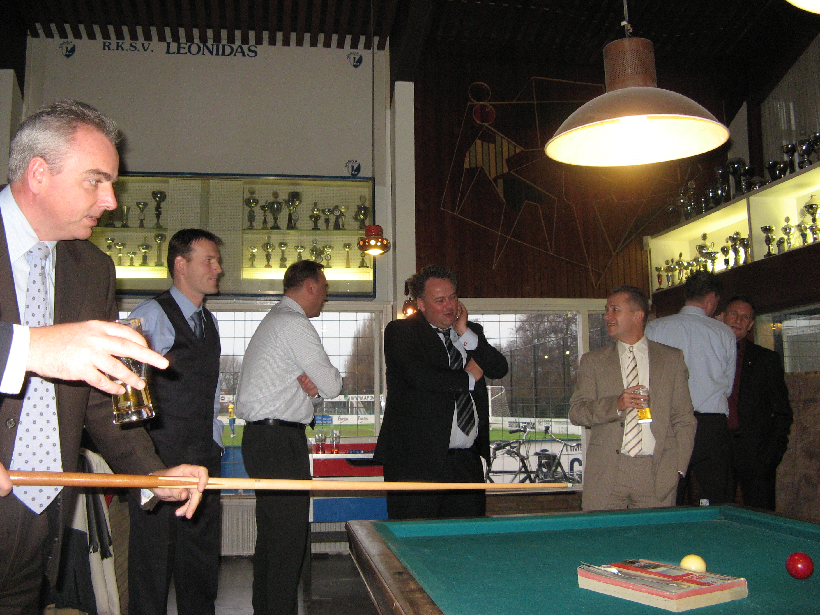 Iedereen die op de laatste zaterdag voor Kerst niets vermoedend de kantine aan het Erasmuspad binnenliep zal met zichzelf de afspraak gemaakt hebben voortaan wat minder diep in het glaasje te kijken. Je denkt echt je persoonlijk promillagemaximum bereikt te hebben als je geconfronteerd wordt met zestien mannen, in pak inclusief stropdas of vlinderdas, met gezamenlijk pakweg 500 jaar Leonidasgeschiedenis, die als wilden rond een biljart staan te schreeuwen. Een scene waar Man bijt Hond of Showroom prachtige kijkcijfers mee scoort. Na een paar maal flink doorademen en een paar bakken sterke koffie blijkt het allemaal enorm mee te vallen. Je verstandelijke vermogens zijn in het geheel nog niet door de drank aangetast. Wat zich voor je ogen afspeelt is één van de best bewaarde tradities die de vereniging Leonidas nog rijk is. Een beetje verrassend is het wel: een traditie die niet op voetbalgras, maar op een biljartlaken plaats vindt. De eerste aflevering van deze Hollander Masters Vijfen dateert uit 1991 en heeft natuurlijk wel een ontstaansgeschiedenis vanuit het voetbal.
