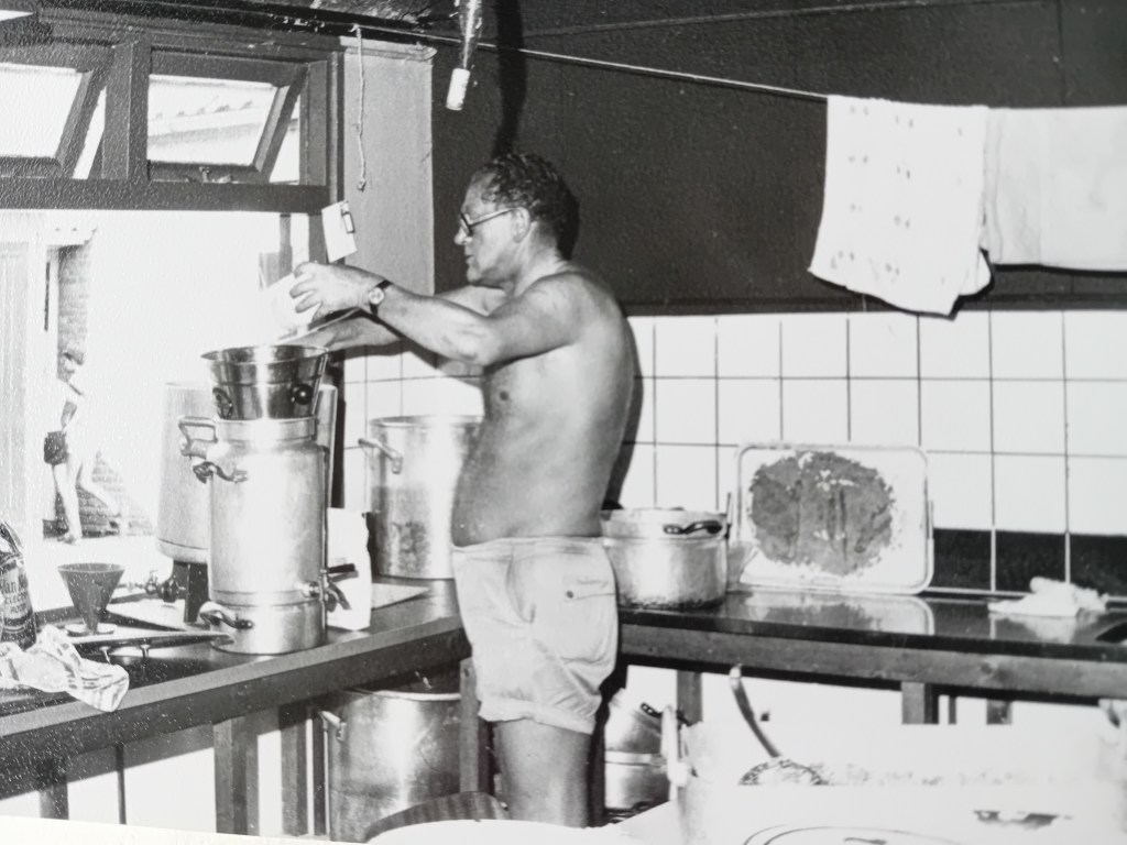 Het kamp misschien al vergeten? Nou, ik niet. Acht weken na het kamp vragen ze of je zo goed wil zijn een verslag te schrijven. Ben er dan maar es effe voor gaan zitten. ’s Zaterdags was het koffertjes brengen en ’s middags op naar het kamphuis. Als laatste vertrok ik van Leonidas. Het was maar goed ook want ze hadden panne, wie is niet belangrijk. Meegenomen naar een benzineboer en het euvel was vlug opgelost. Zij togen op eigen kracht naar het kamphuis. ’s Avonds hadden we de H. Mis. Er kwam een pater uit Oosterhout. In zijn voorwoordje had hij het over het samenzijn, veel geven en nemen vond hij wel zeer belangrijk. Tevens sprak hij over het feest van de komende zondag. Op de vraag van welk feest er nog iets mee te maken had kwam het antwoord: kerstmis. Zondag begon de kompetitie. Het was weer stof (vr)eten. De temperaturen bereikten ook een hoogte van zo’n 30 graden (beter weer dan op mijn vakantie). ’s Middags gingen we met z’n allen naar het zwembad. Daar was het bier best. De leiders konden daar wat van. Een ober had net weer een blad gebracht of er was weer de vraag van “ober, tien bier!” Ik wil helemaal geen namen noemen maar P. Ahs. Kon er wel mee overweg.