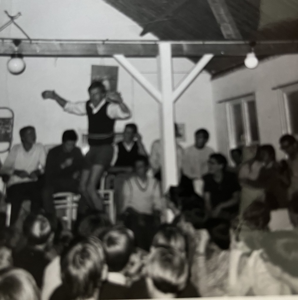 Na het avondeten gingen de heren aan de bosspelen beginnen. En aan één ding hadden we de p……: zaklantaarns! Degenen die volgend jaar bij een bosspel een zaklantaarn meenemen, gaan onherroepelijk onder de plomp. Moe door het gerèn legde men zich te ruste. Te ruste? Laat me niet lachen, het feest begon nu pas goed. Pyjama’s die in bomen waren gehangen, moesten worden opgespoord, op scherp gezette bedden weer vastgezet en deuren werden aan elkaar gebonden. ’s Morgens vond men dan van de bewuste deur de deurknop. Naar andermans kamertje lopen was een andere sport.