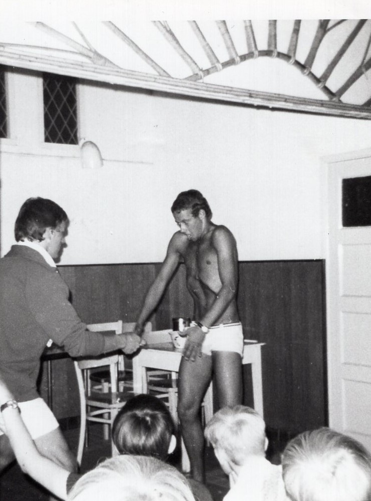 Verder de middagen. Jongens, wat een feest was dat! Iedere middag werd een bezoek gebracht aan De Warande zodat moeders in paniek hun dochters bij elkaar trommelden om gezamenlijk tegen Leonidas’ oudsten opgewassen te zijn. Wat zijn ze weer aktief geweest, maar ja, daar waren ze te kus(sen) en te keur en dat heb je niet iedere week. Ook werd even het akolietenkollege van RK Deo, versterkt met Leonidasakolieten Aad en Frans opgerold. Er waren er die het water zo lekker vonden dat ze meenden dit de badmeesteres niet te mogen onthouden. Drijfnat toog ze met versterking de kwajongens achterna, tevergeefs echter.