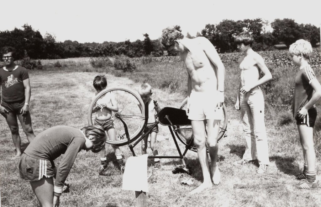 Na drie voorvergaderingen van hoofdmeneer Th. Holtgrefe en zijn sekondanten c.q. leiders over de verdeling van de taken, werd het 7 juli, de dag van vertrek. Om half negen, de afgesproken tijd, stond Rob met zijn vrachtwagen voor en werd deze in een rekordtijd geladen. Tevens zat daar op zijn vertrouwde plekje van de zon te genieten (wat boft deze man de laatste jaren) de heer Thijssen, die op de hem vertrouwde manier namen aankruiste en labels verstrekte, welke aan de koffers werden bevestigd, dit in verband met de algehele chaos op het kamp. Wij willen hem hiervoor nog hartelijk bedanken, reeds. Cees, Albert en Ed in zijn Feyenoordtrui vertrokken al om half tien. Laatstgenoemde had de dag ervoor een feest gehad, stom natuurlijk met zo’n gestel en dit had dan ook desastreuze gevolgen. Na enkele cols en tussensprints kwam hij de man met de Heineken-hamer tegen en dit bleek Ton Kokkeler te zijn. Uncle Tom nam de fiets van Ed over en eindelijk lagen ze en keer niet achter op het tijdschema. Ed stapte in de bezemwagen van Kees-Jan en vervolgde zo zijn weg naar het kamp. ’s Avonds hadden wij het bosspel van Ed en Albert, geheten éénendertigen. Het spel zat goed in elkaar (hoe is het mogelijk met een Kokkeler erbij!) doch de afstanden waren meer weggelegd voor Jos Hermens.